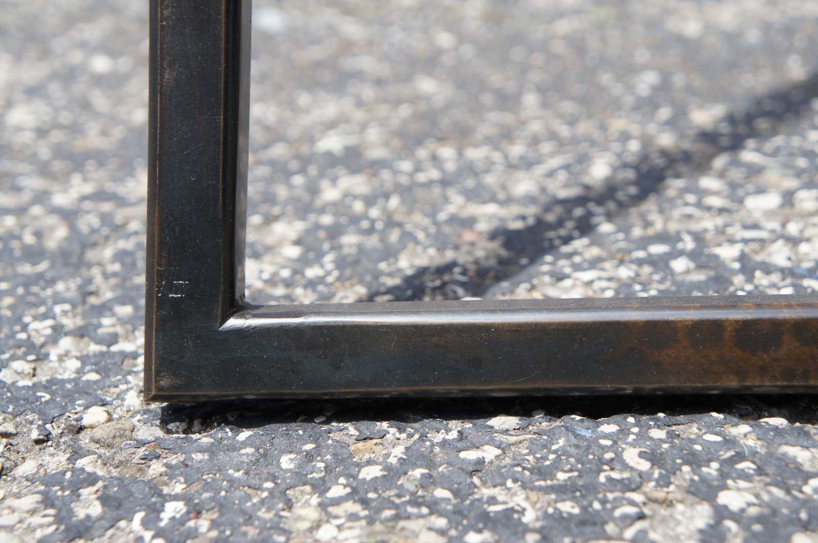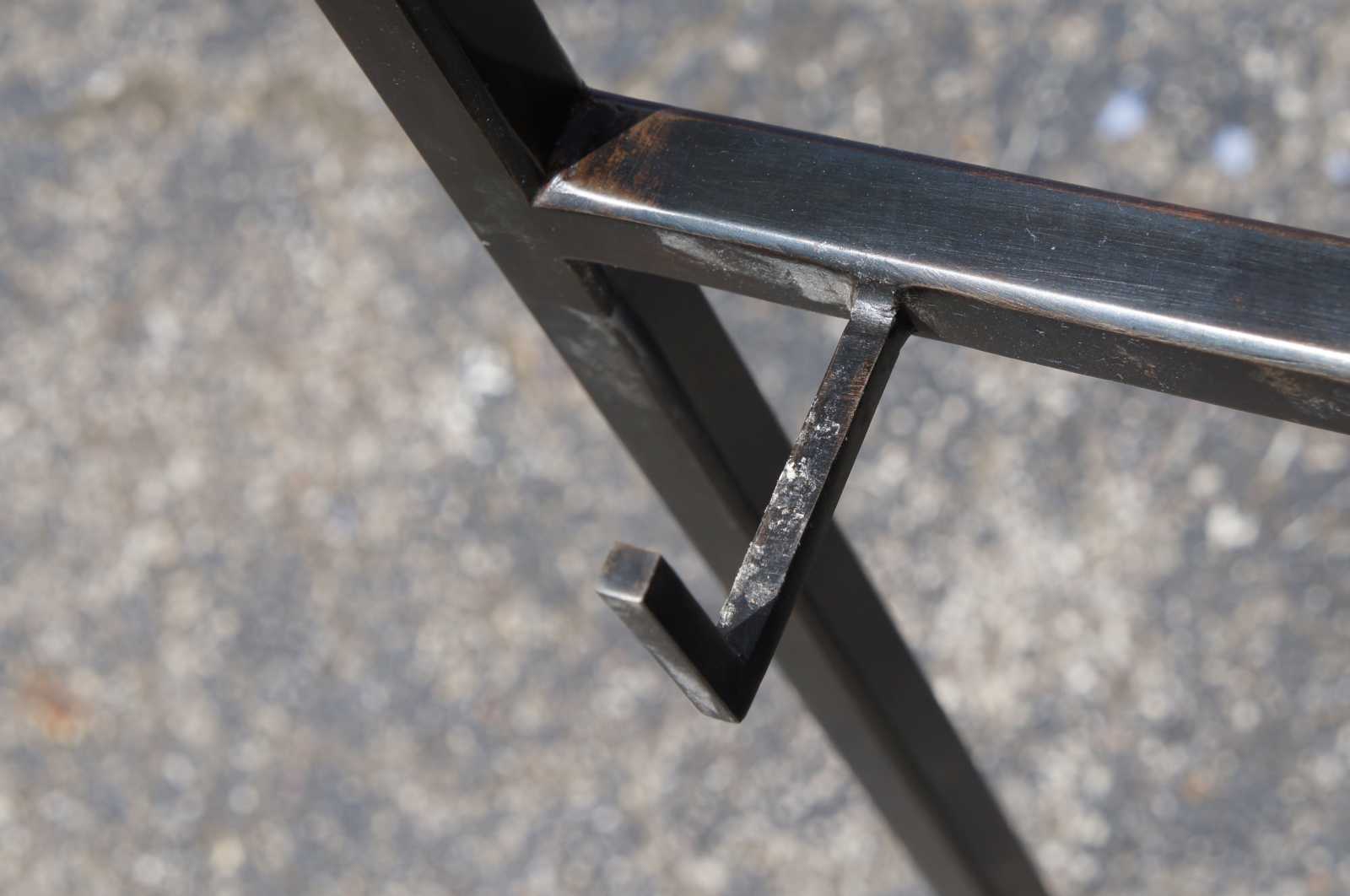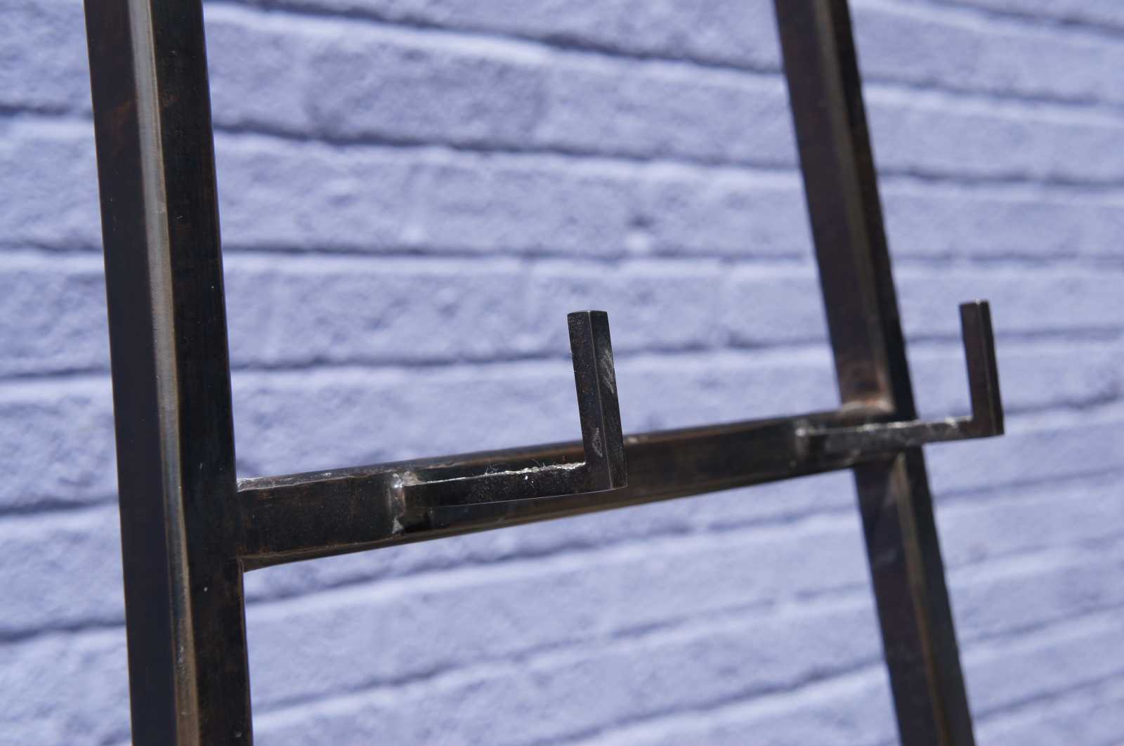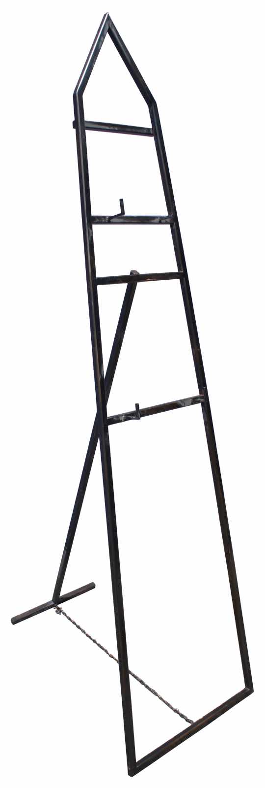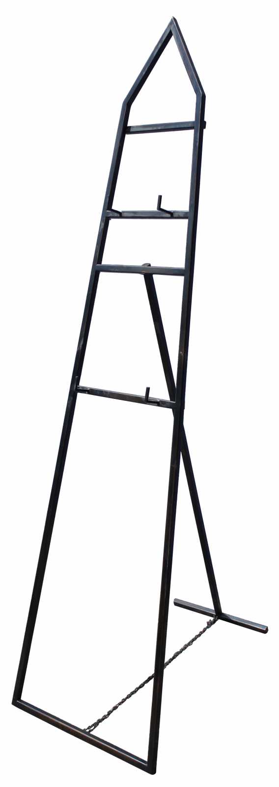 Black metal obelisk shaped display stand with two easel shelves for displaying multiple pieces of art.