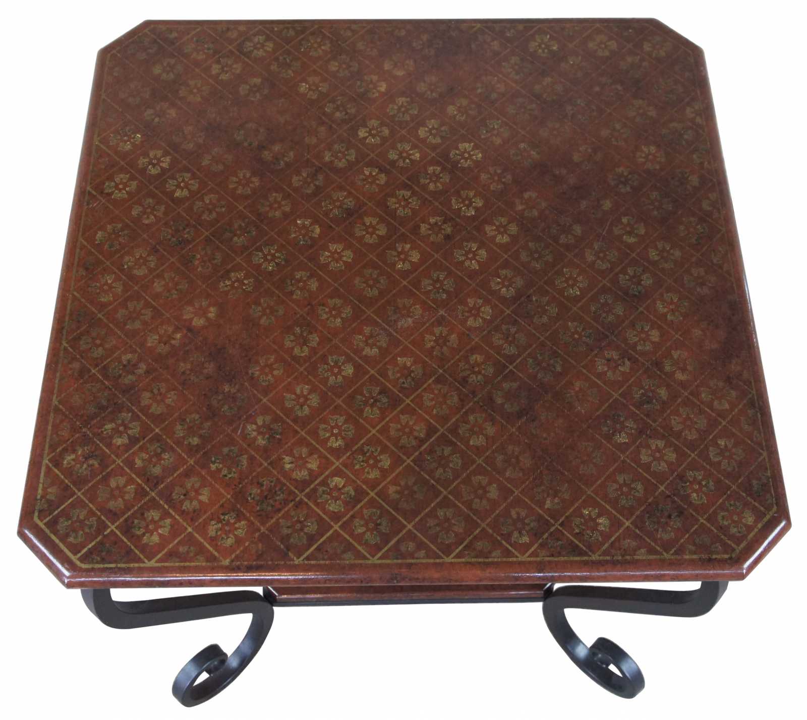 1990s Brunschwig & Fils side table. Drawing inspiration from Florentine and French styling. Made from scrolled iron with a reddish brown top featuring golden florets framed within a lattice design.