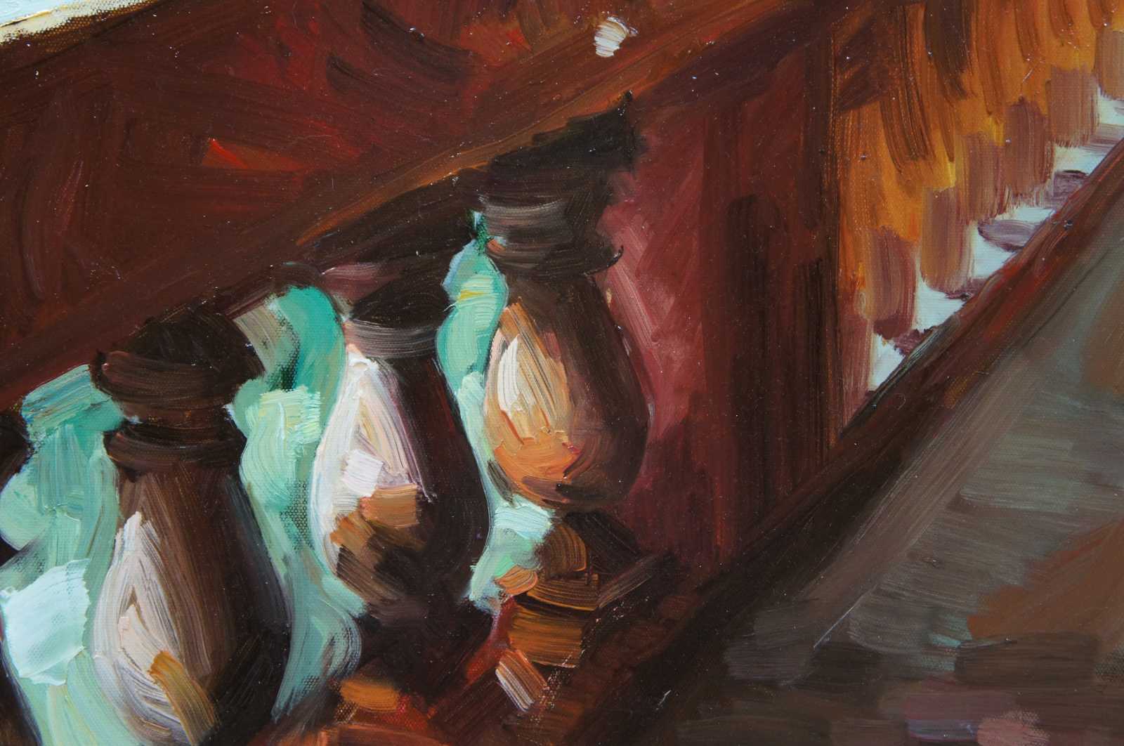 Signed impressionist style oil on canvas painting of an elegant patio or balcony, signed Edwin in lower corner.