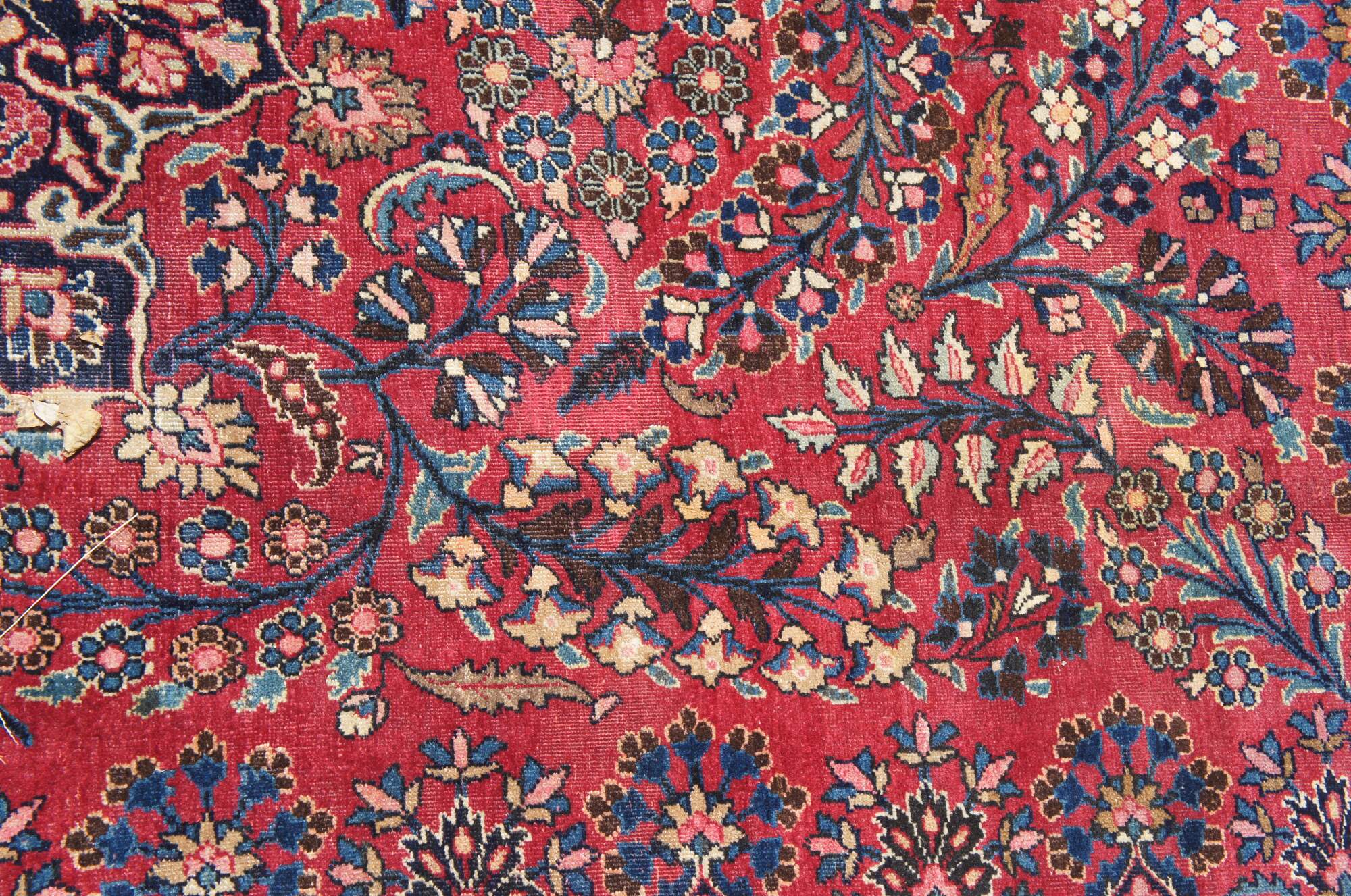 A classic old oriental rug. Features a tight weave in fine soft wool with deep red and dark blue colors. The carpet has a brilliant central medallion and is accented my meticulous floral sprays and a layered border with grape vine motif. 144kpsi (knots per square inch)