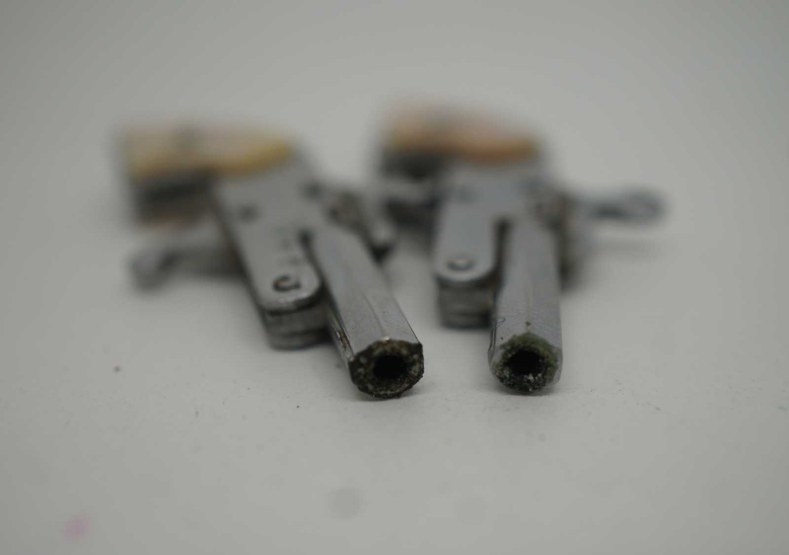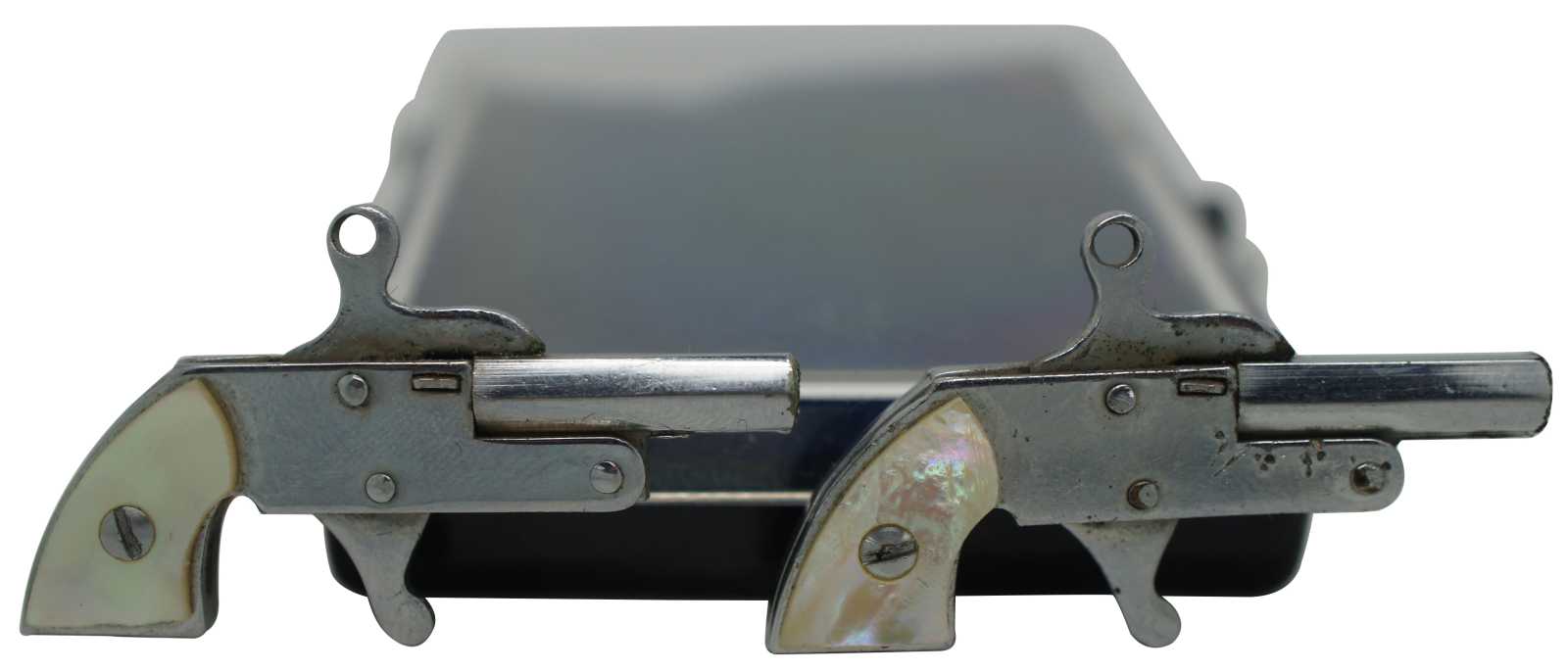 Vintage miniature pin fire cap gun pair with mother of pearl on the handles, made in Japan with small ring on top of the barrel for use as a key chain or watch fob. Includes set of 2mm blank cartridges and ram rod.
