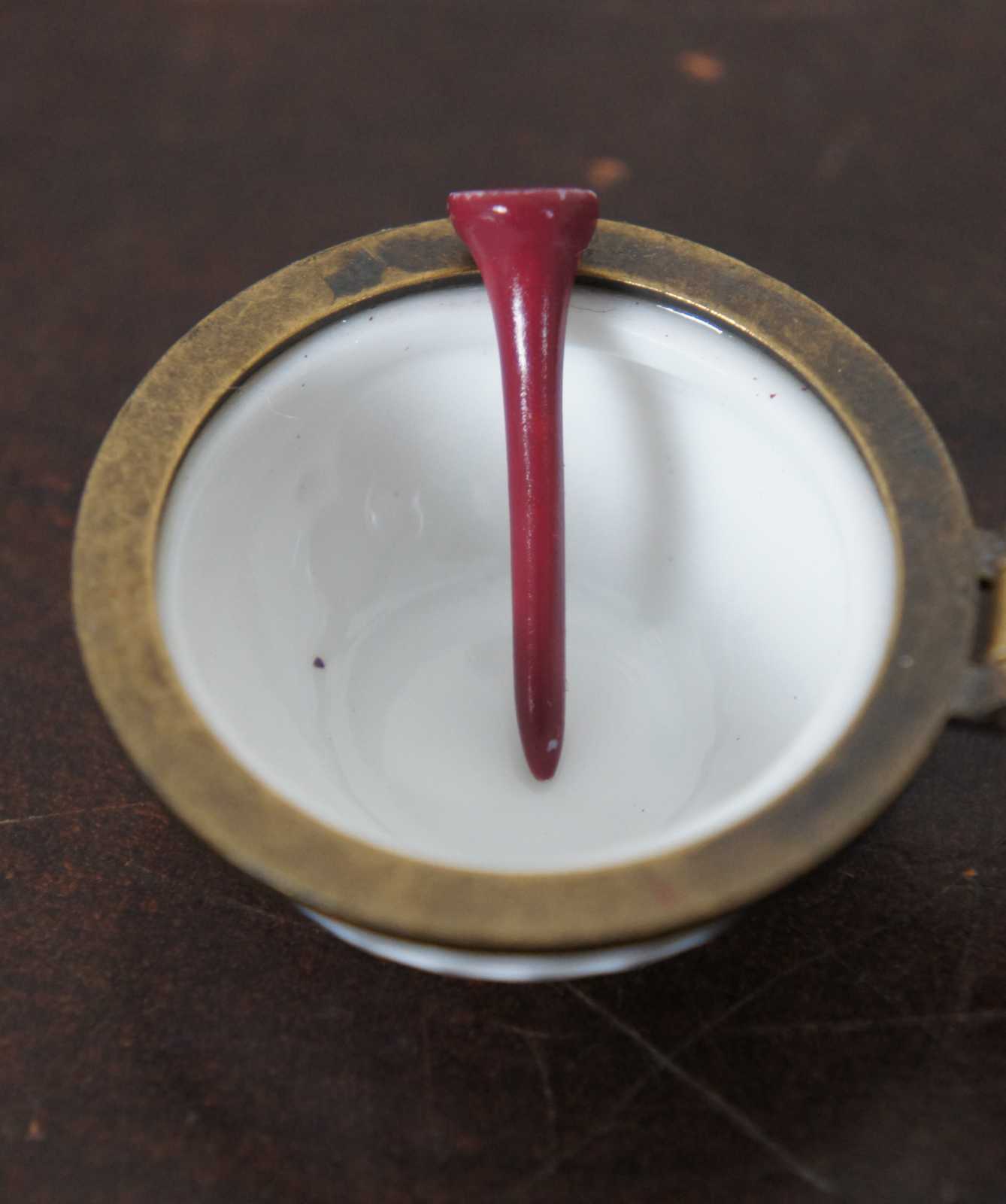 Vintage Midwest of Cannon Falls porcelain golf ball shaped trinket or pill box with porcelain golf tee inside.
