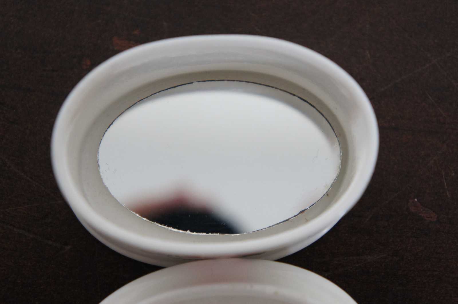 Vintage Crown Staffordshire fine bone china oval trinket dish, white porcelain with pink and purple flowers, a mirror inside, and the phrase “You are Witty and Pretty.”