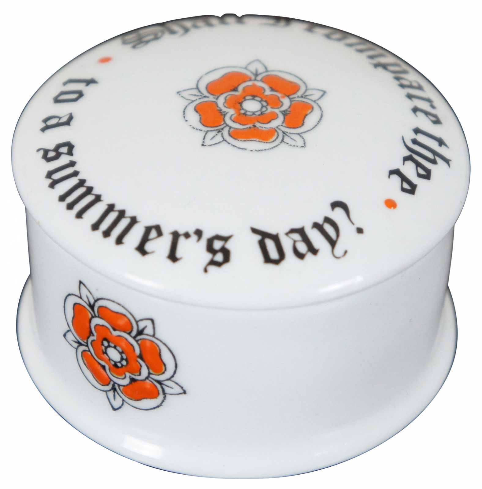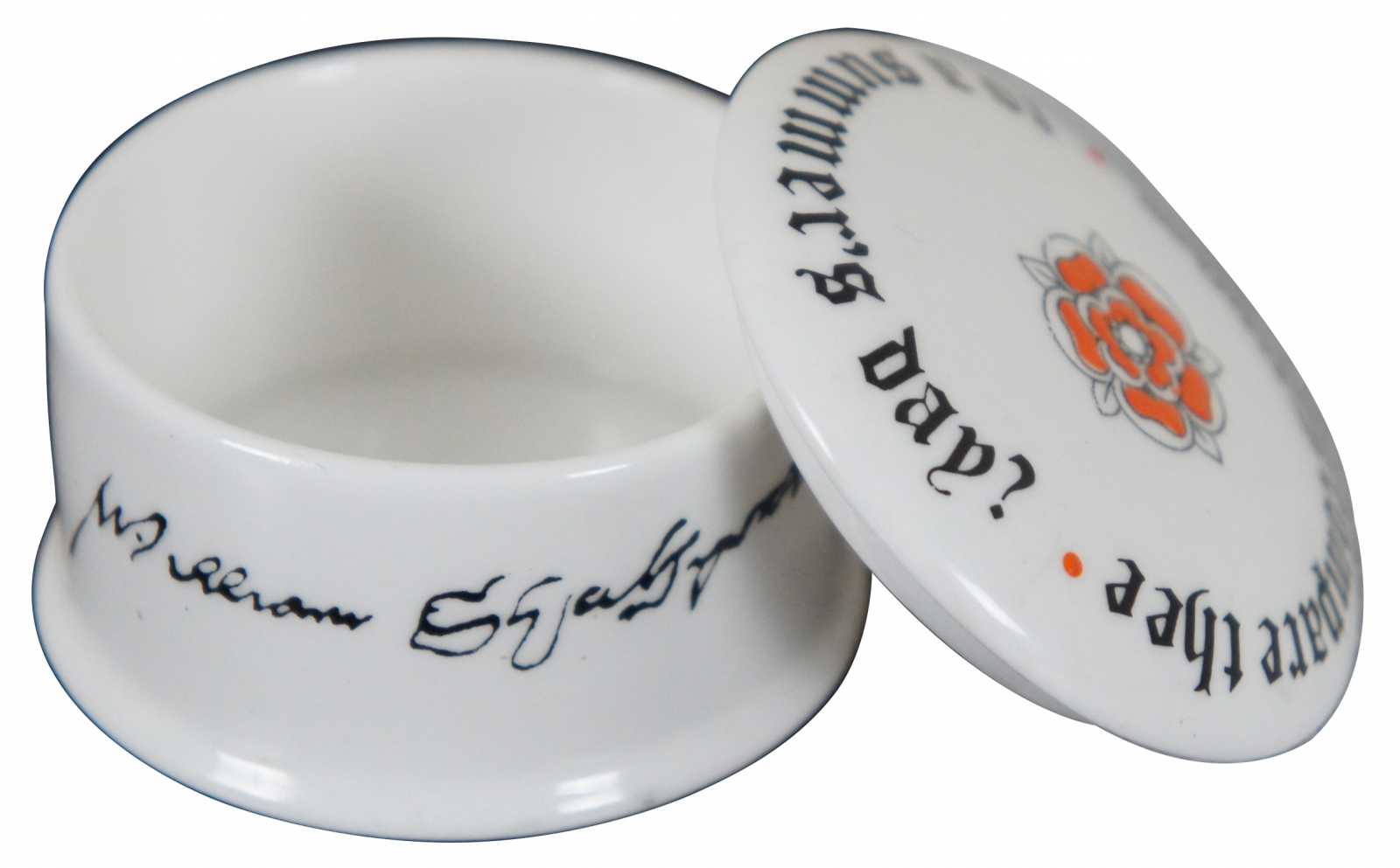 Vintage Crown Staffordshire fine bone china, round trinket box in white porcelain with red-orange Tudor roses, a reproduction of William Shakespeare’s signature, and the phrase “Shall I Compare Thee to a Summer’s Day?” from Sonnet 18.