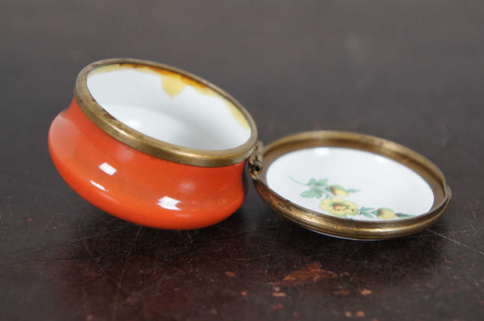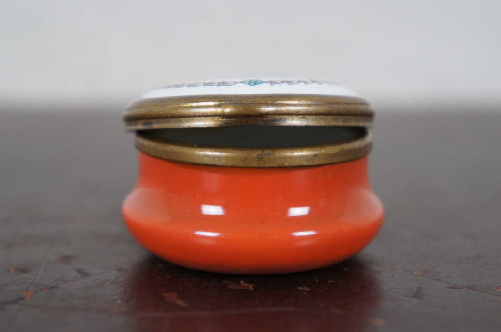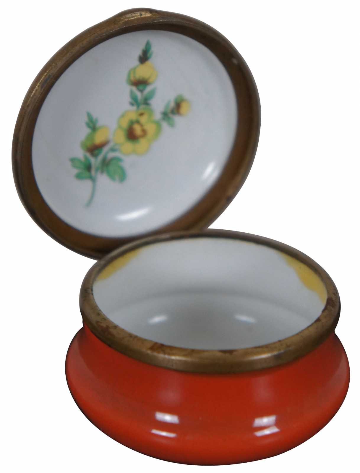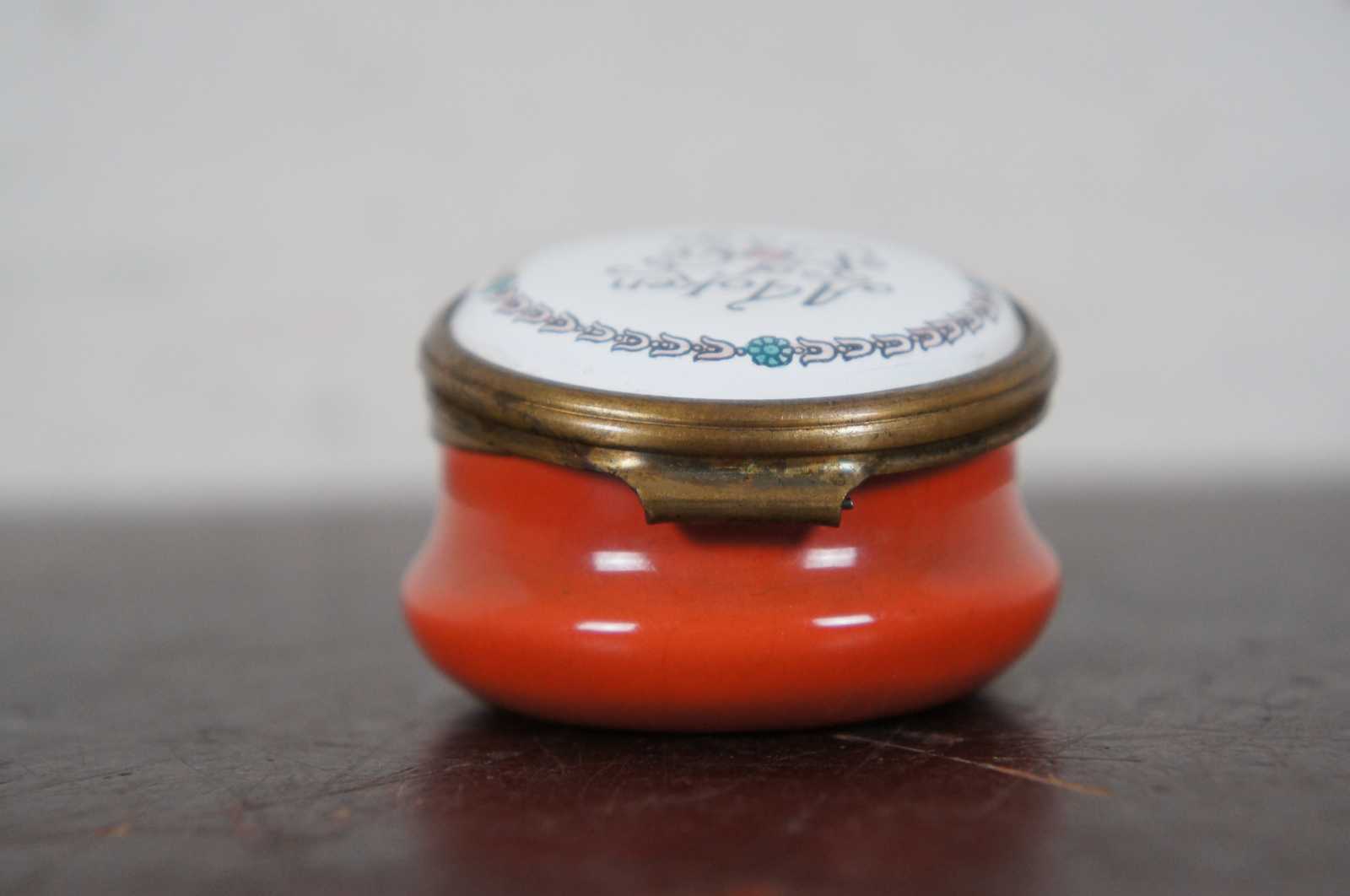 Vintage Bilston England enamel round trinket or pill box with orange sides, a wreath of flowers, and the phrase “A Token of Love.”