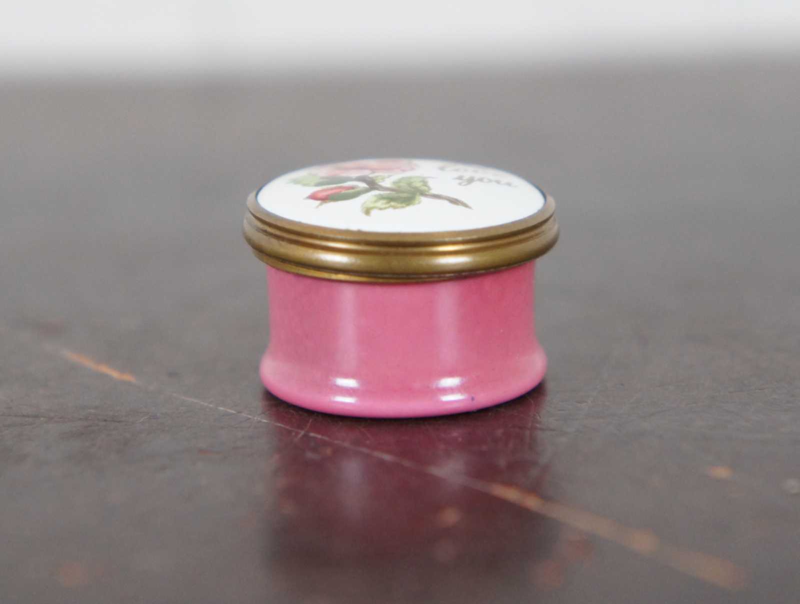 Vintage Bilston & Battersea Enamels miniature pill or trinket box designed by Halcyon Days with pinks sides, a rose and the phrase “I Love You.”