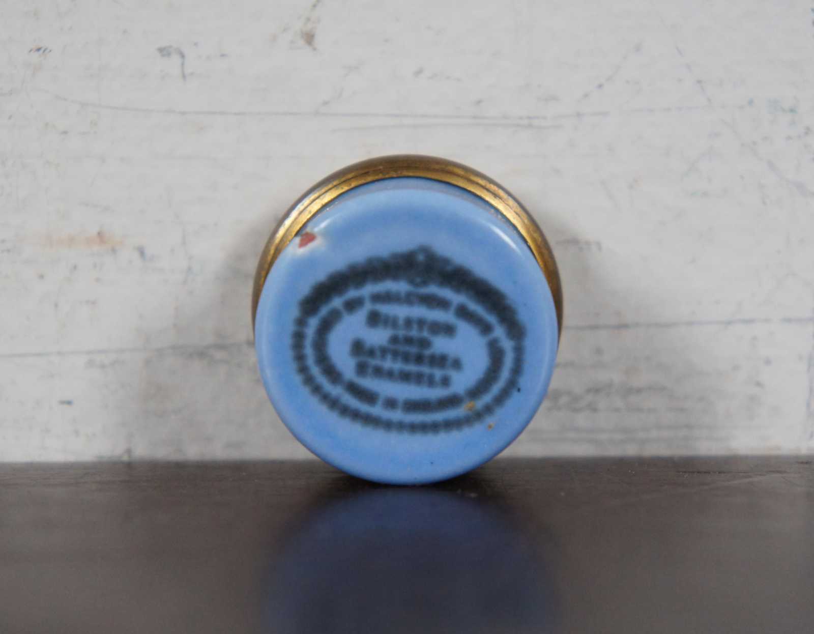 Vintage Bilston & Battersea Enamels miniature pill or trinket box designed by Halcyon Days with blue sides, blue flowers, and the phrase “Thinking of You.”