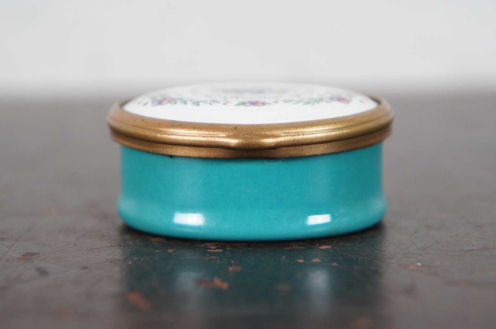 Vintage Bilston & Battersea Enamels oval trinket or pill box designed by Halcyon Days with turquoise sides, an array of flowers and the phrase “A Token of Affection.”