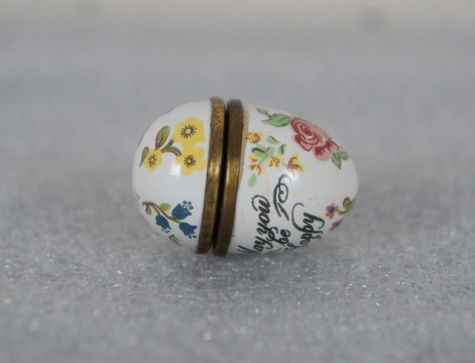 Vintage Bilston & Battersea Enamels Easter egg shaped miniature trinket box designed by Halcyon Days with an array of flowers and the phrase “May You Be Happy.”