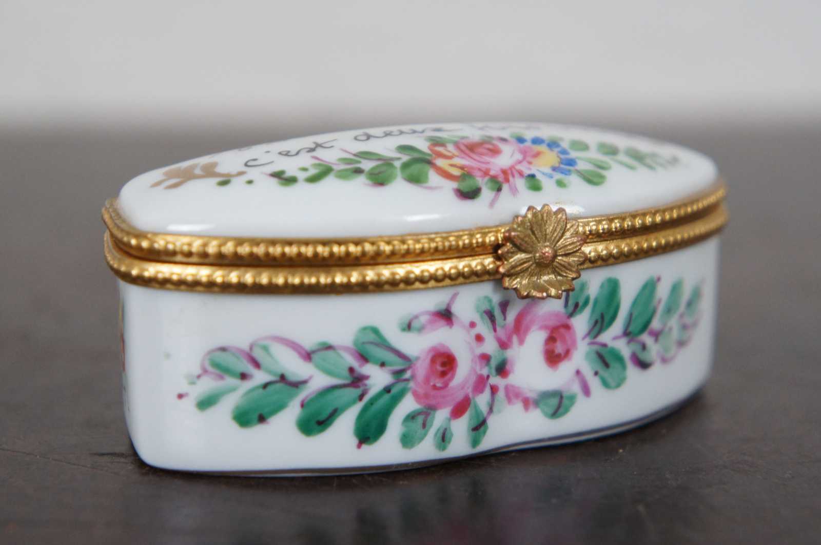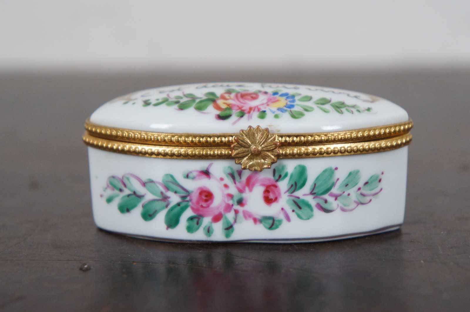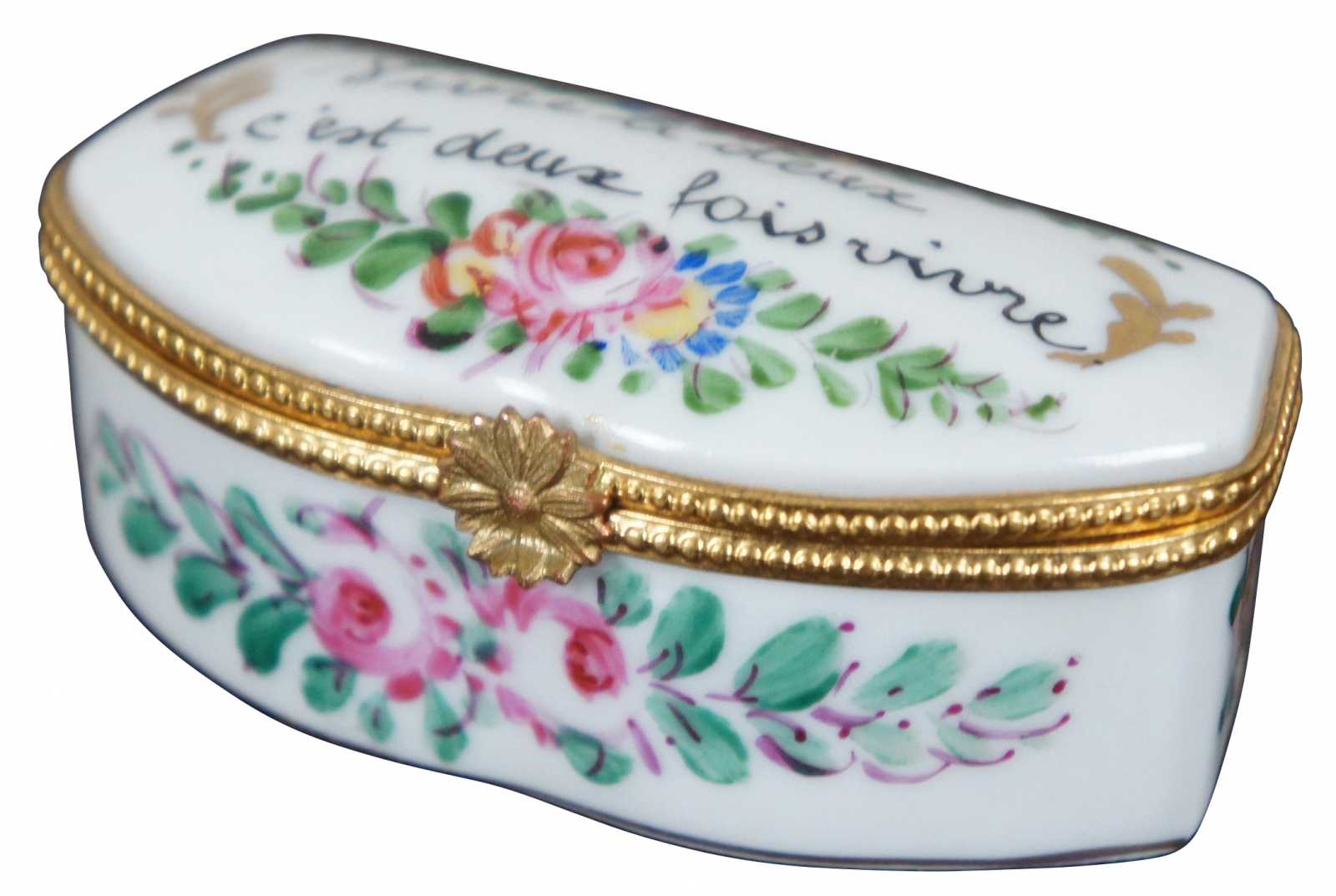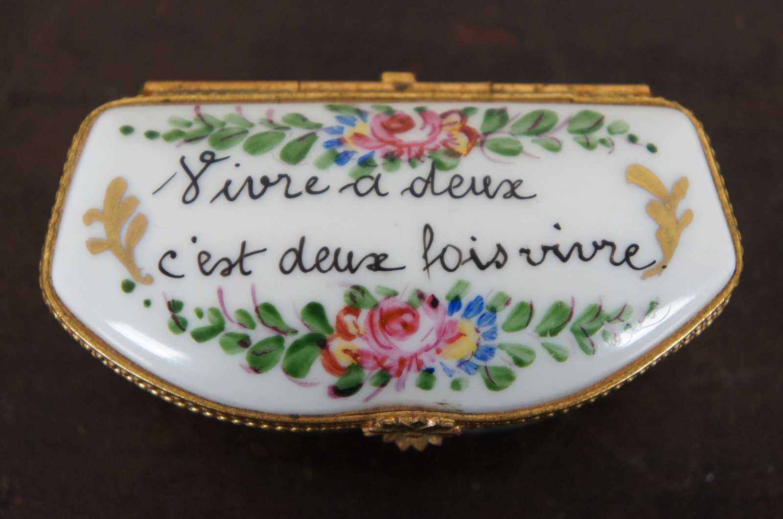 Vintage Limoges French hand painted porcelain trinket or pill box with flowers and the phrase “Vivre a Deux C’est Deux Fois Vivre” (Living Together is Twice Living).
