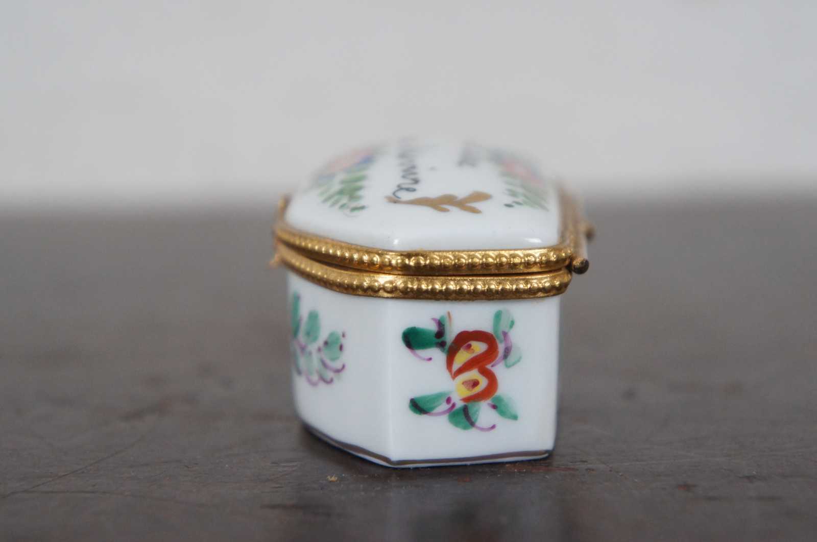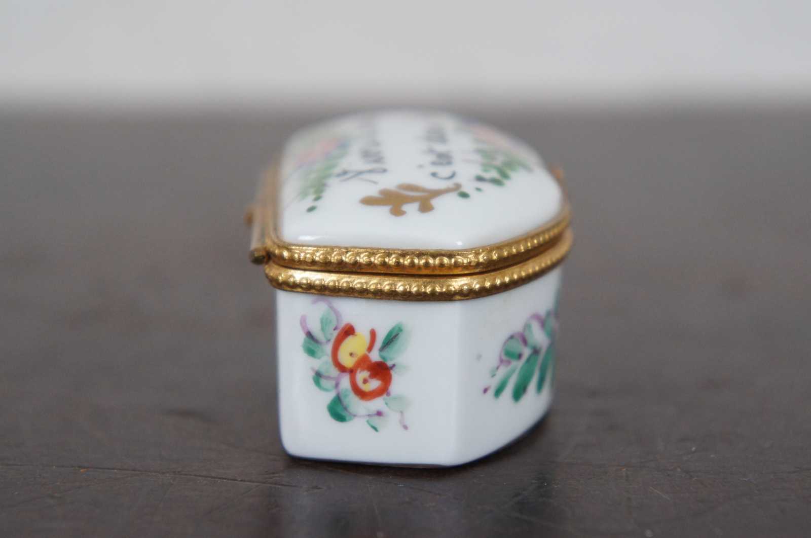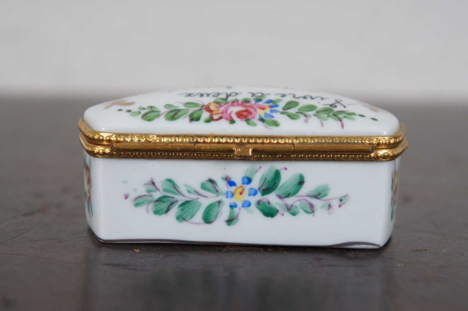 Vintage Limoges French hand painted porcelain trinket or pill box with flowers and the phrase “Vivre a Deux C’est Deux Fois Vivre” (Living Together is Twice Living).