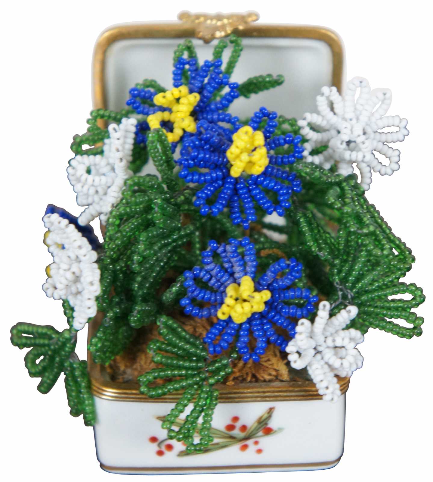 Antique Limoges porcelain made in France for Bonwit Teller square trinket box painted with a boquet of flowers and a ladybug, filled with blue and white seed bead flowers.