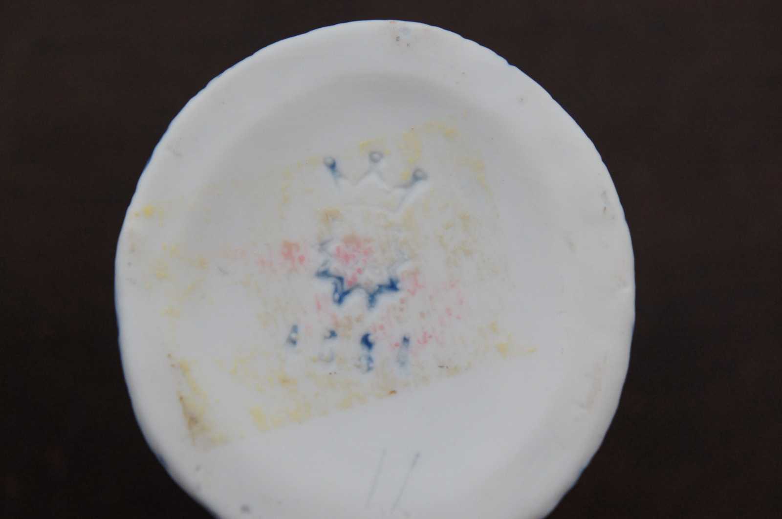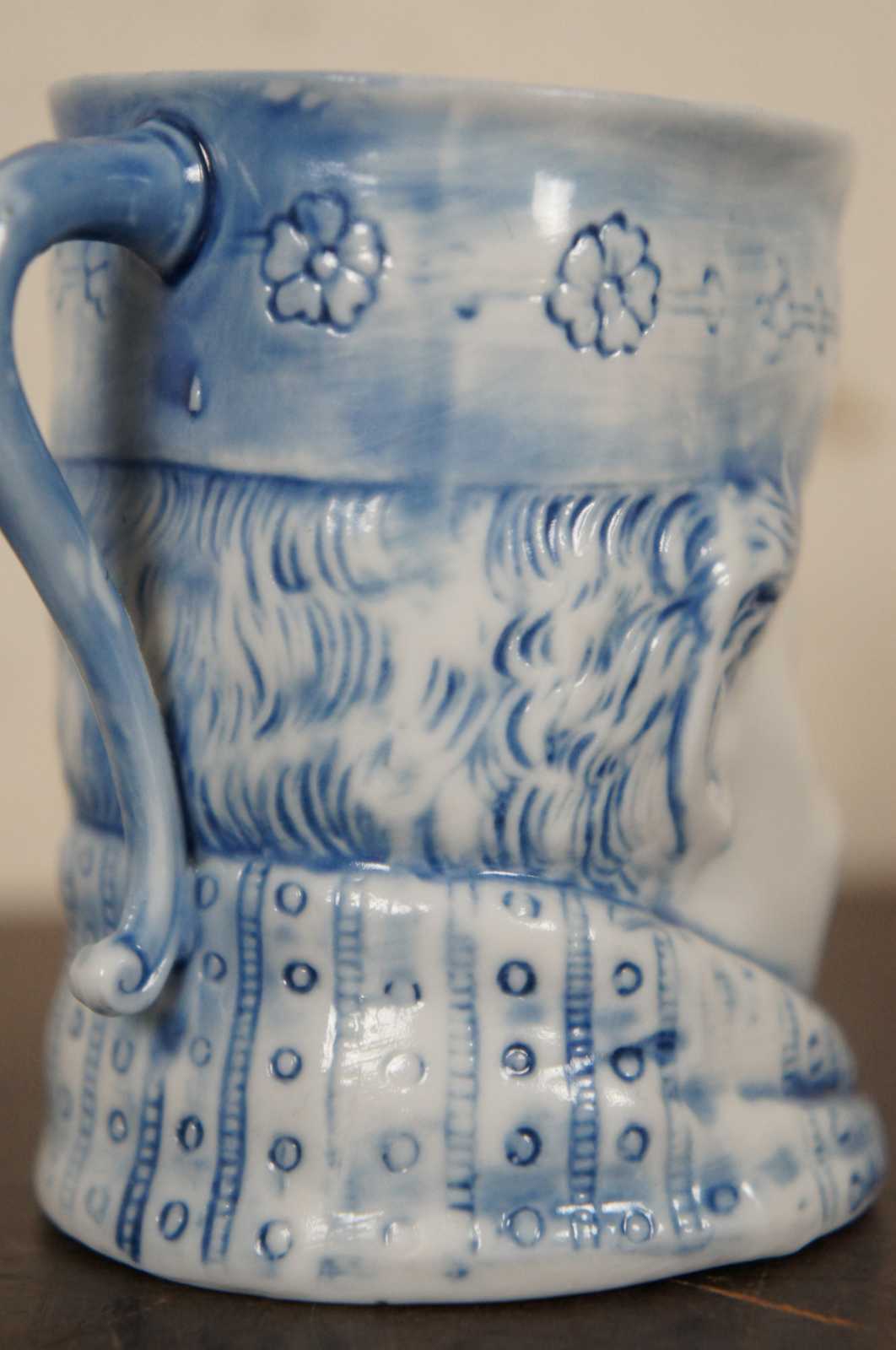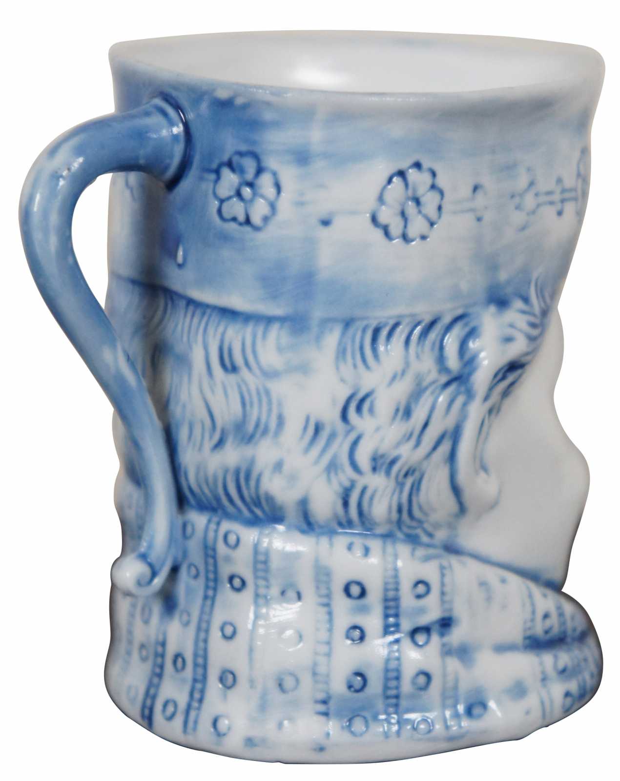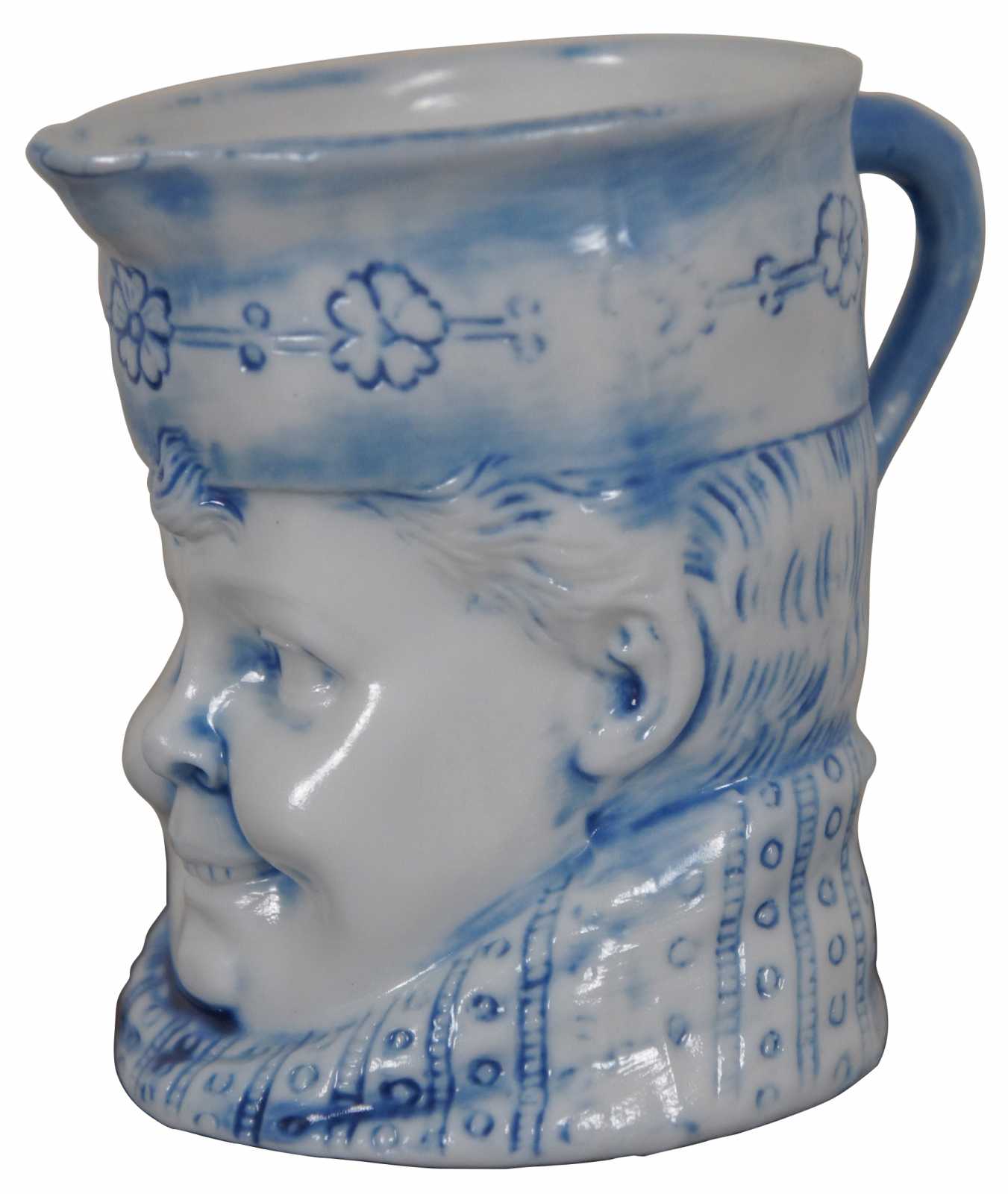 Schafer & Vater were better known for their comical and figural items. They manufactured these in teapots, jugs, creamers, bottles, match strikers, and planters, with a backstamp impressed with a crown above an 'R' in a star. 'Made in Germany' was sometimes stamped in black. The firm used a light blue glaze applied directly to the porcelain.