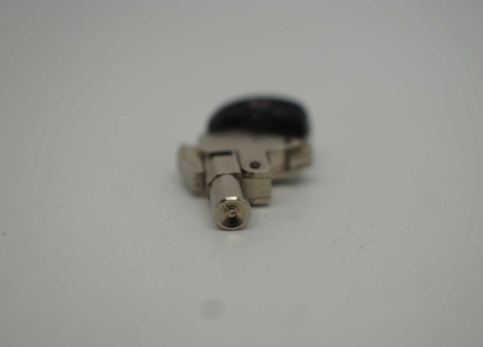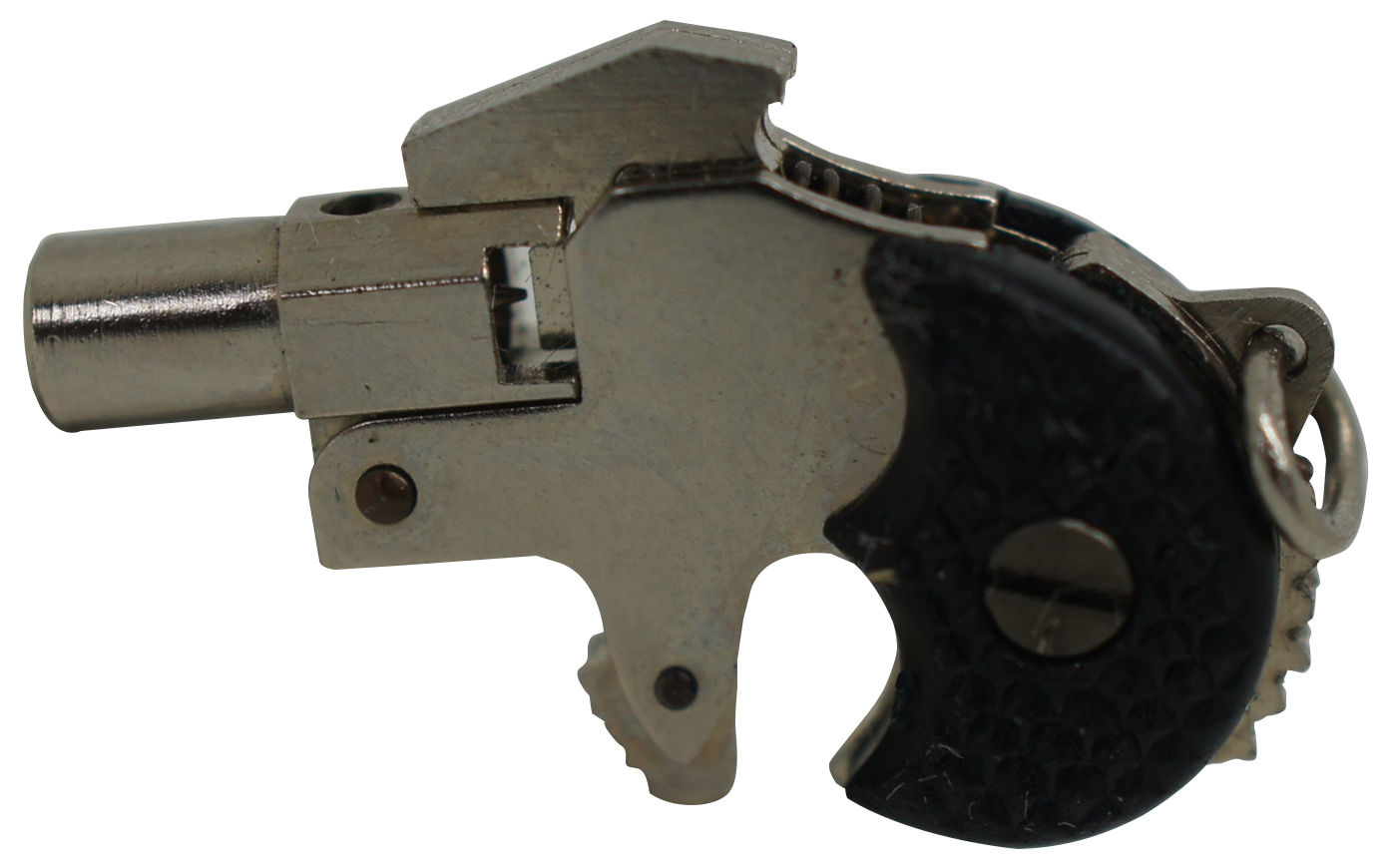 Vintage miniature toy gun in the shape of a pistol with a black grip with small ring on back for use as a key chain or watch fob. Top of barrel slides as if to cock but does not shoot.