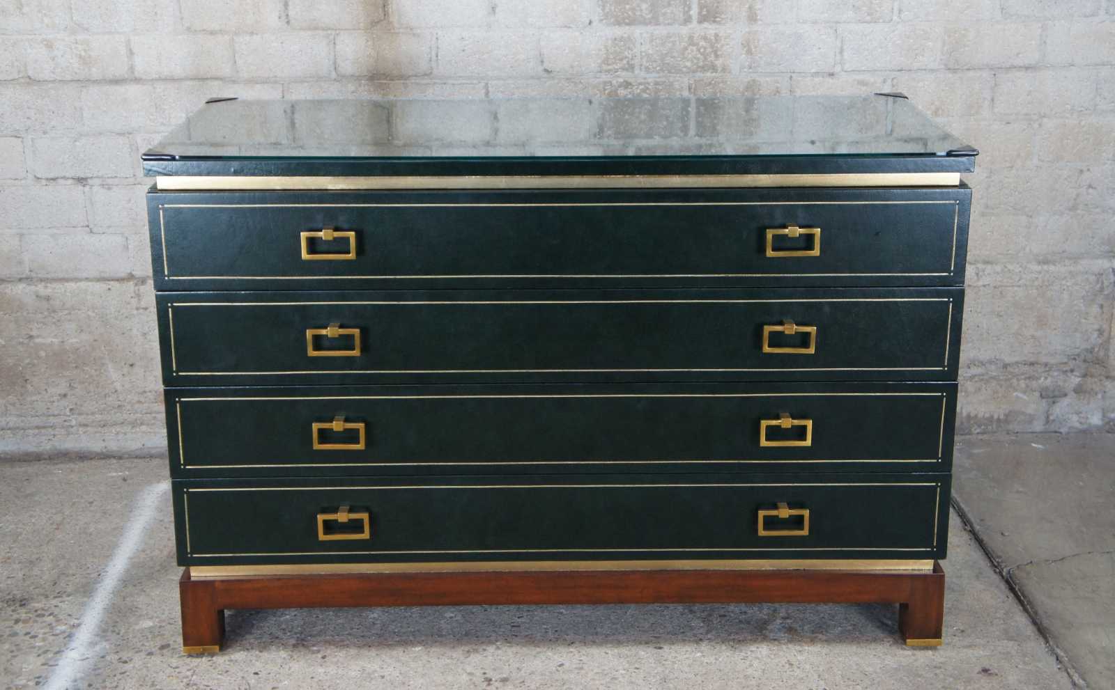 Stylish transitional four draw chest with green leather and Lacoste walnut, gold gilt accents, showroom floor sample