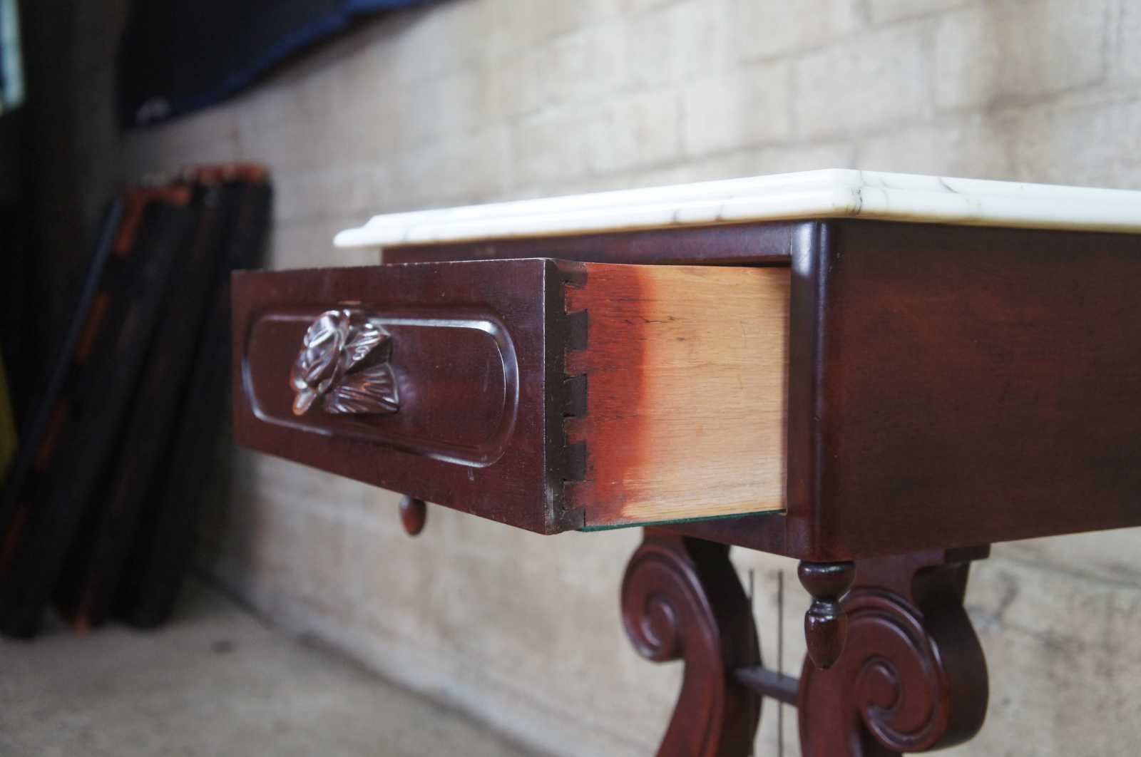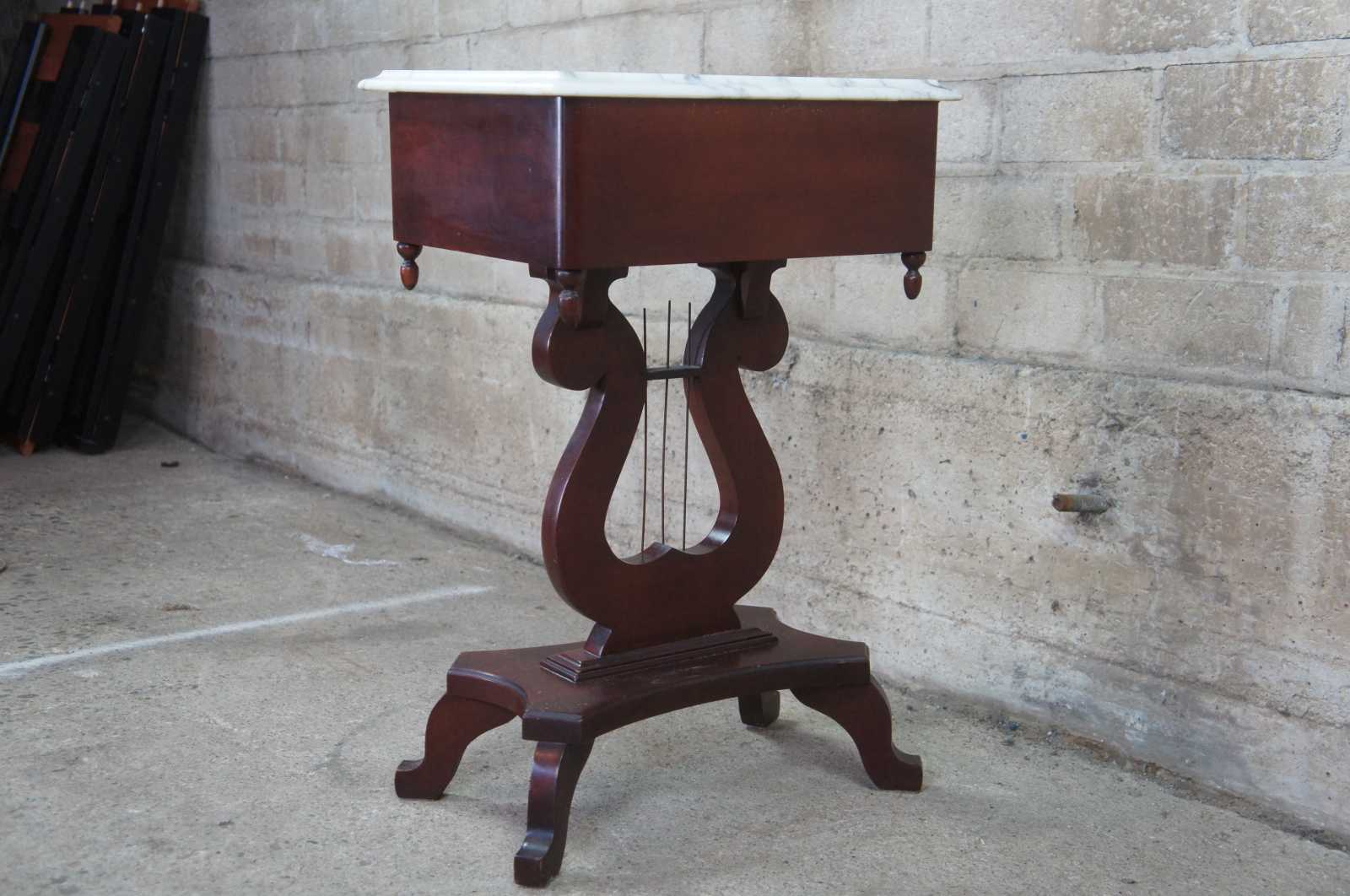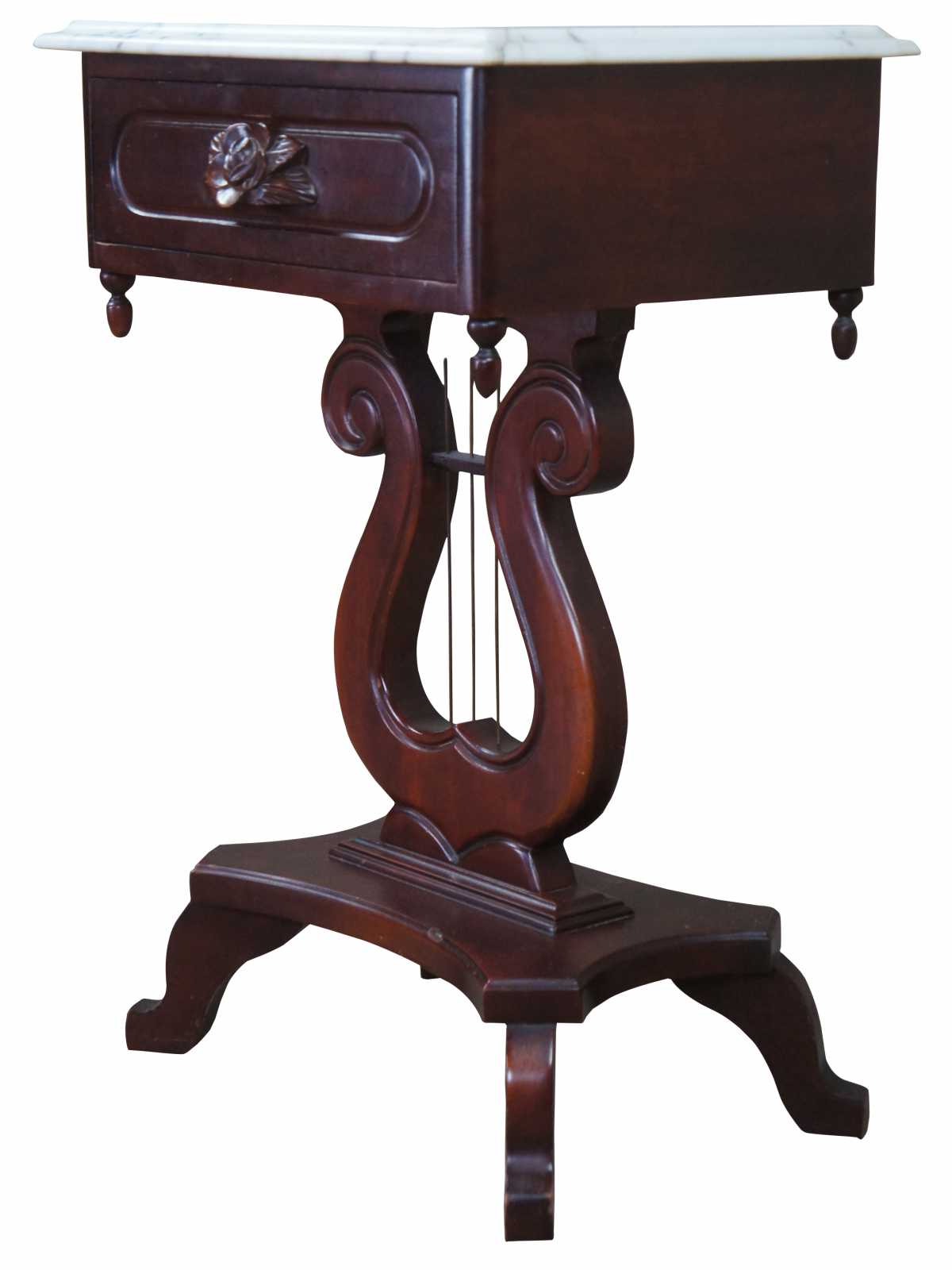 Victorian harp or lyre parlor side table. Made of mahogany featuring a white carrara marble top over one drawer with a carved rose pull, drop finials over harp pedestal base. Marked Italy on marble.