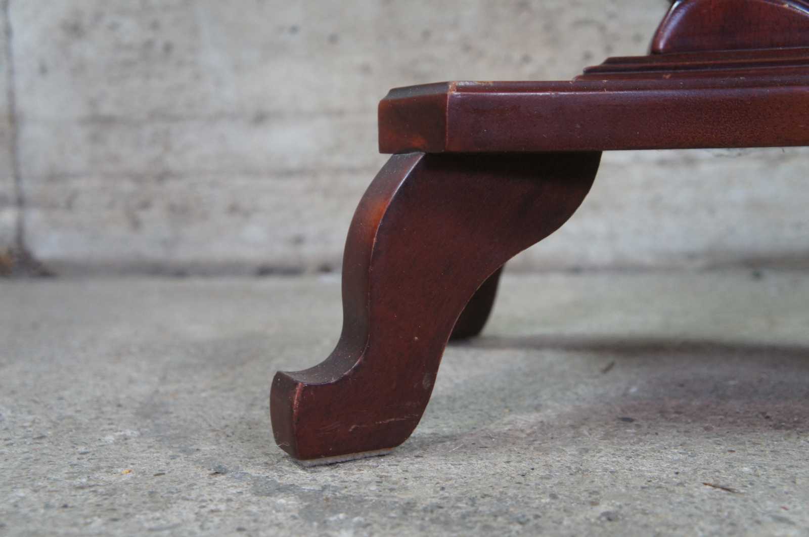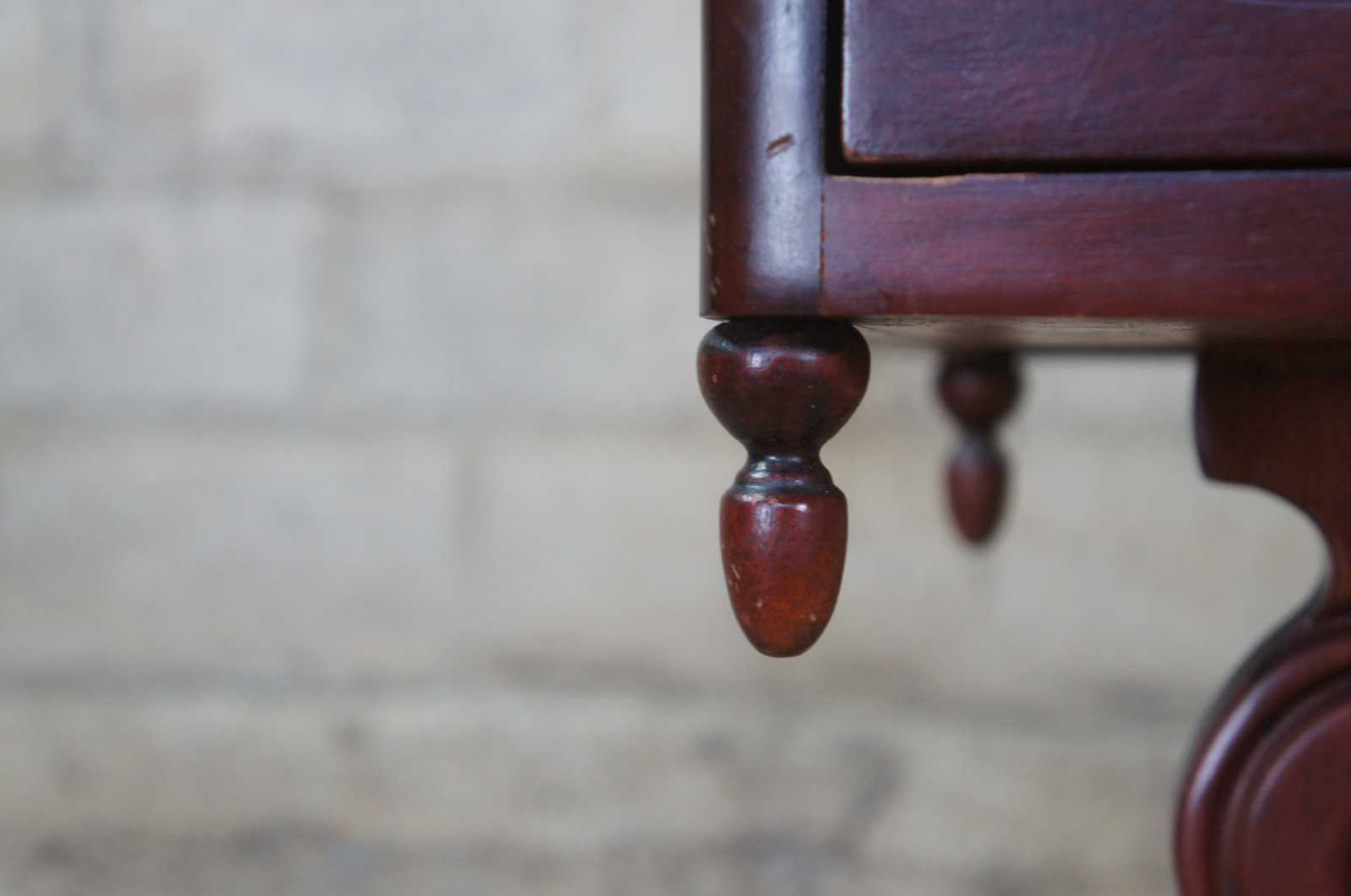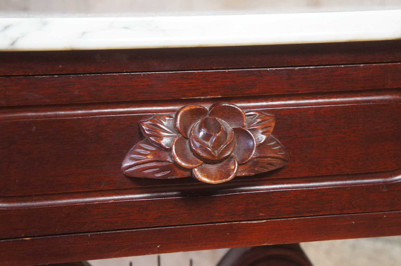 Victorian harp or lyre parlor side table. Made of mahogany featuring a white carrara marble top over one drawer with a carved rose pull, drop finials over harp pedestal base. Marked Italy on marble.