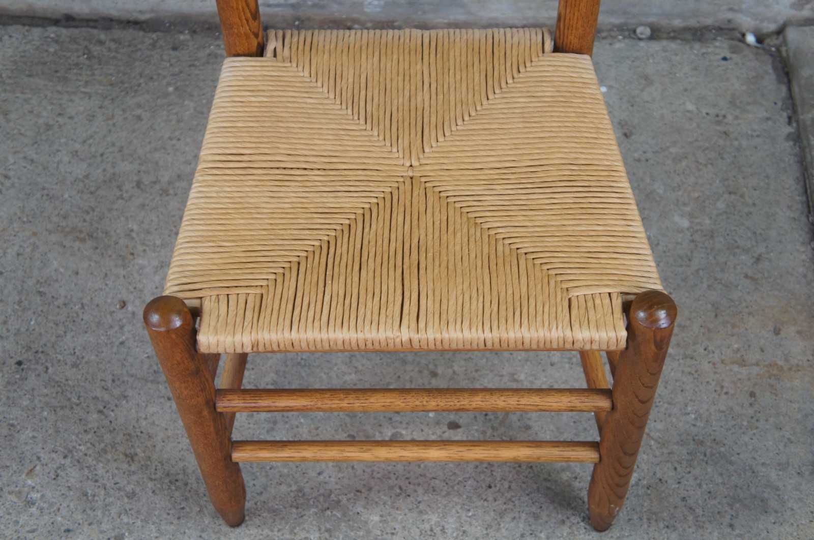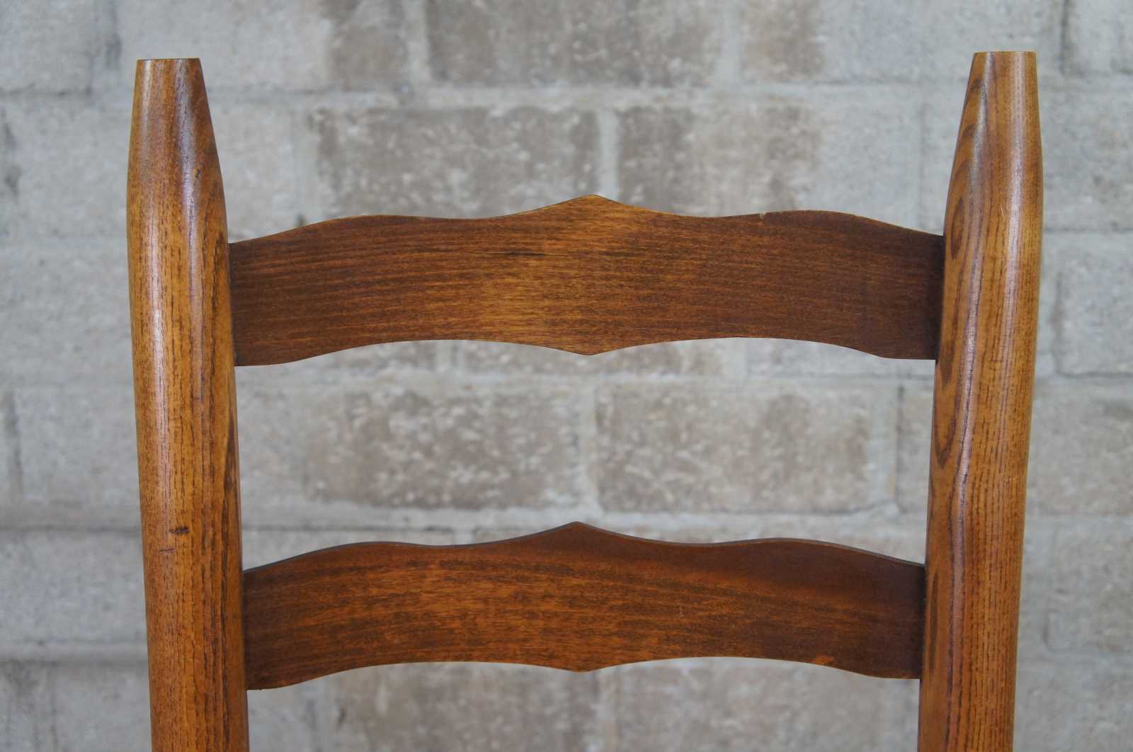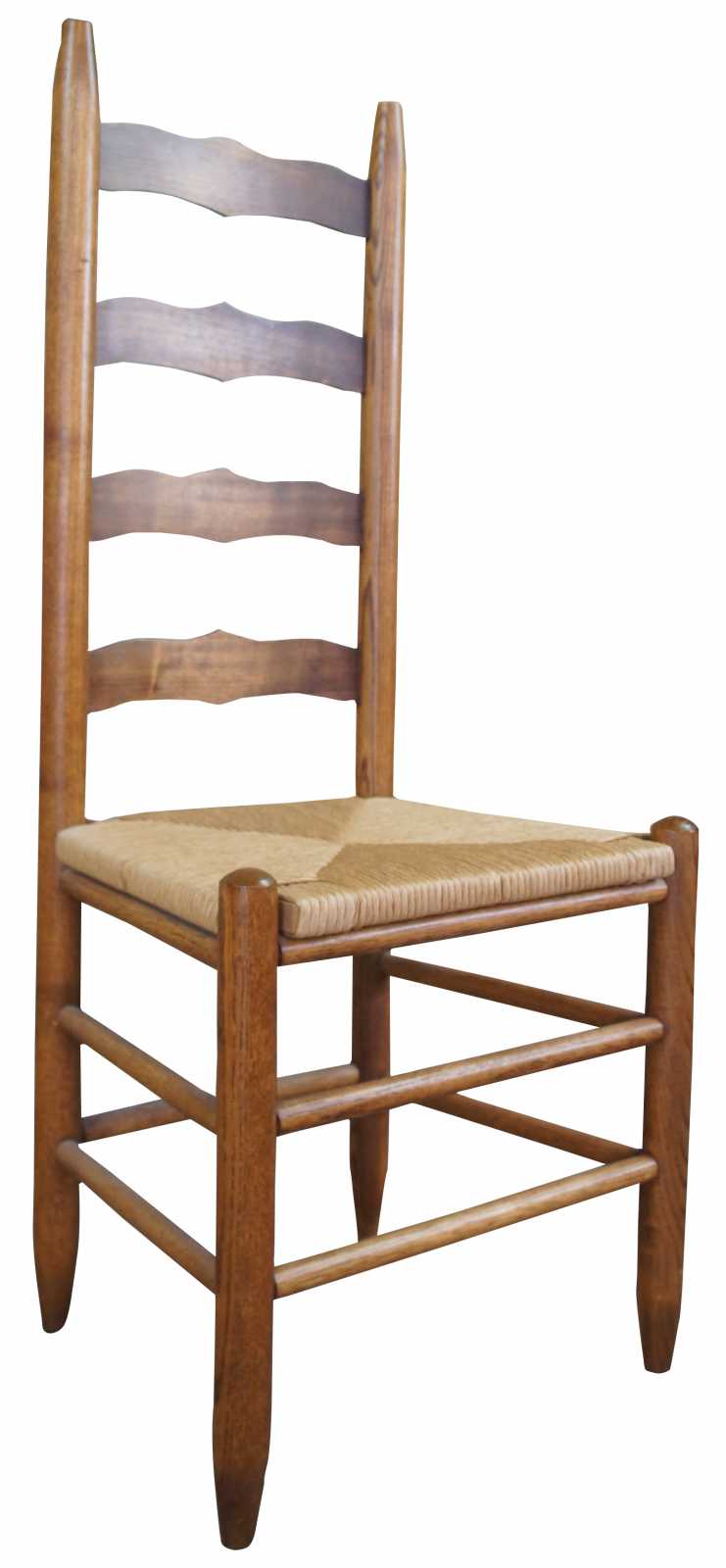 Pair of two ladder back side dining chairs. Made of oak featuring woven rush seats and tall ladderback with serpentine form.