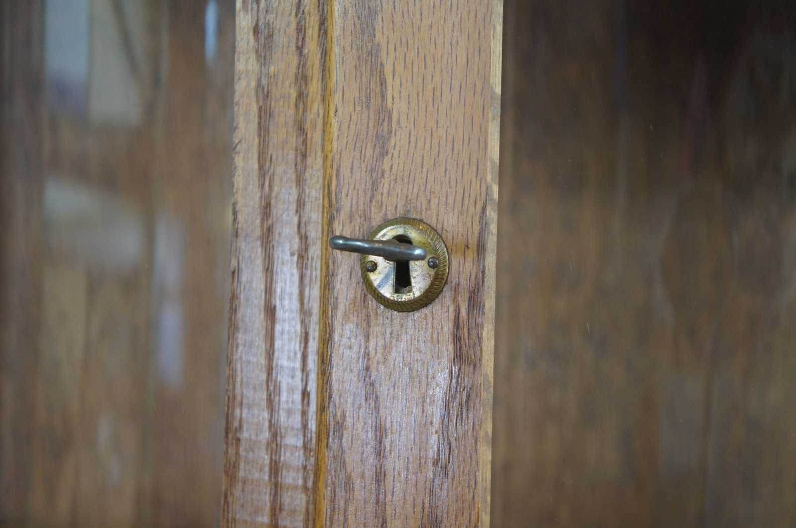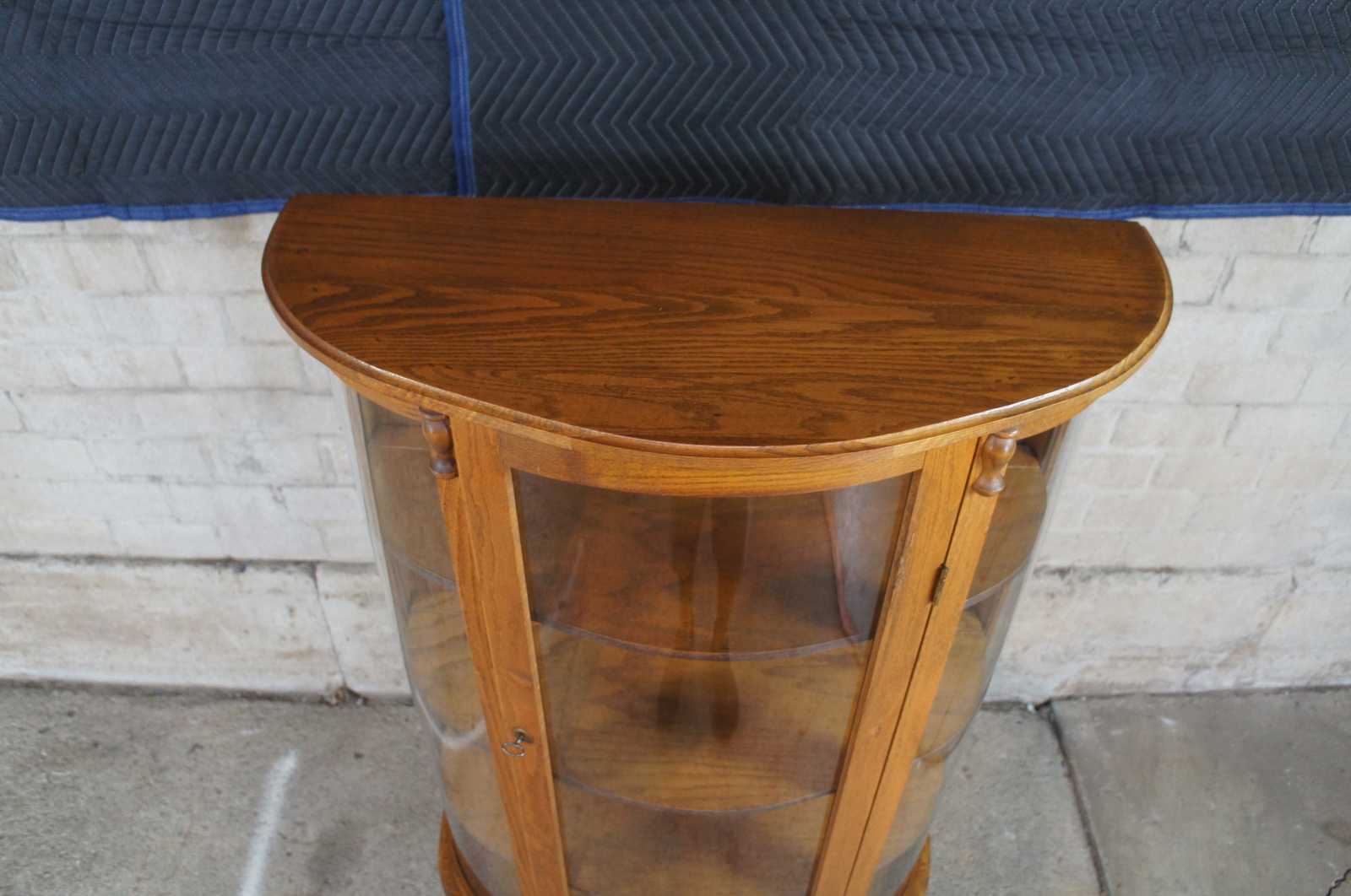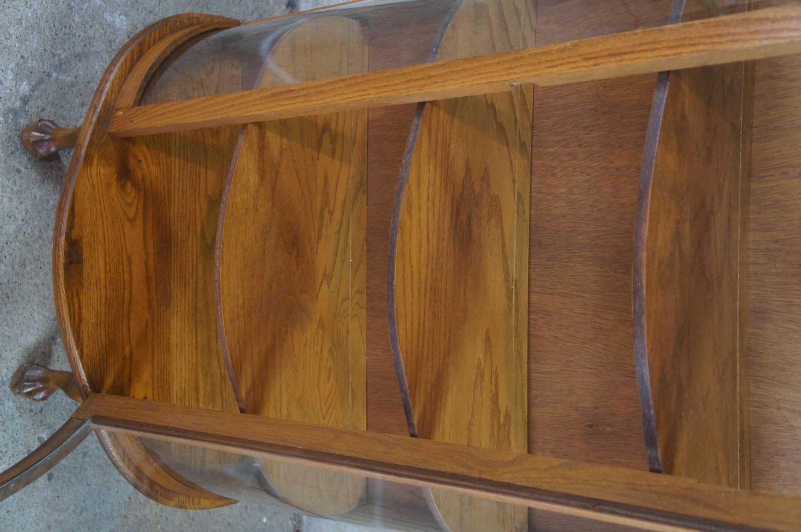 Early 20th century oak bowfront curio or display cabinet. Features a demiulune form with three shelves over ball and claw feet.