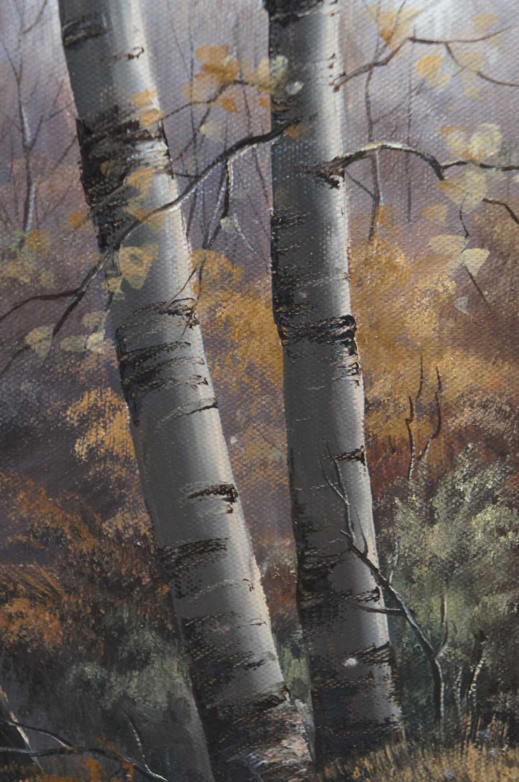 Vintage oil on canvas forest landscape painting titled “Quiet Dusk” by Anita Hohne.