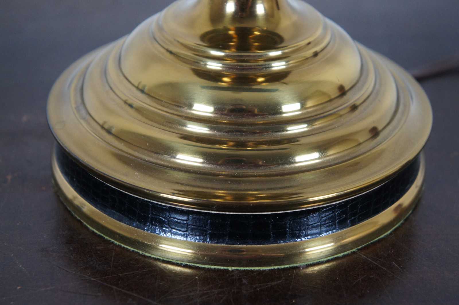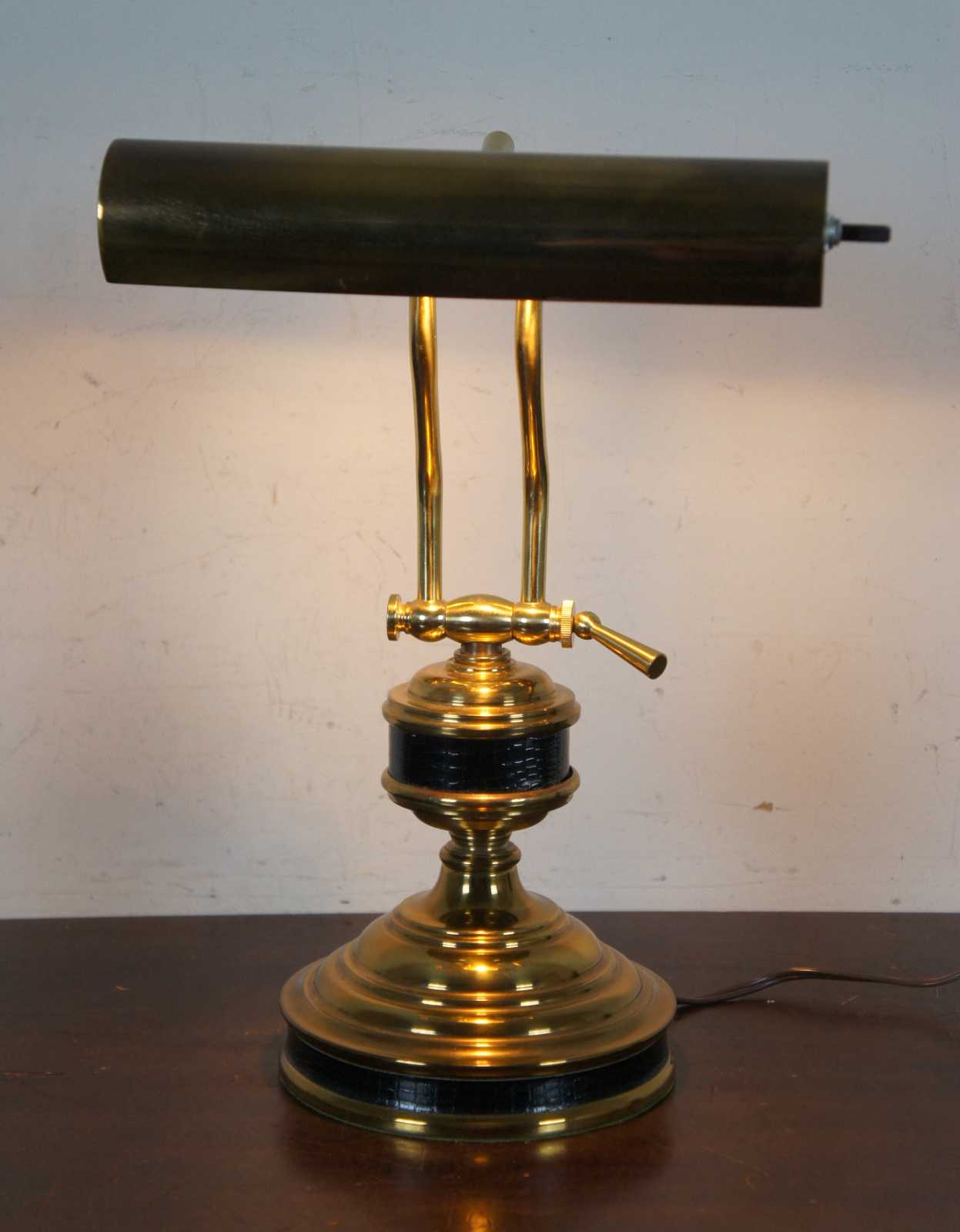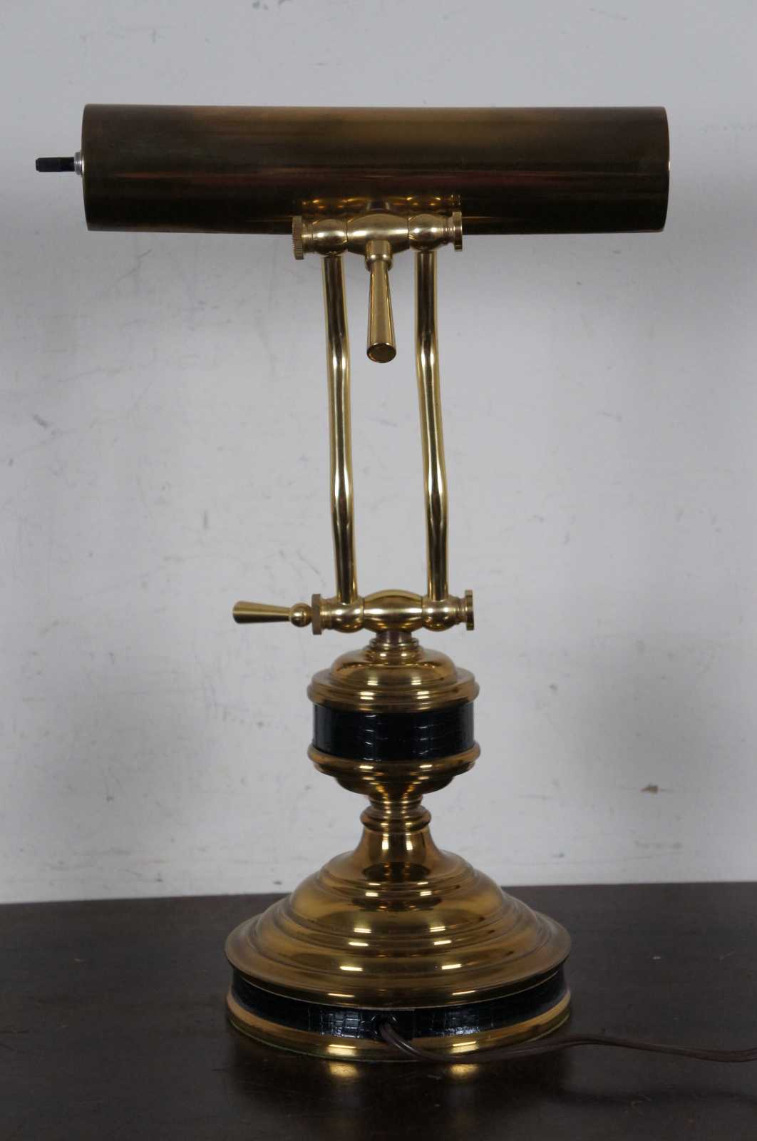 Vintage adjustable angle bankers or piano lamp in brass with black alligatored leather accents.