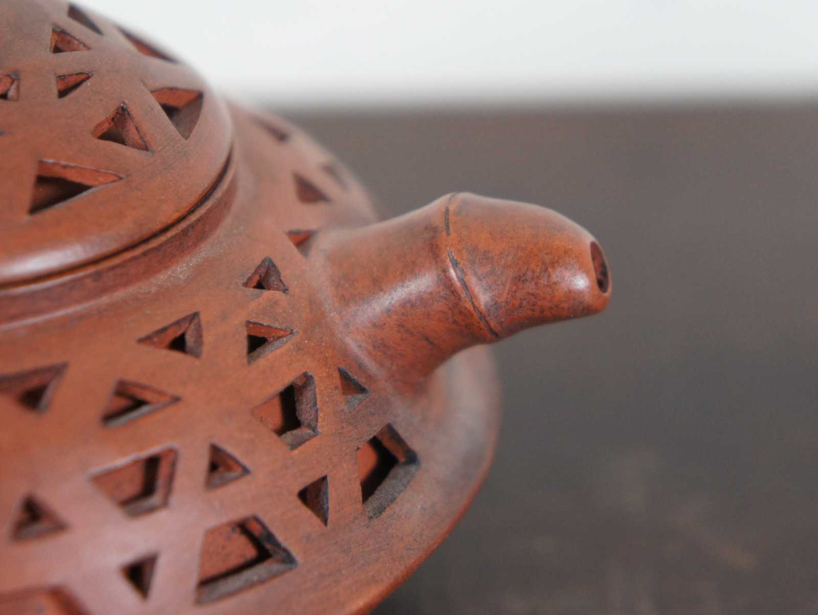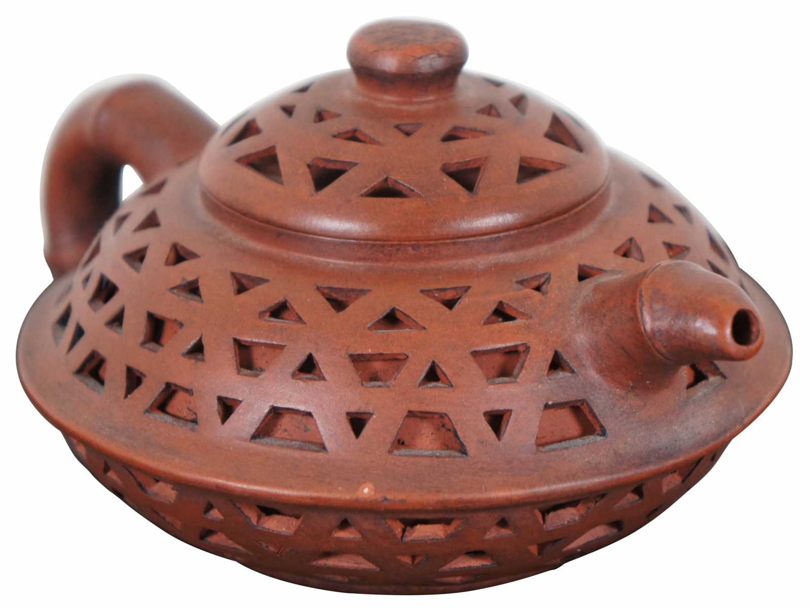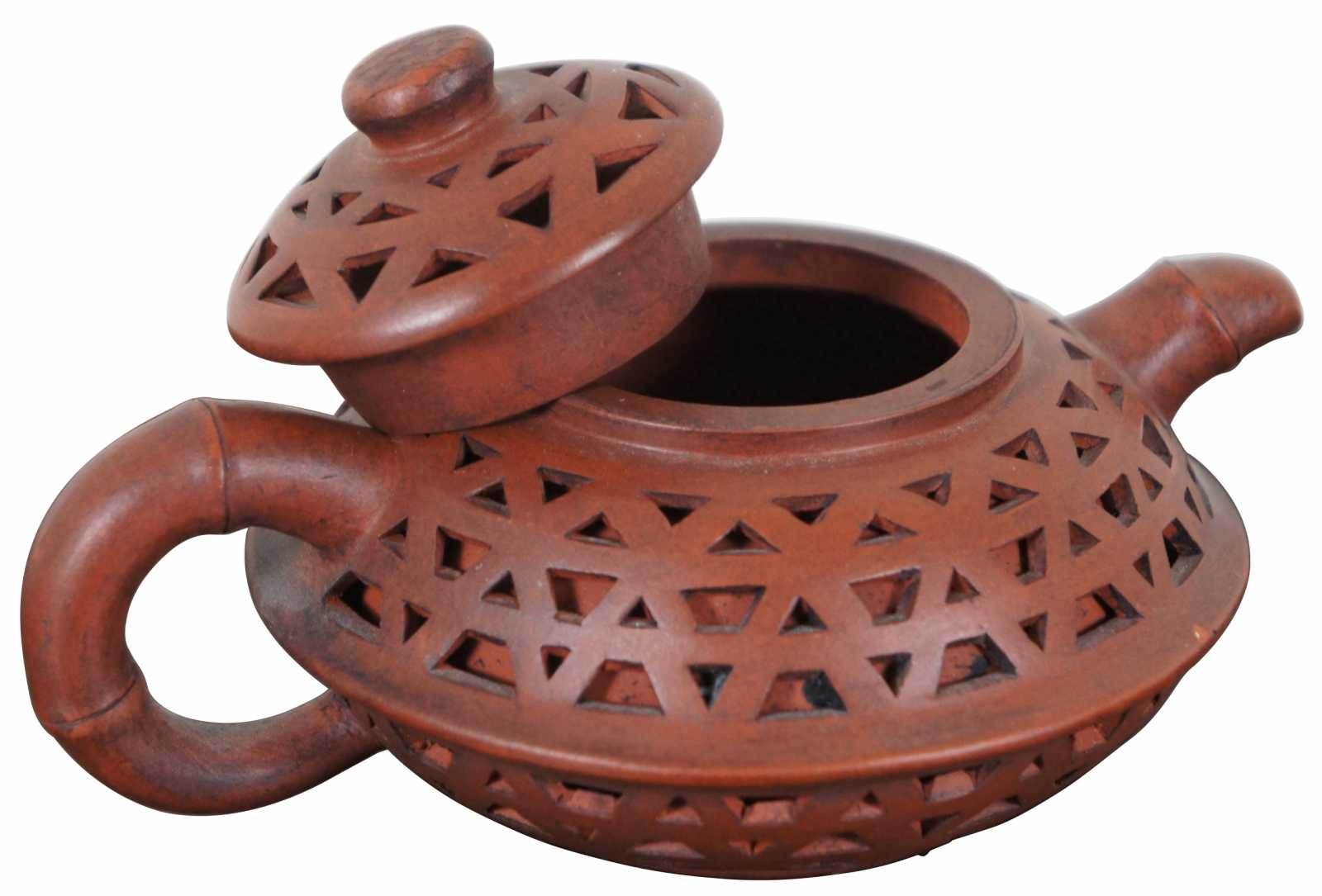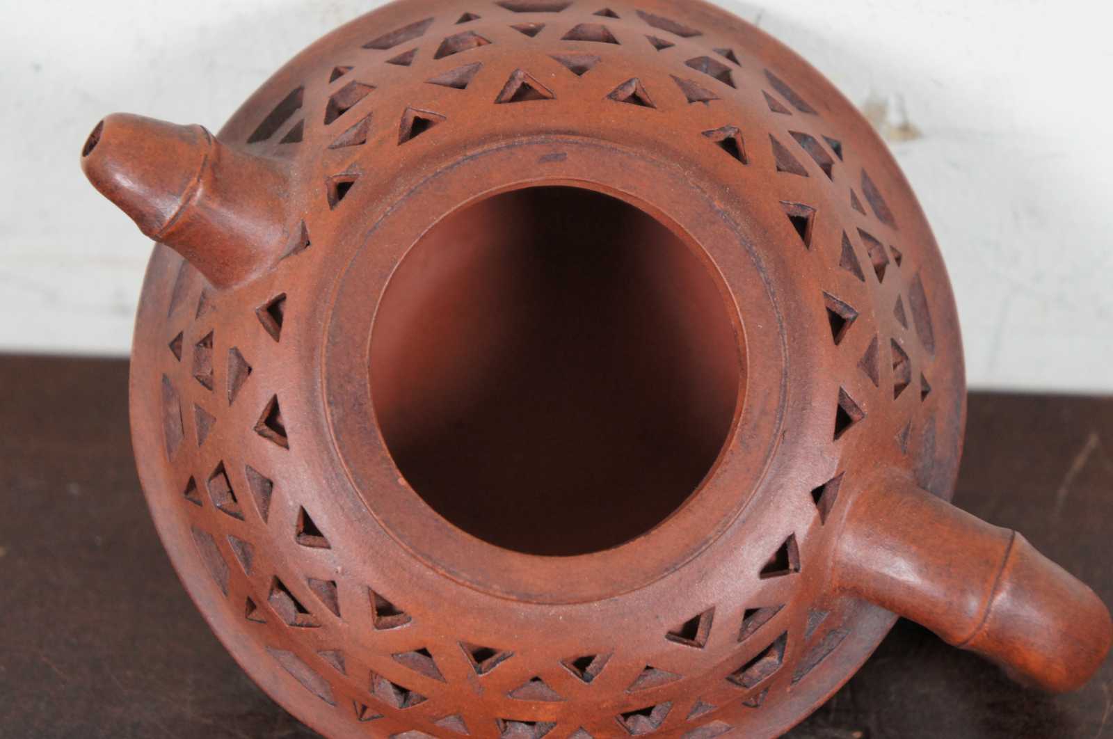 Vintage red yixing zisha Chinese ceramic teapot with faux bamboo handle and spout with a pierced double layered body. Marked on base and lid.