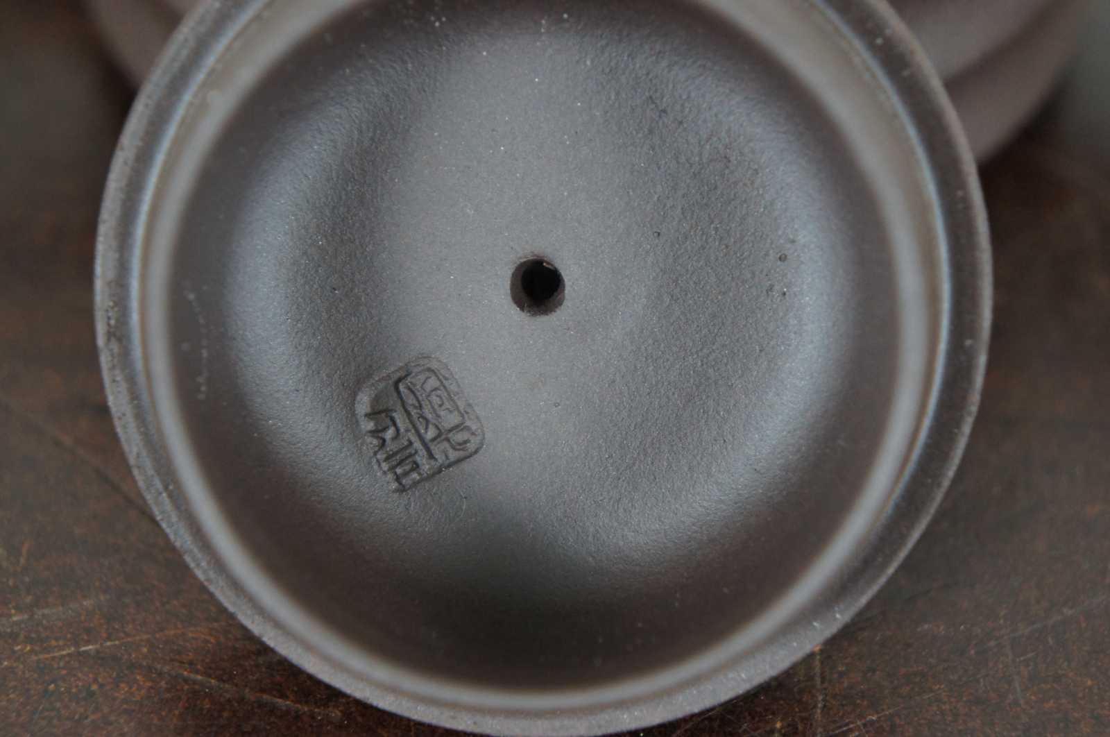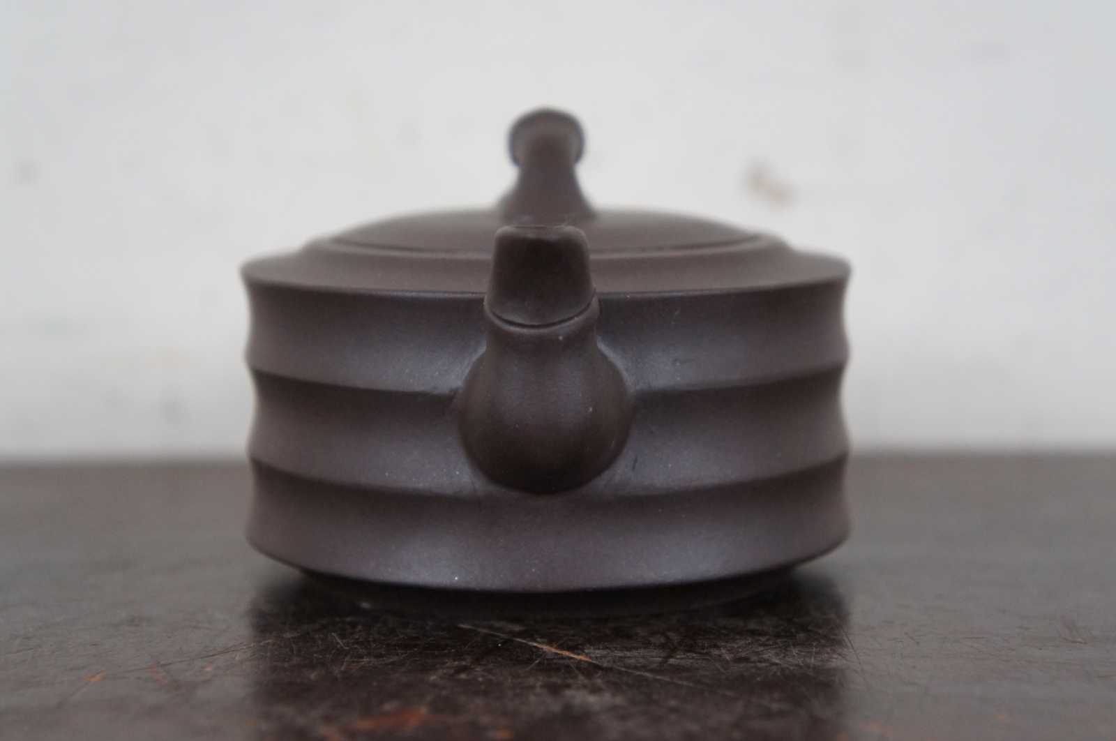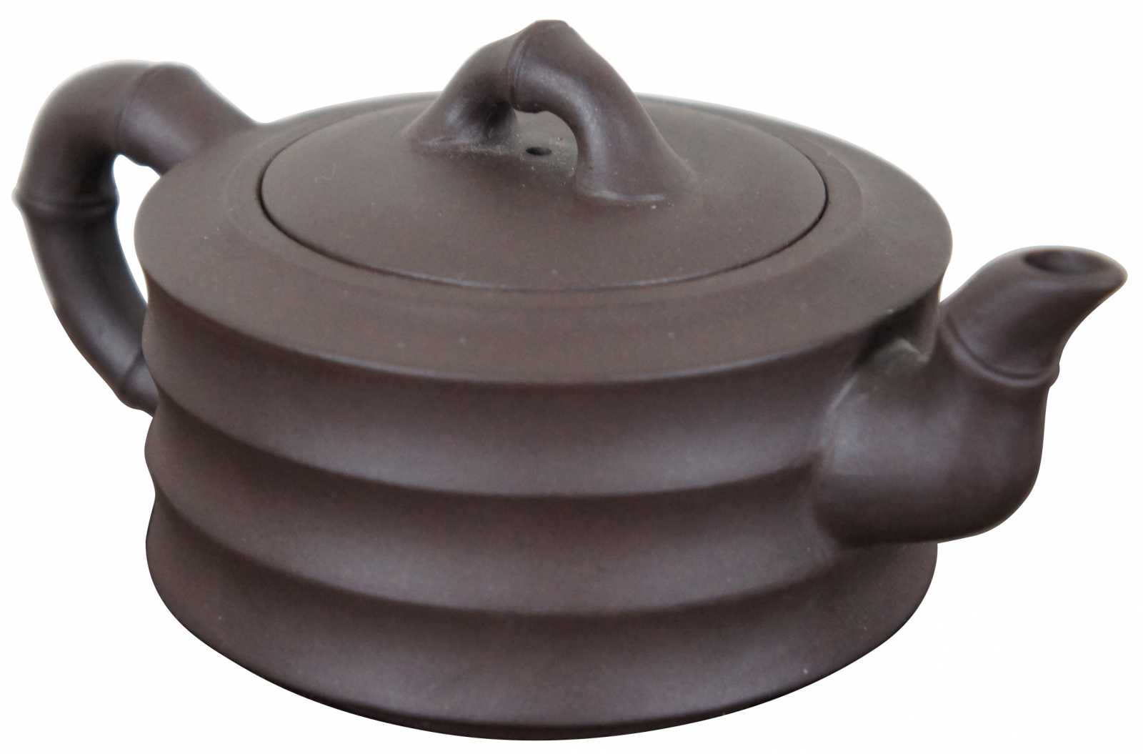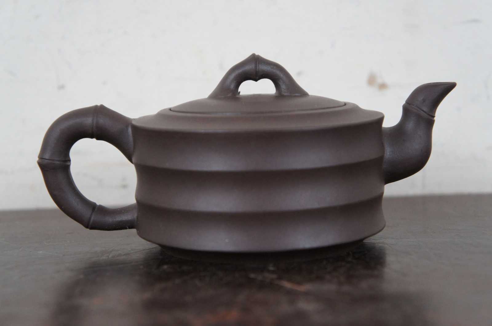 Vintage dark brown yixing zisha Chinese ceramic teapot with grooved sides and bamboo shaped spout and handle. Marked in various spots.