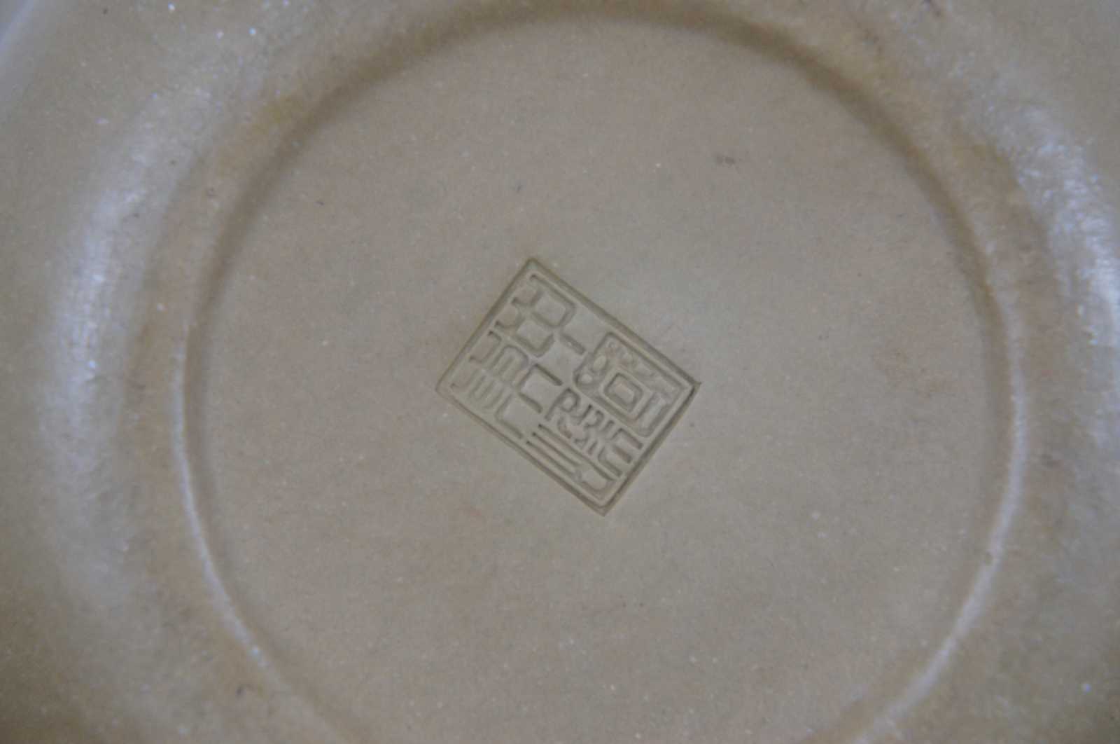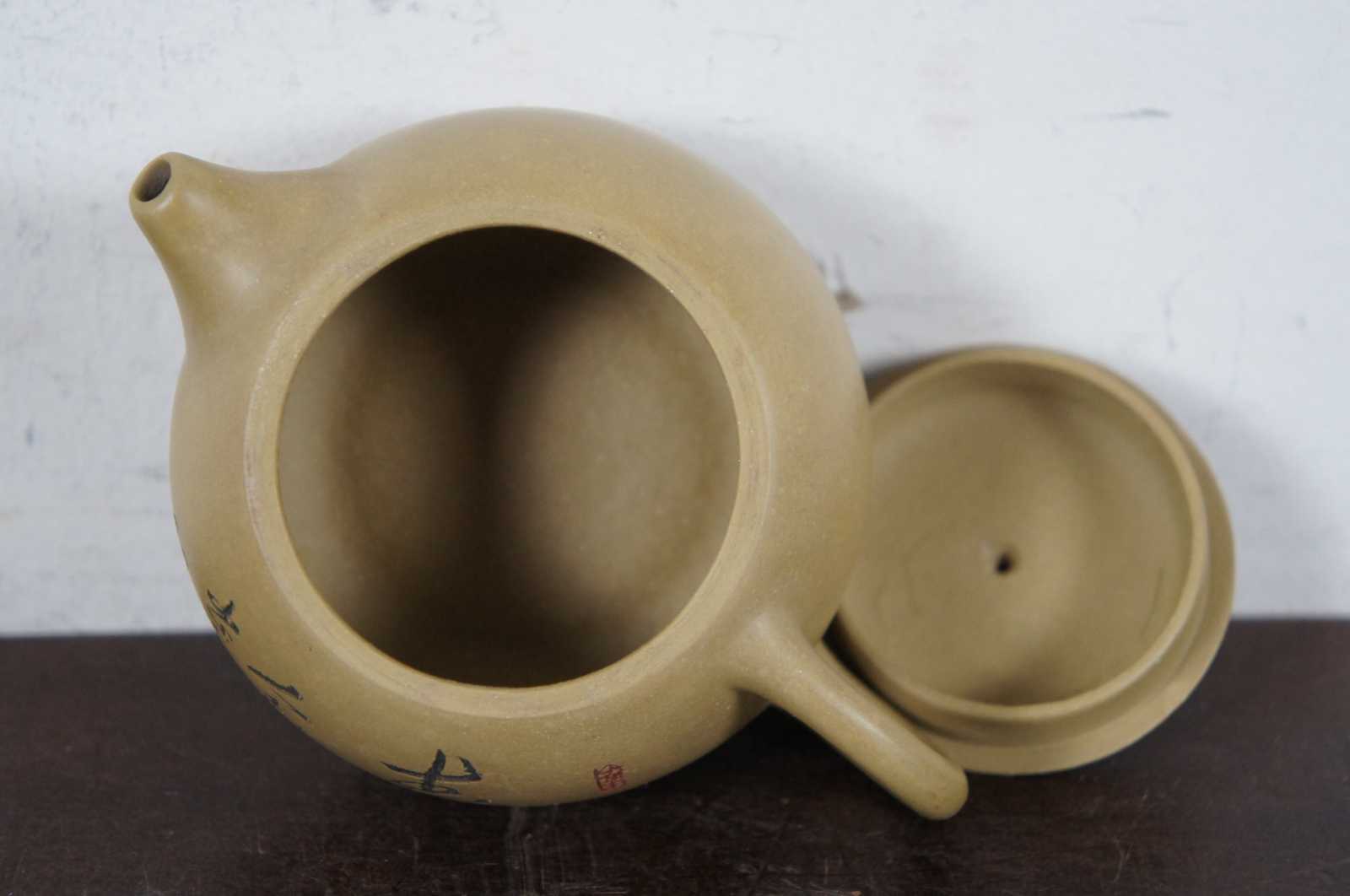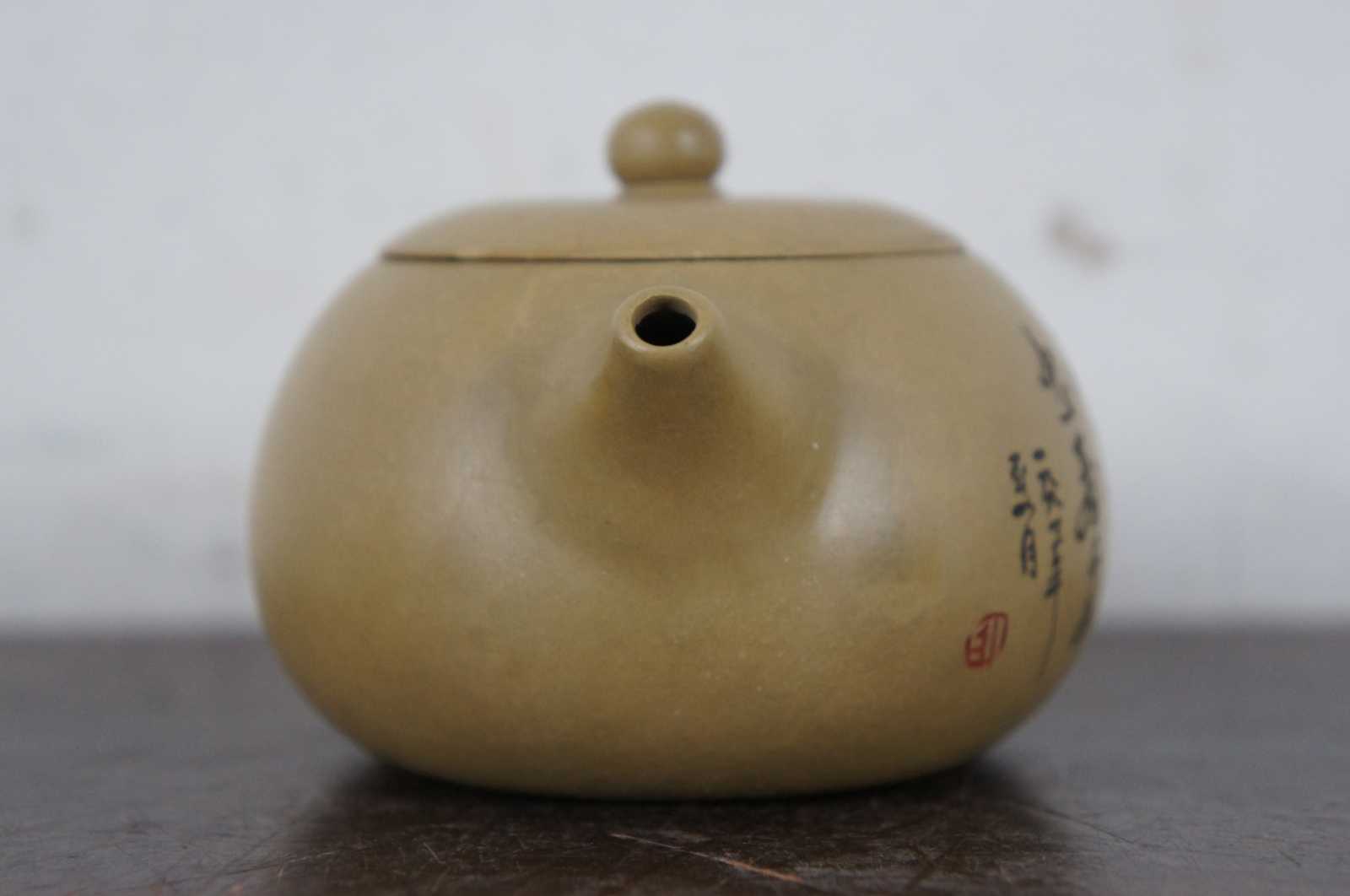 Vintage round yellow yixing zisha Chinese ceramic teapot decorated with engraved calligraphy. Marked on base.