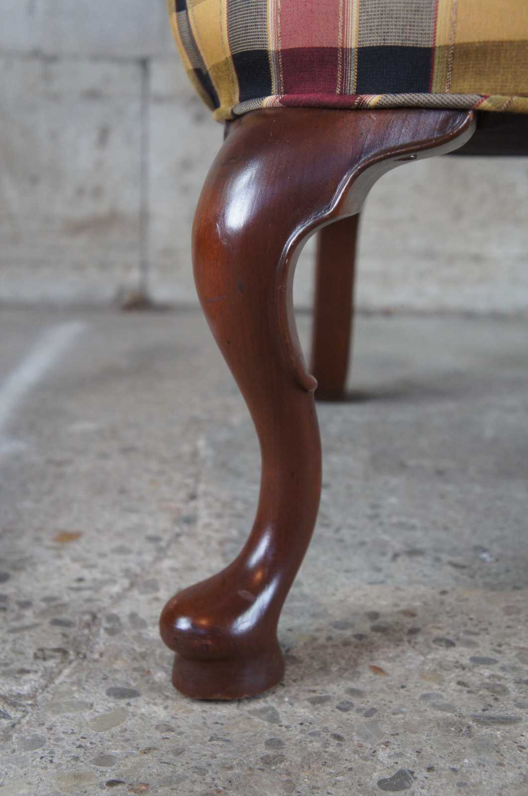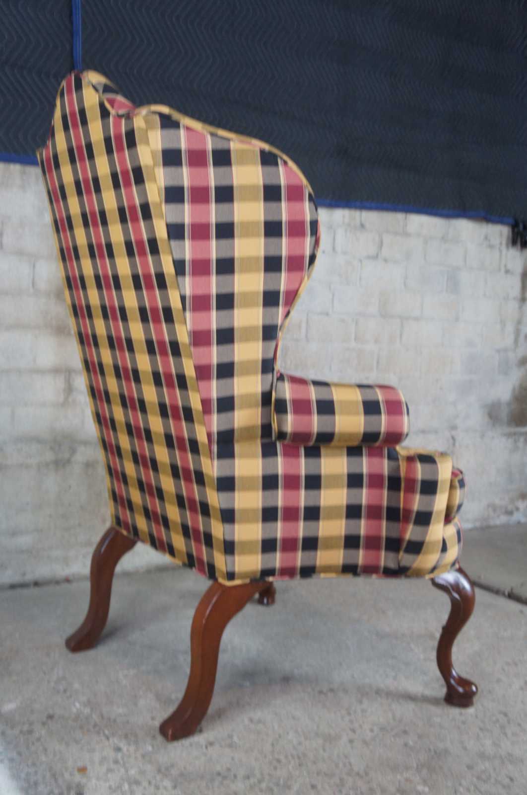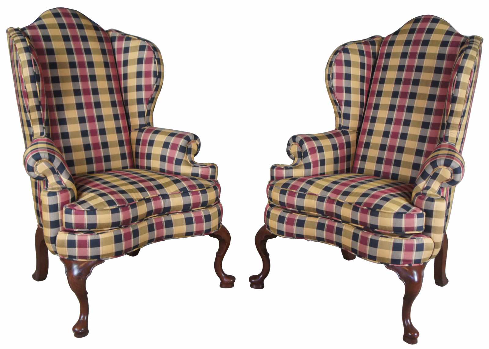 Pair of two mid century oversized wingback chairs. Made of mahogany with a wide stance, accented with rolled arms, camel back top and scrolled legs. Finished in a yellow, blue, grey, and red Robert Allen (Garbetti) plaid upholstery.