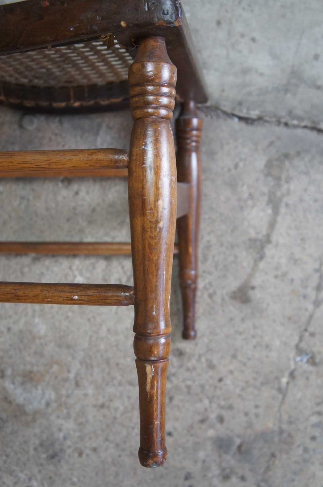Antique side dining or accent chair. Made of pine with caned seat and turned from legs.