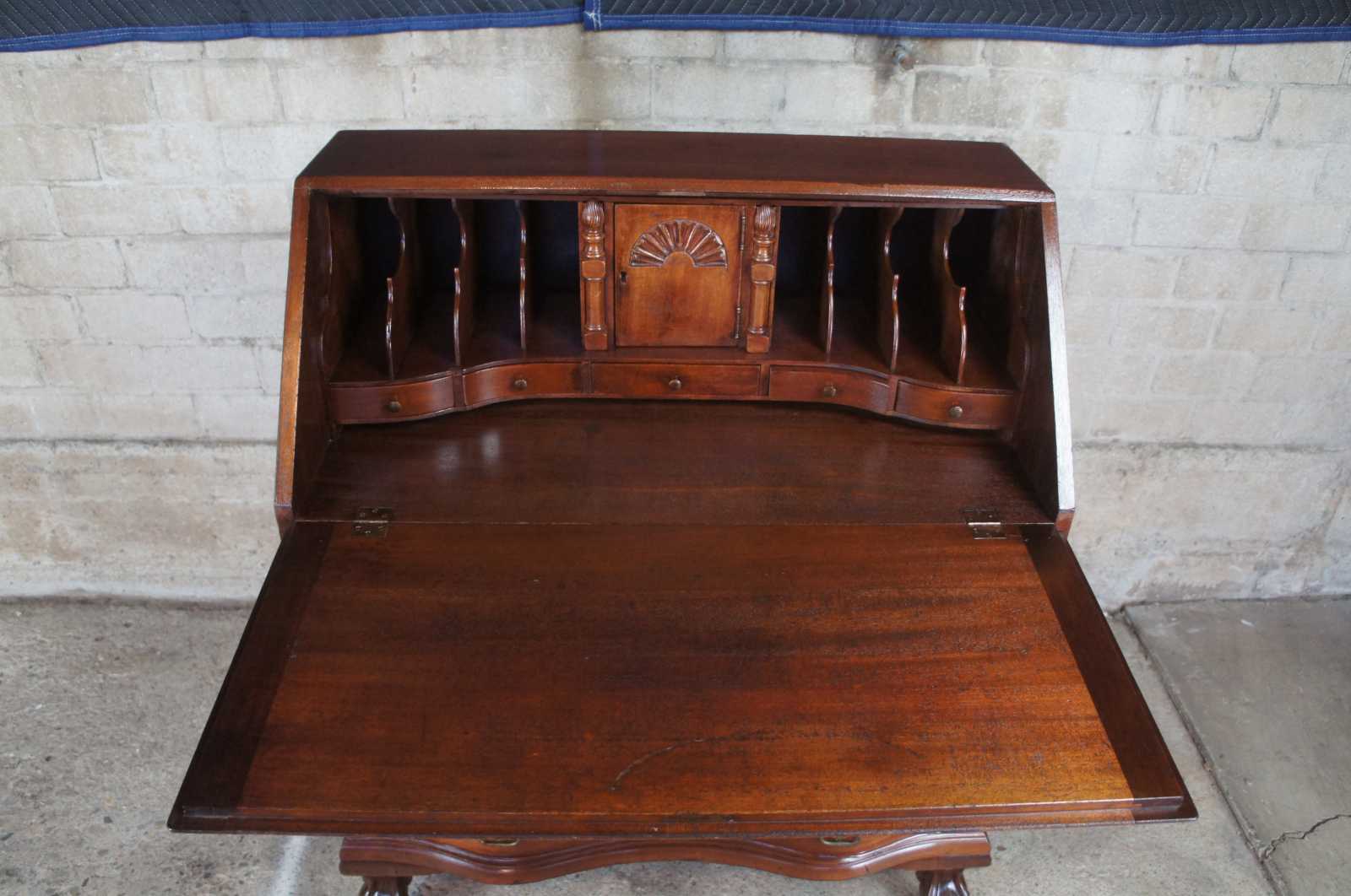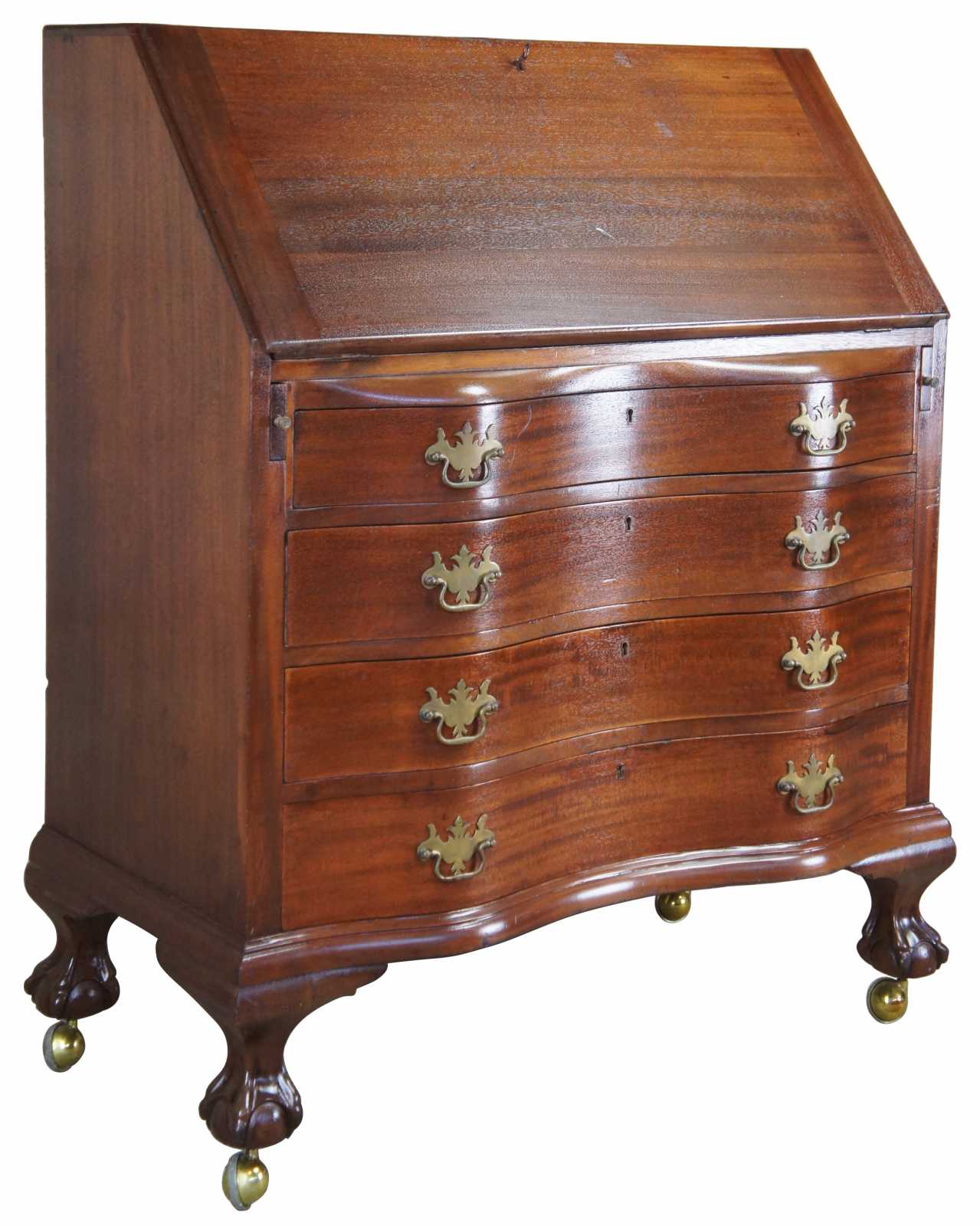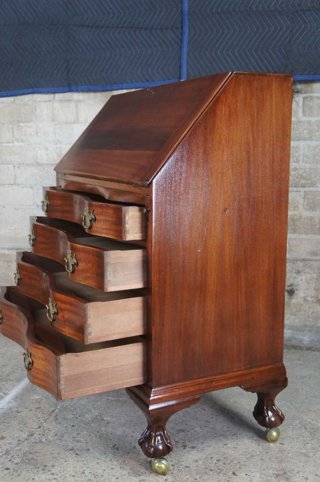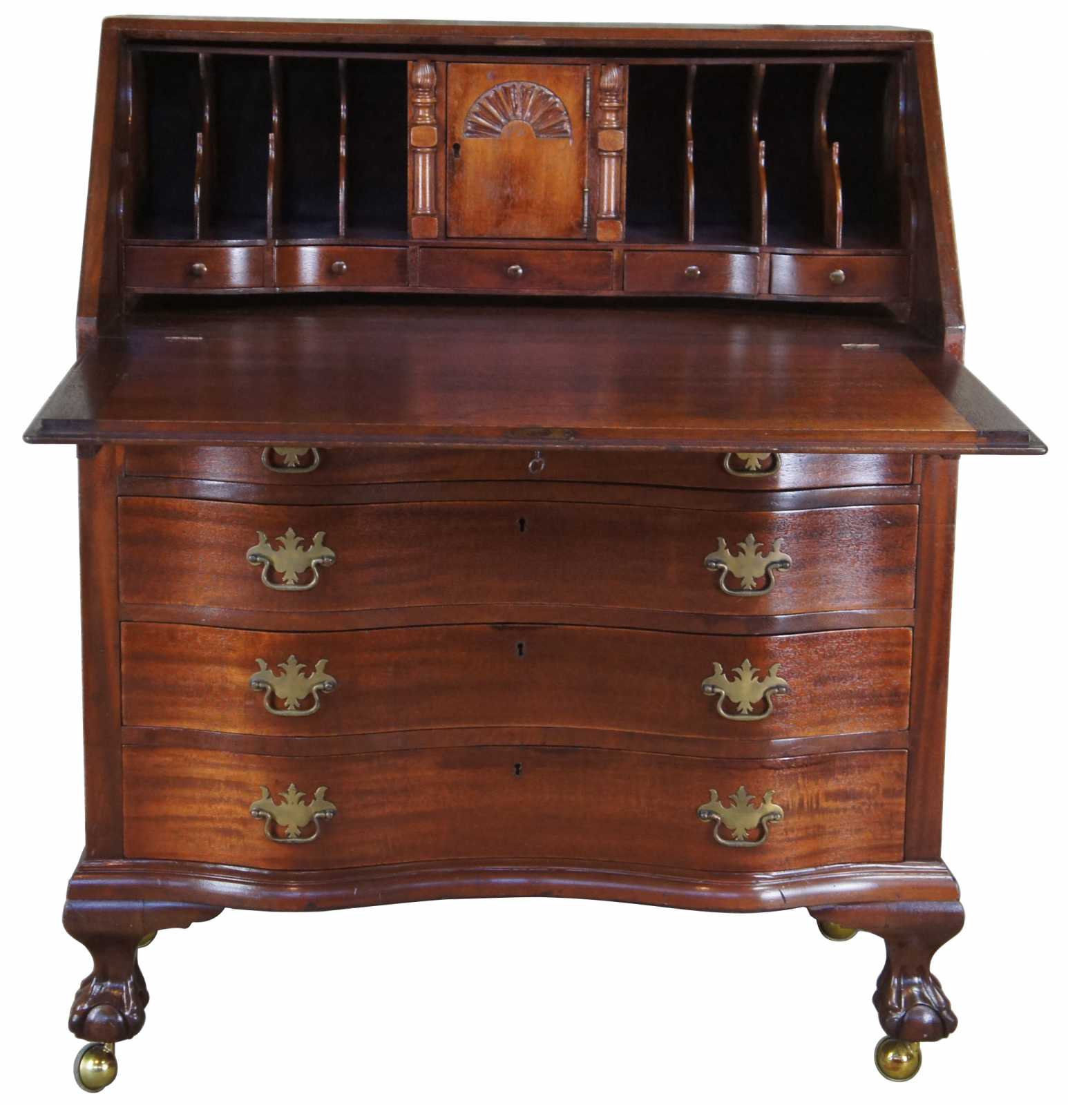 Antique mahogany secretary or writing desk, circa 1930s. Featuring a flip top that opens to multiple drawers, file storage and hidden compartments. The dresser or chest is constructed with an oxbow front with four drawers over ball and claw feet.