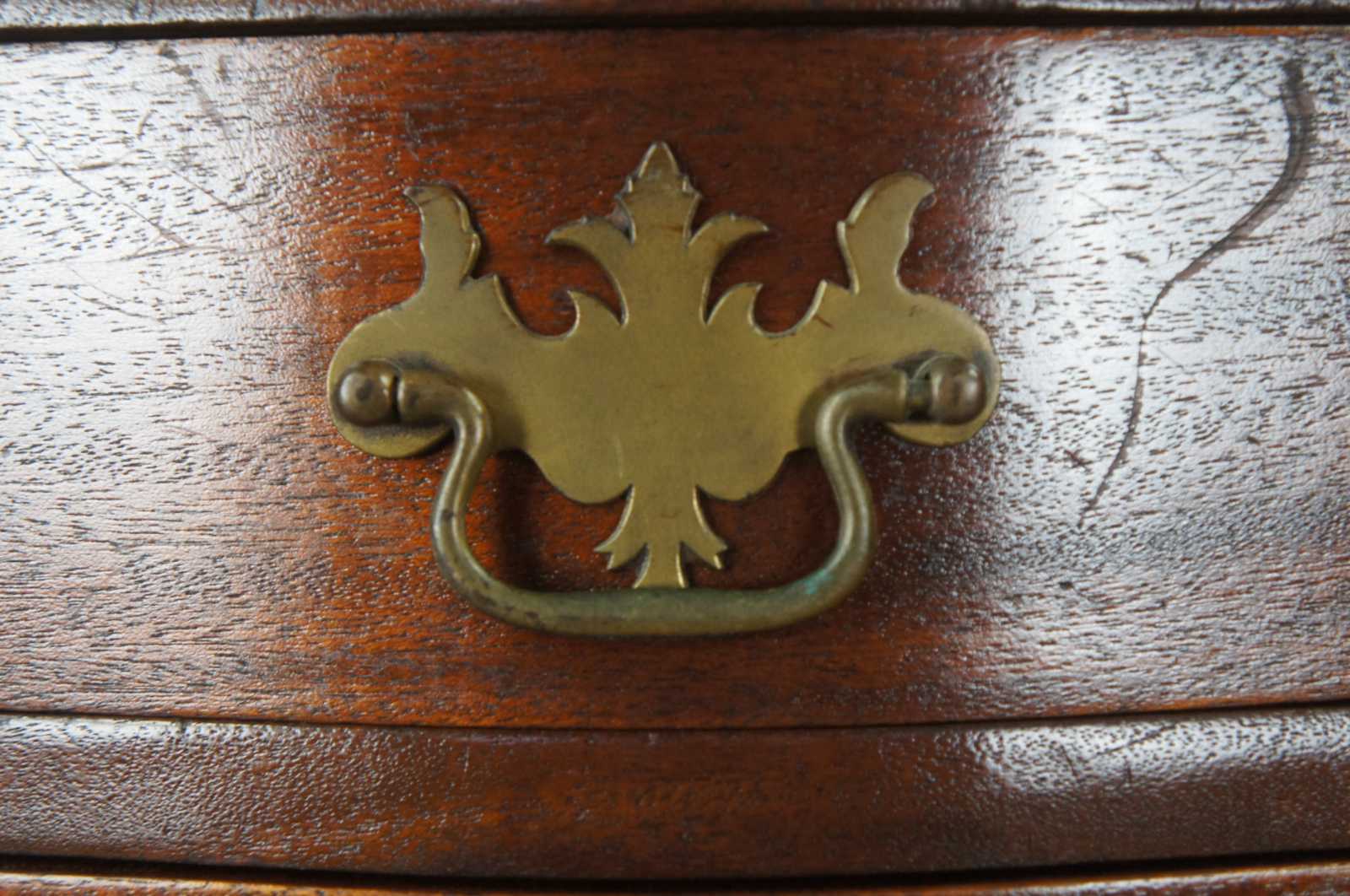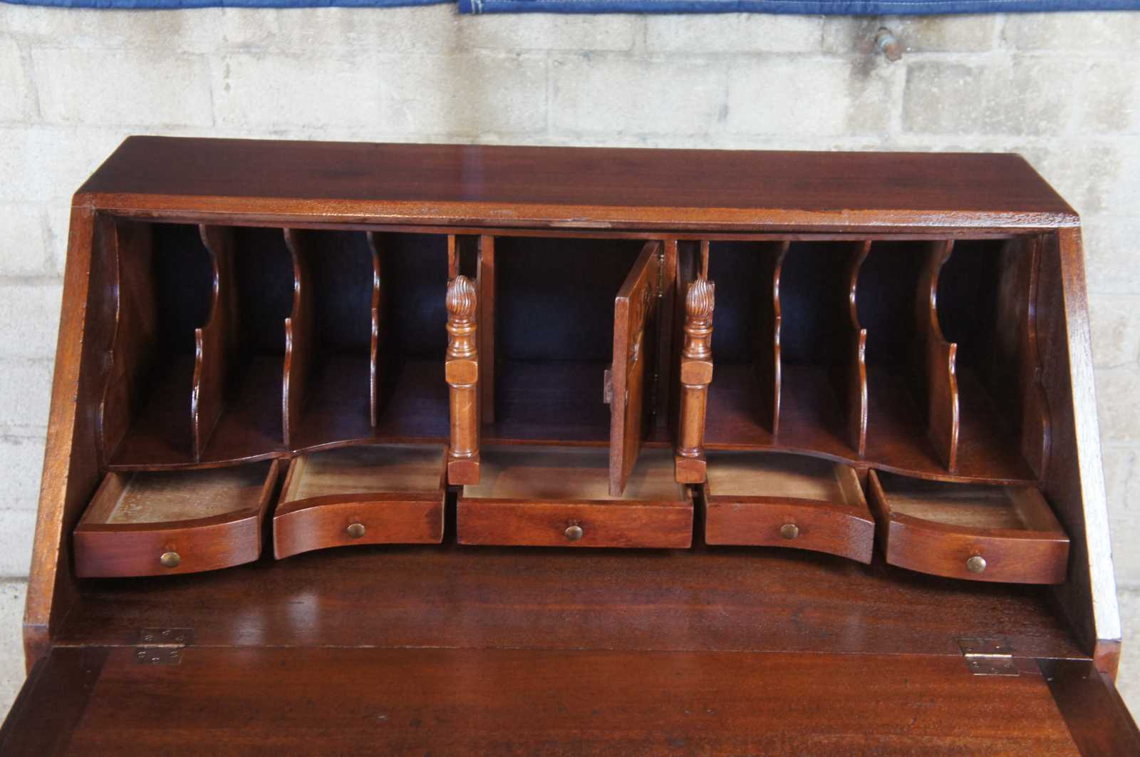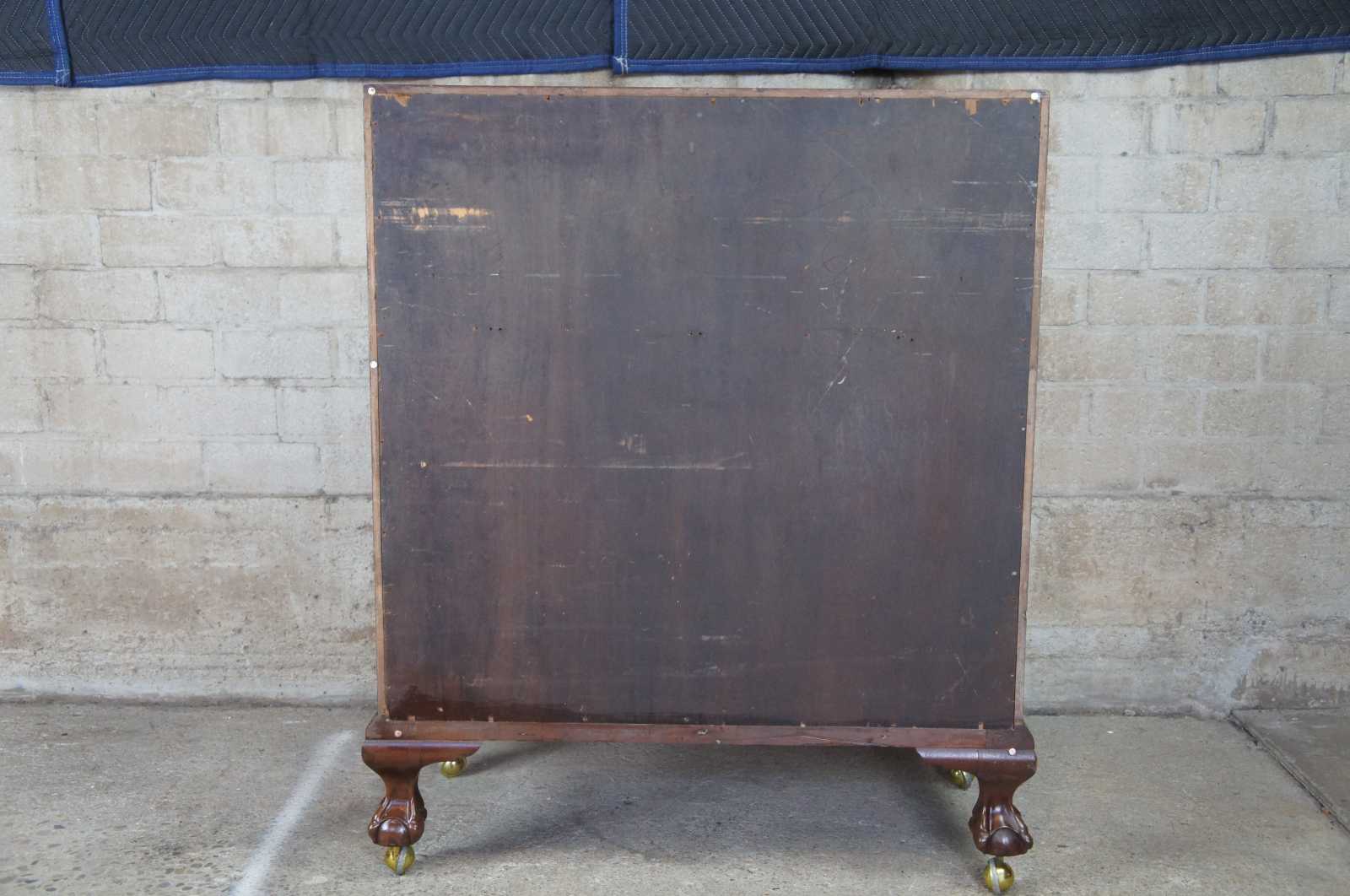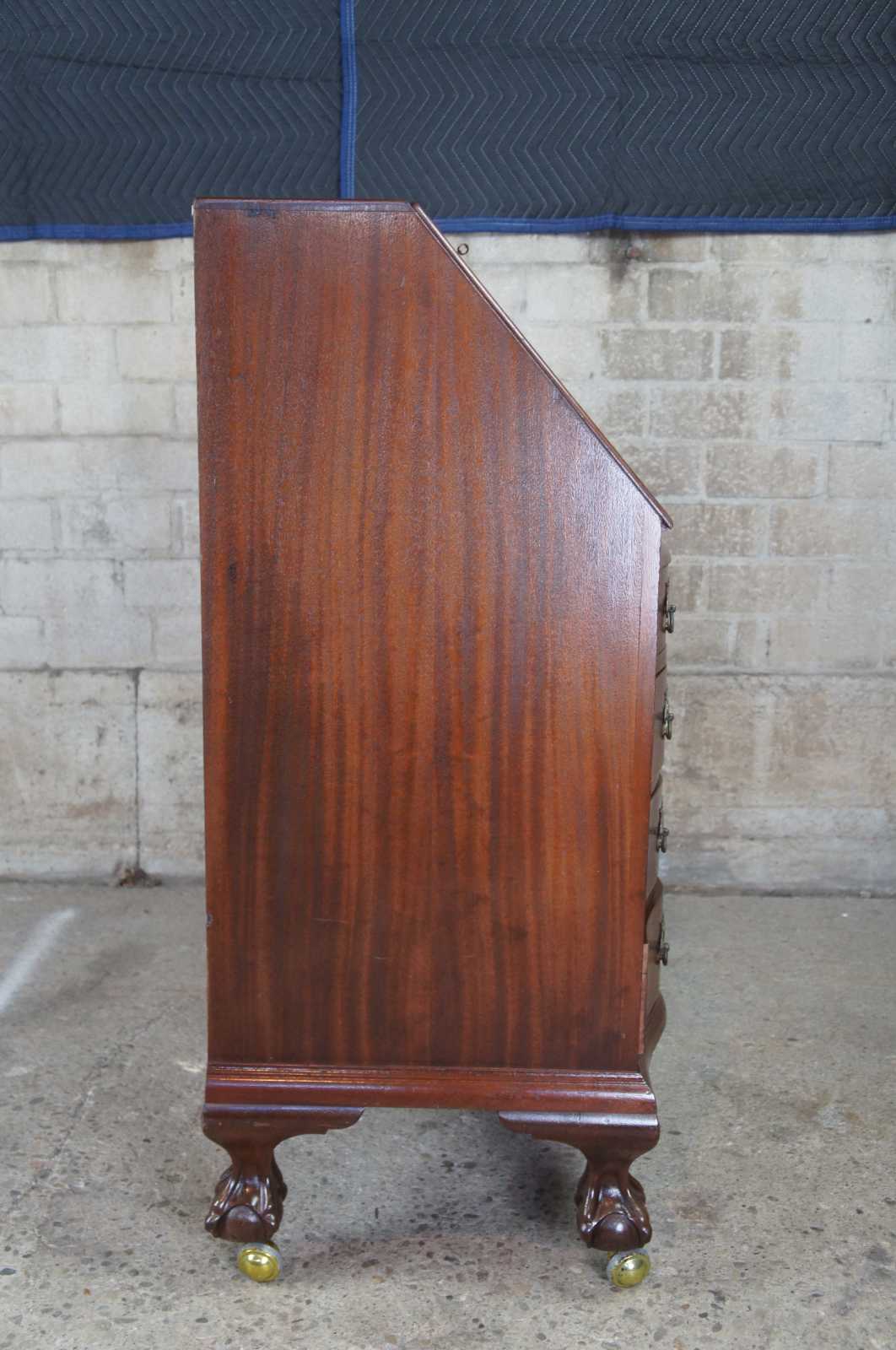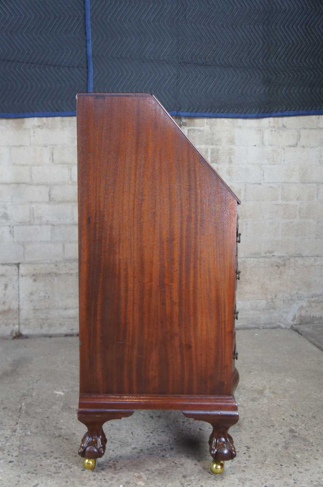 Antique mahogany secretary or writing desk, circa 1930s. Featuring a flip top that opens to multiple drawers, file storage and hidden compartments. The dresser or chest is constructed with an oxbow front with four drawers over ball and claw feet.