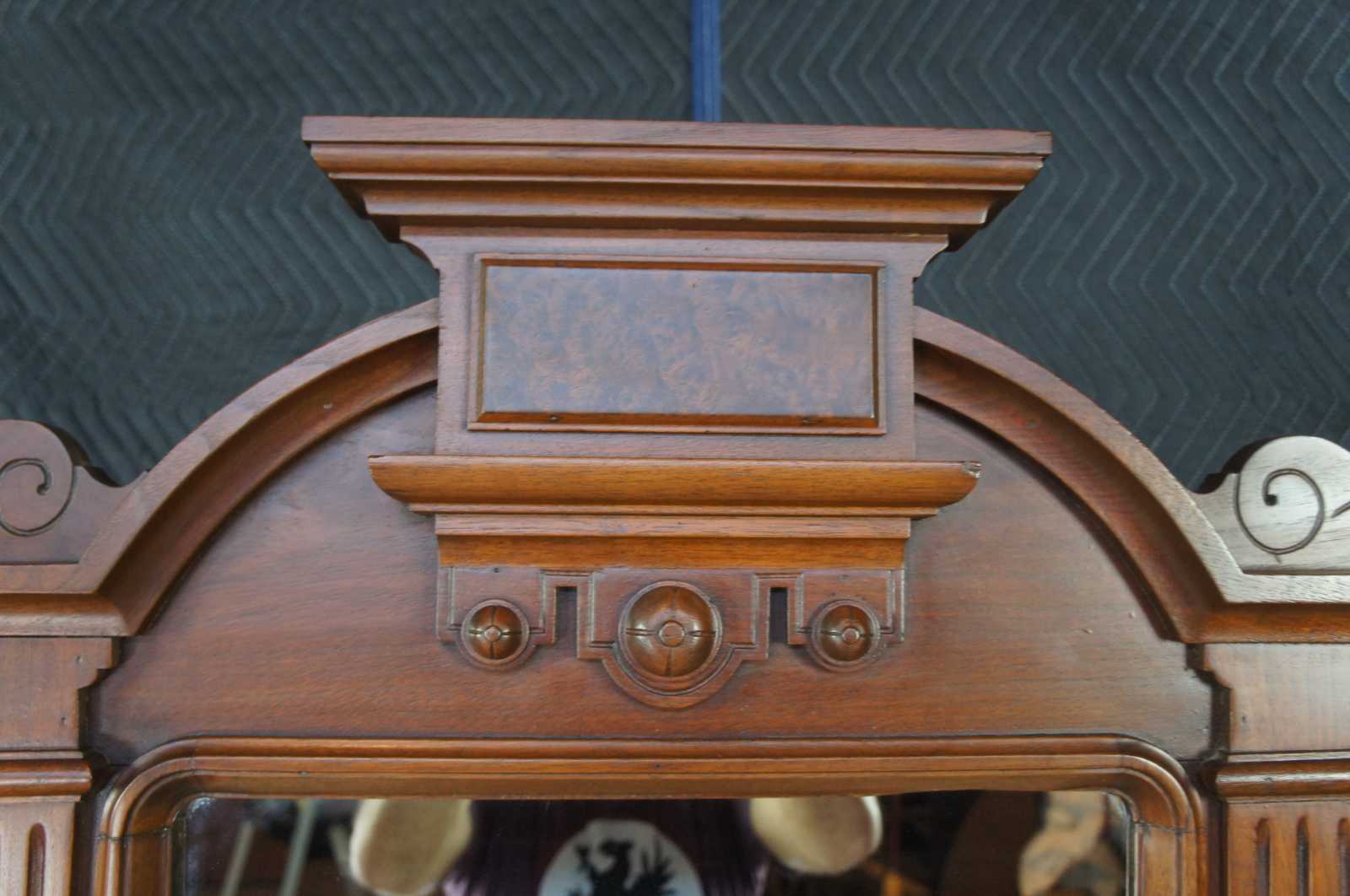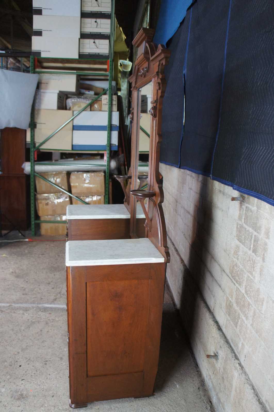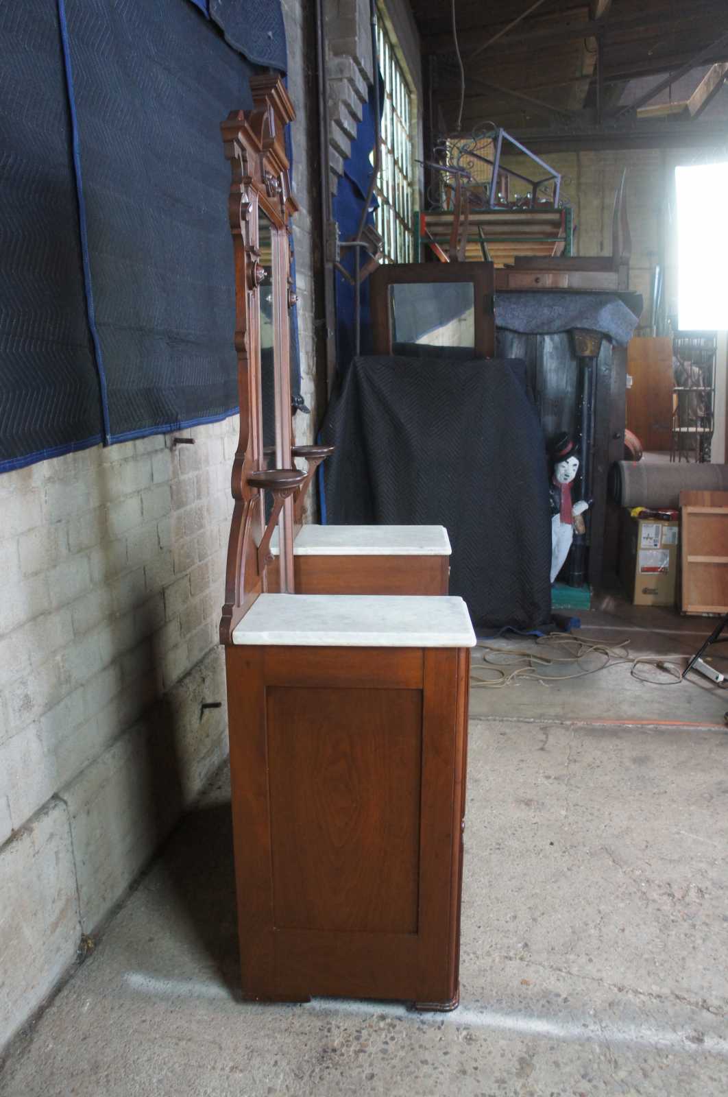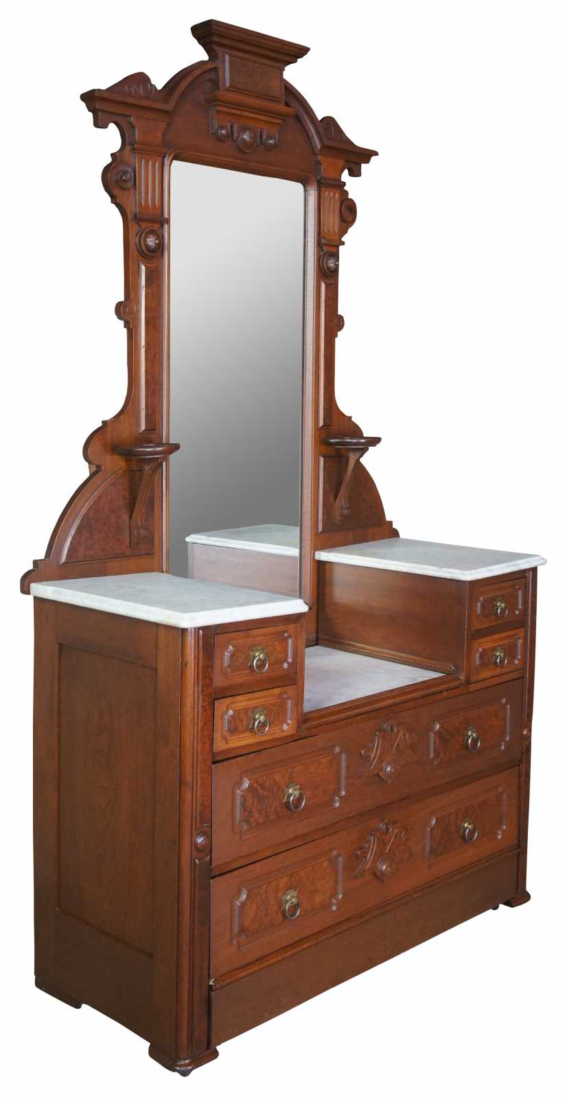 Antique Victorian Eastlake gentleman's dresser or vanity. Made of walnut featuring carved burl panels and ornate fluted and turned accents. The dresser has two candle or shaving stands, three marble tops, four small drawers and two larger, all accented with brass ring pulls and constructed with mortis and tendon joints.