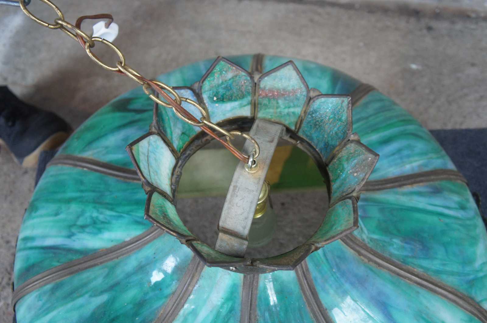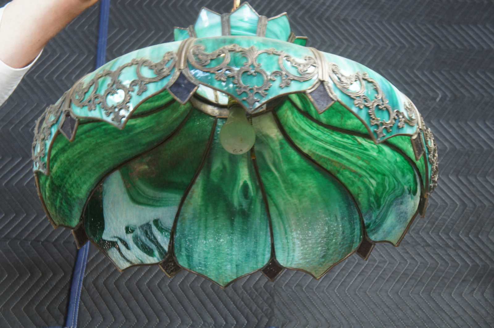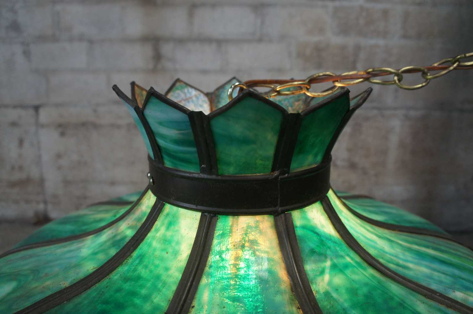 Antique Victorian slag glass swag light or chandelier. Made with an iron and metal frame with scrolled accents over dramatic green slag glass accented with ruby red diamond tips.
