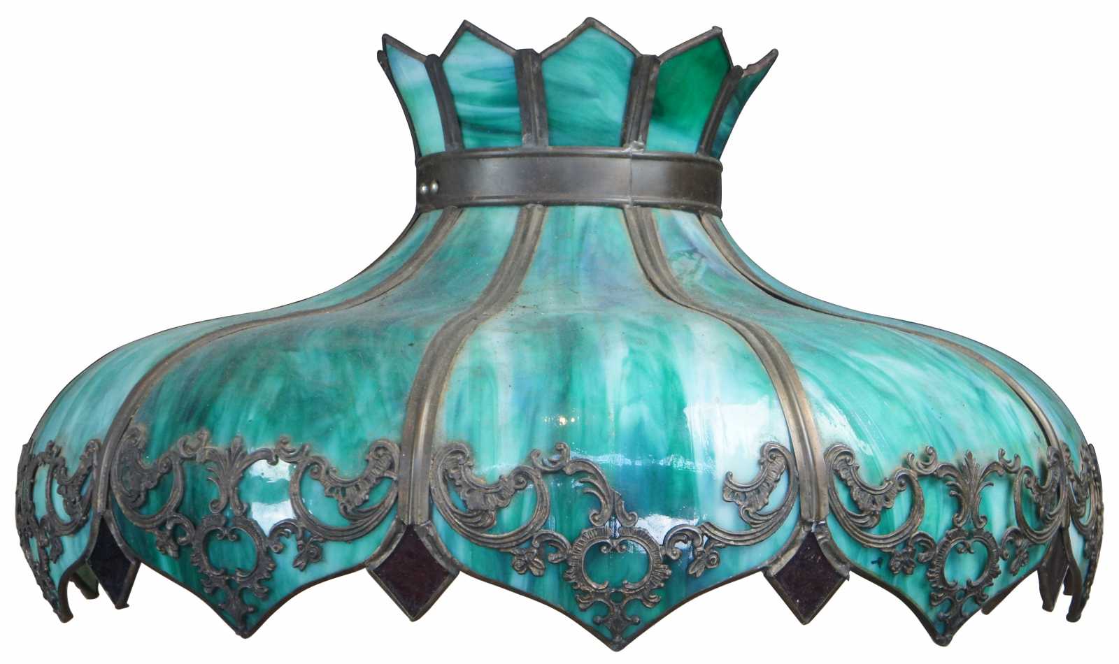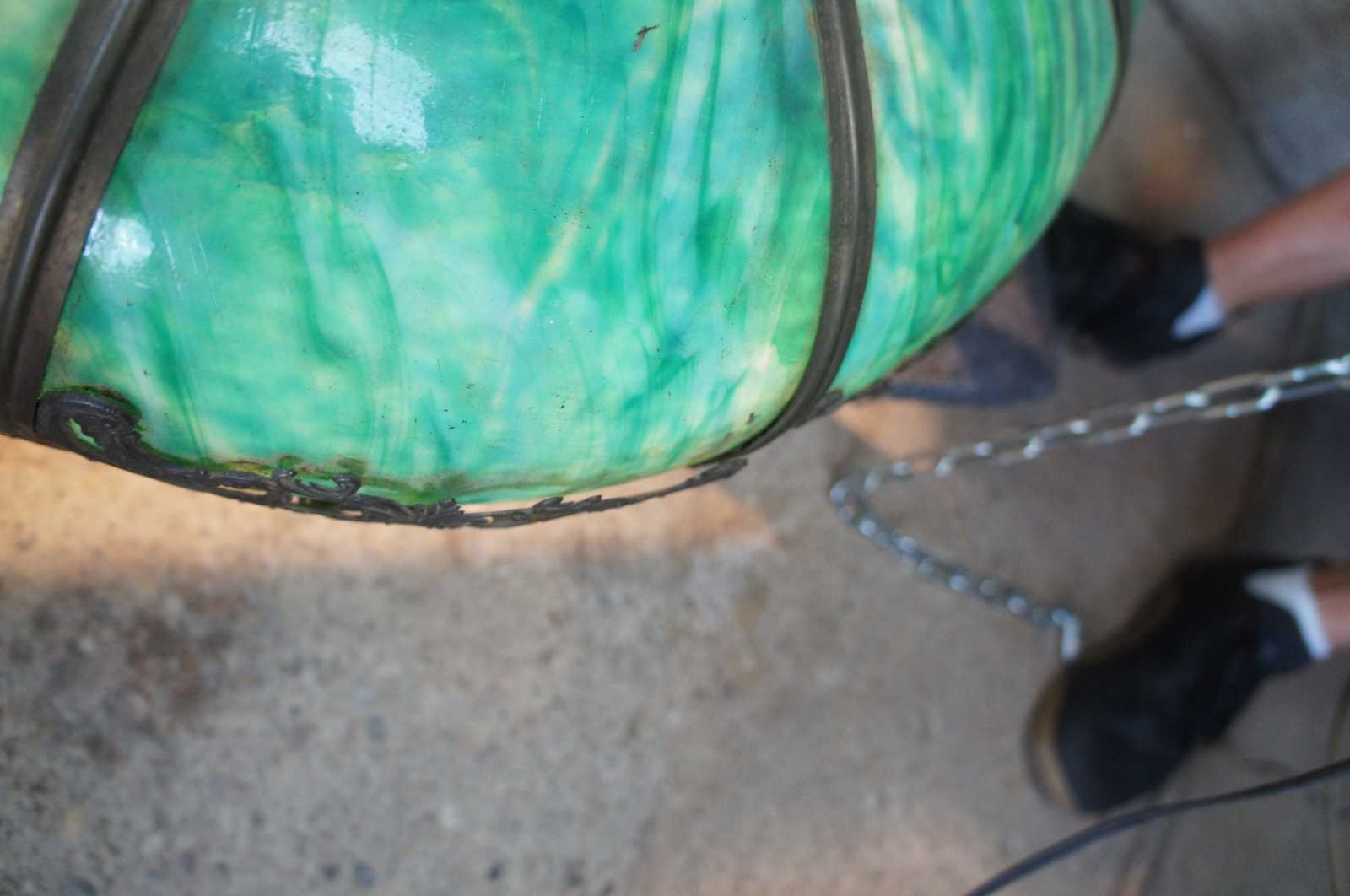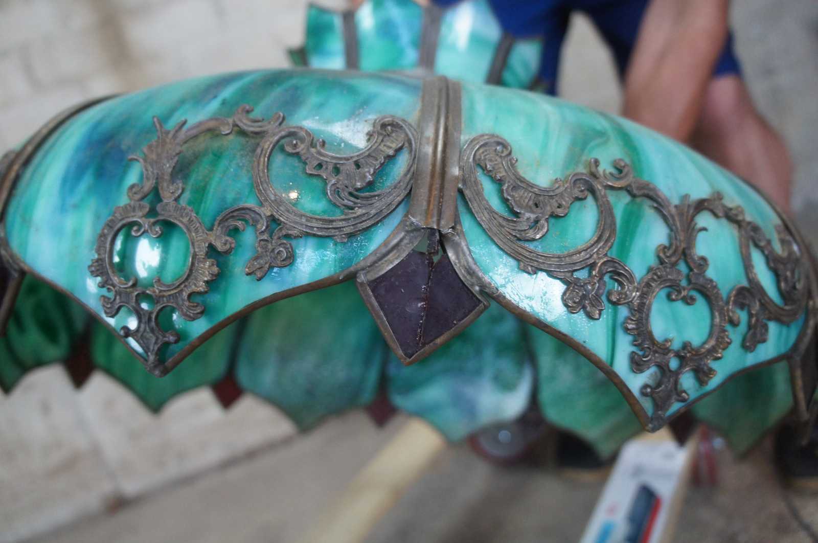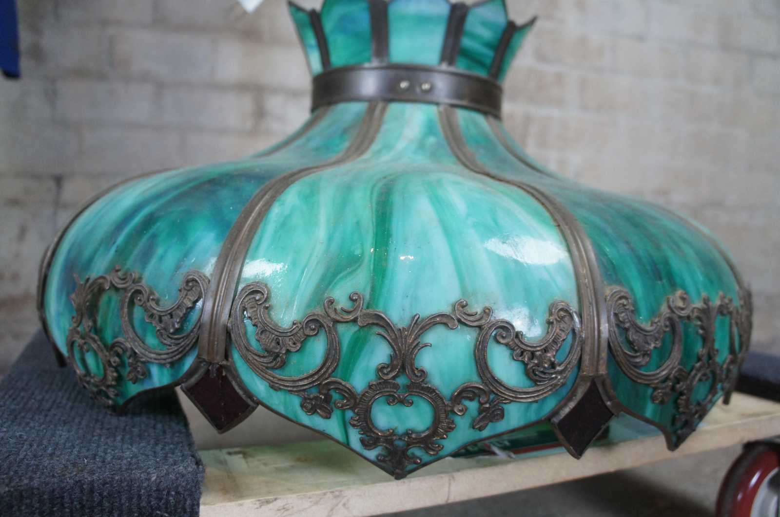 Antique Victorian slag glass swag light or chandelier. Made with an iron and metal frame with scrolled accents over dramatic green slag glass accented with ruby red diamond tips.