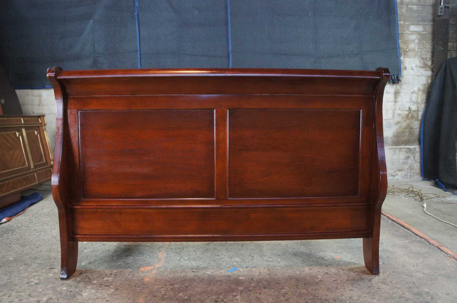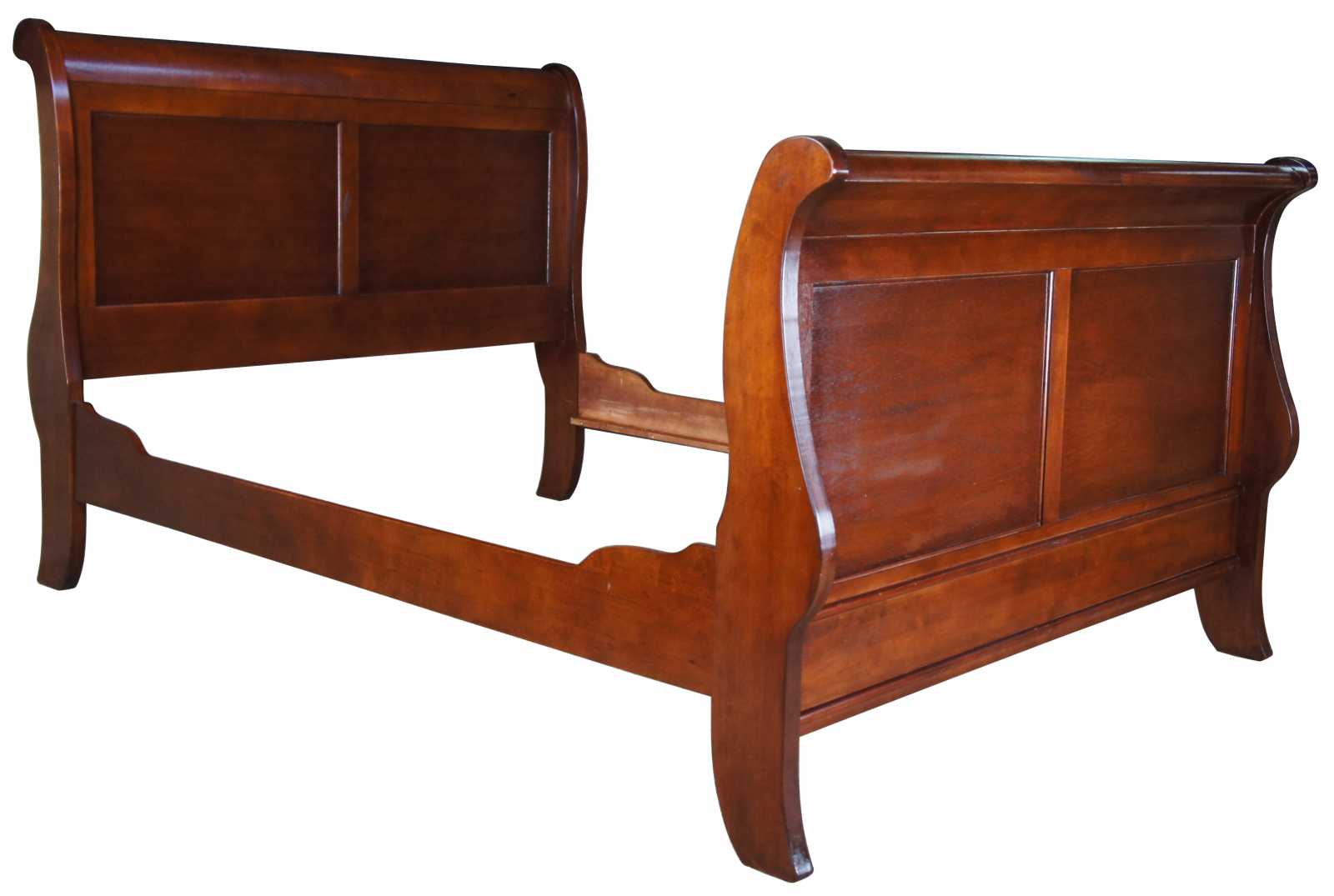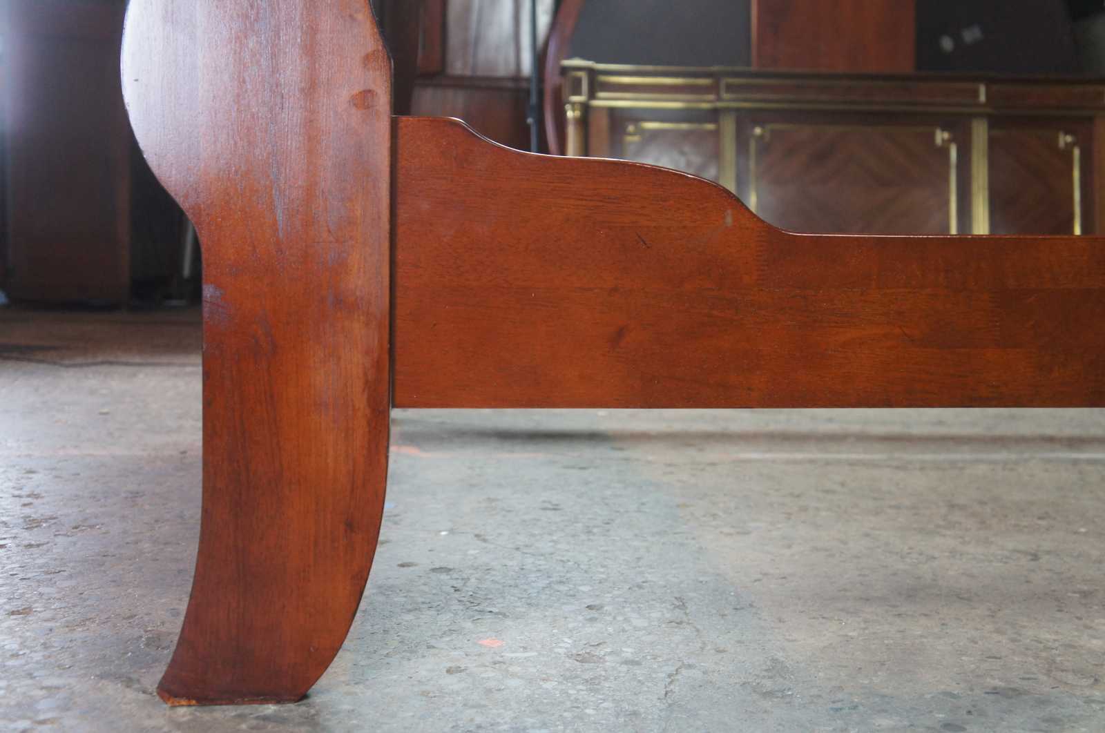 Vintage queen sized sleigh bed featuring paneled head and foot boards with serpentine shape and flared feet. Made of birch with a mahogany finish.