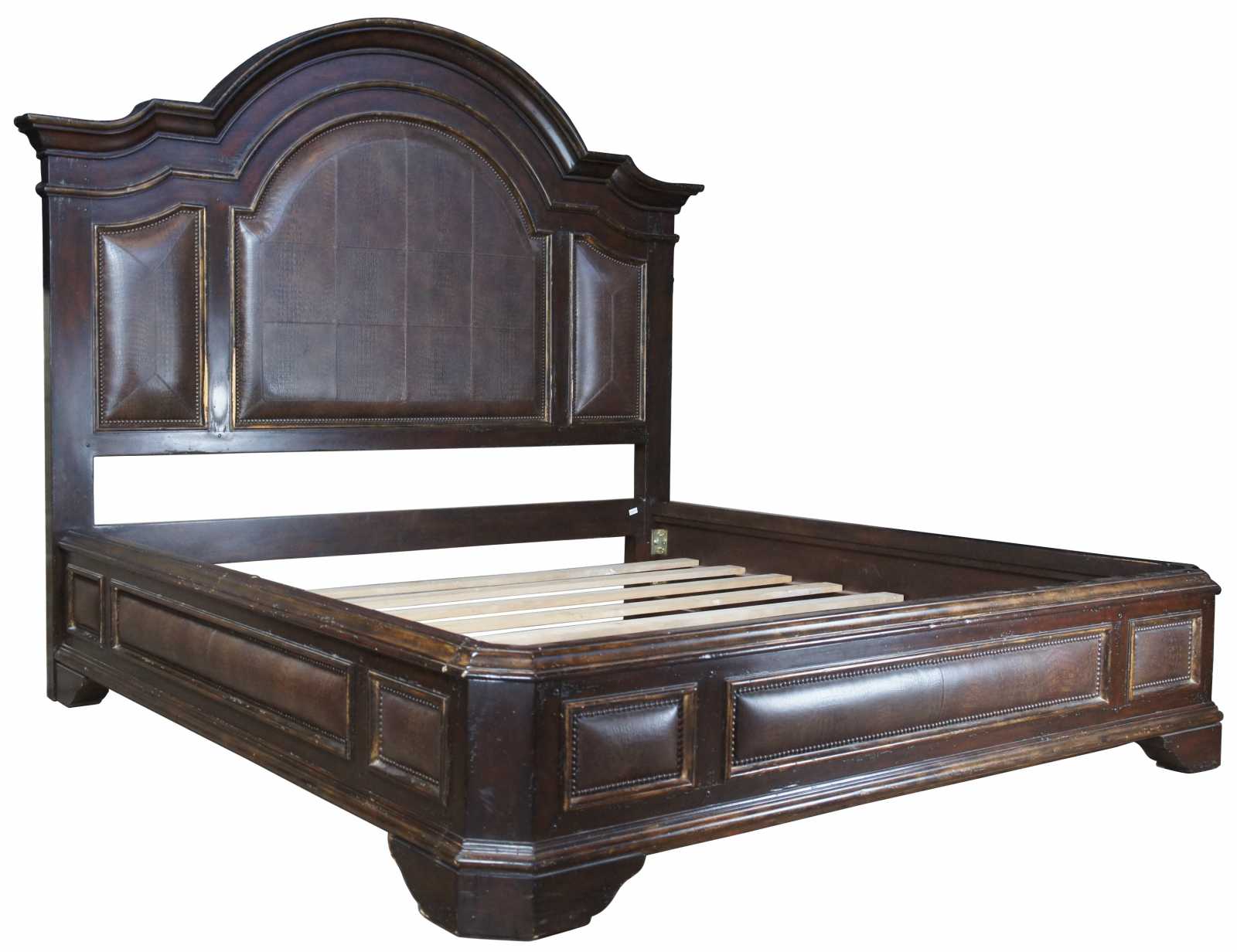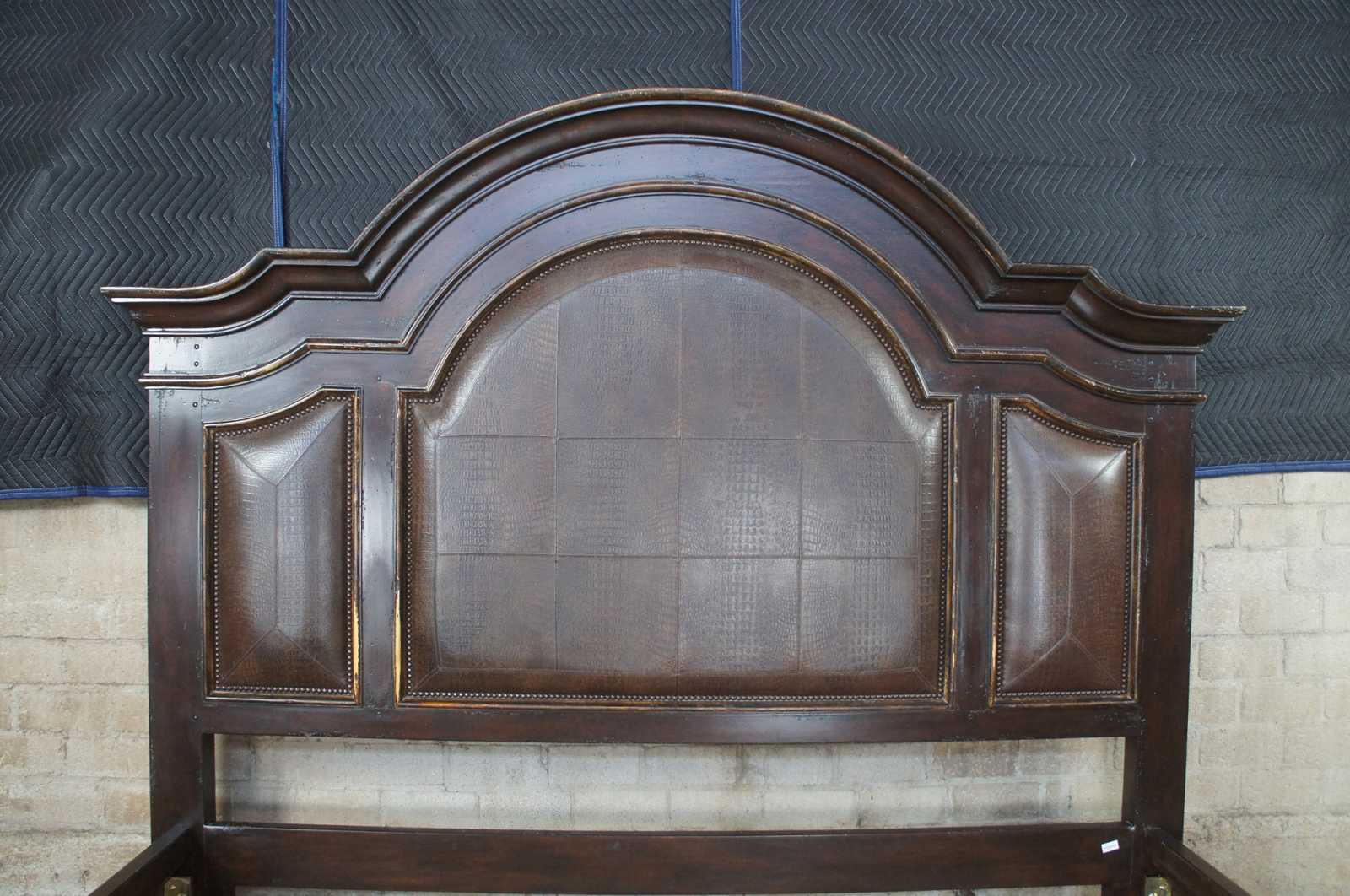 Vintage King size Marge Carson Georgia Bed in Antique Chestnut finish with high-grade Italian leather, detailed hand carvings with gold accent, domed crown molding, and oversized legs. Leather features engraved crocodile pattern surrounded with brass nailheads.