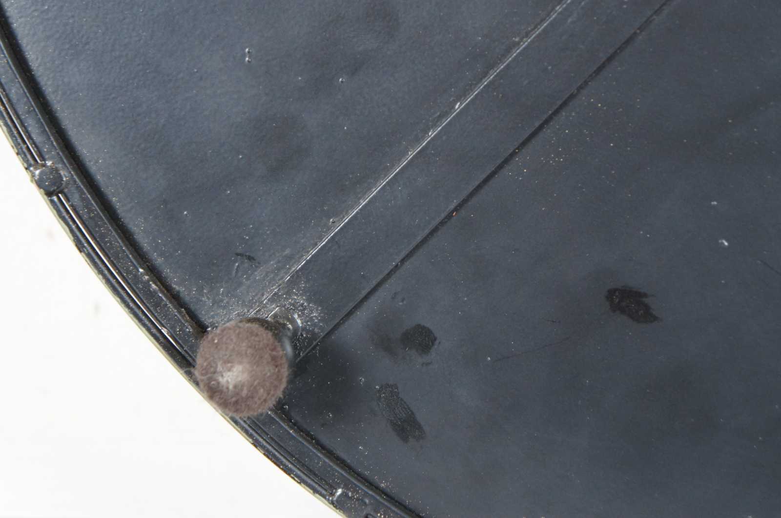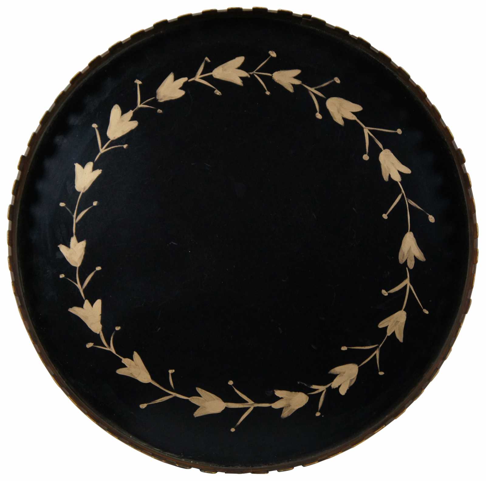Vintage round black toleware tray with ball feet, crenelated / notched gallery edge and painted with a wreath of golden flowers.