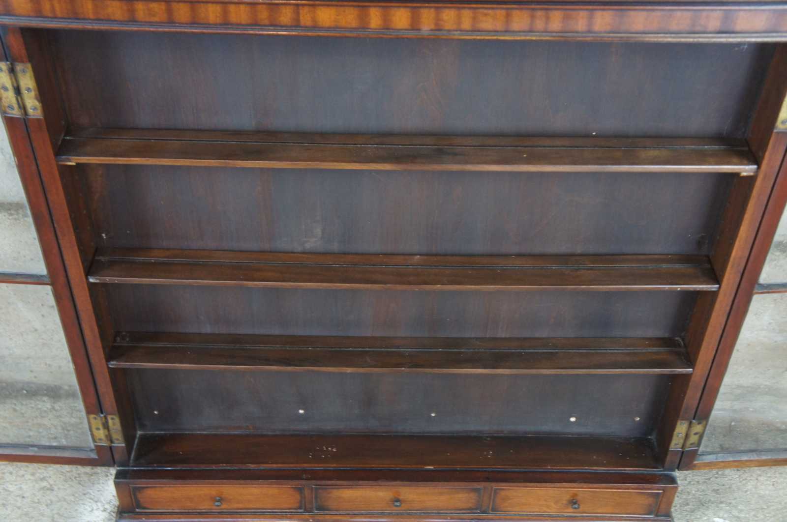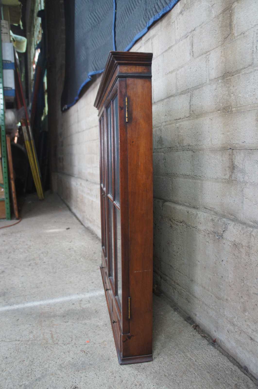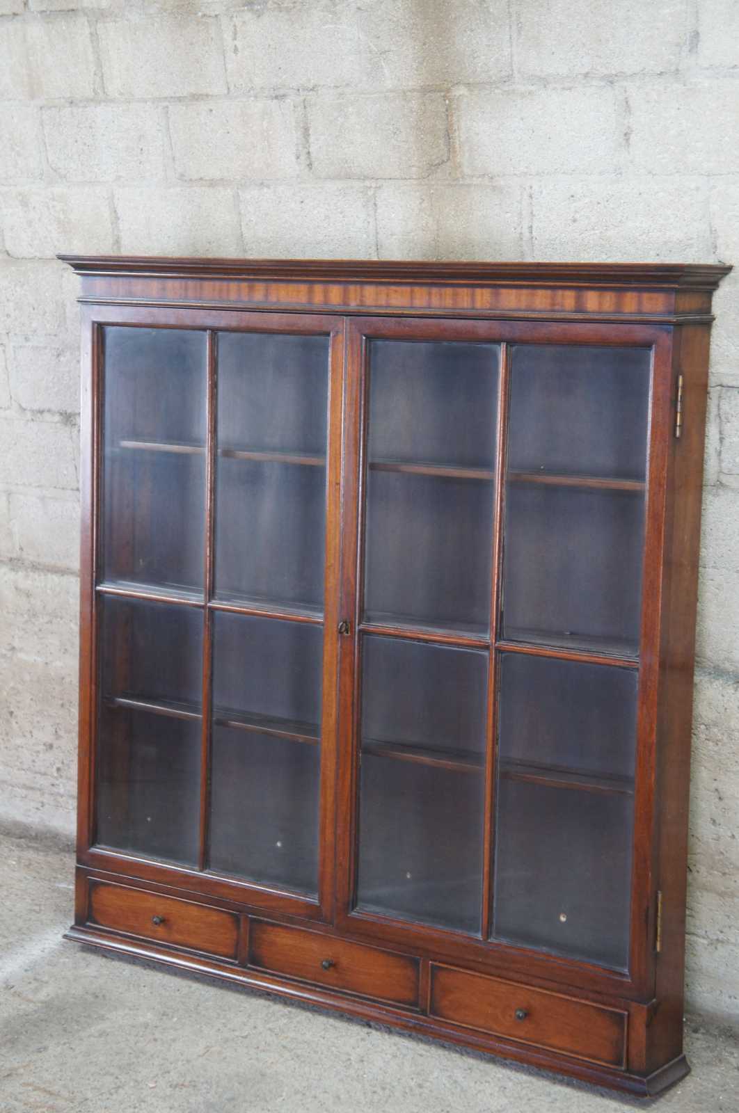 Petite wall curio or display cabinet in the manner of Georgian styling, Circa mid 20th century. Made of mahogany featuring three interior adjustable wood shelves, paned glass doors, and three lower drawers.