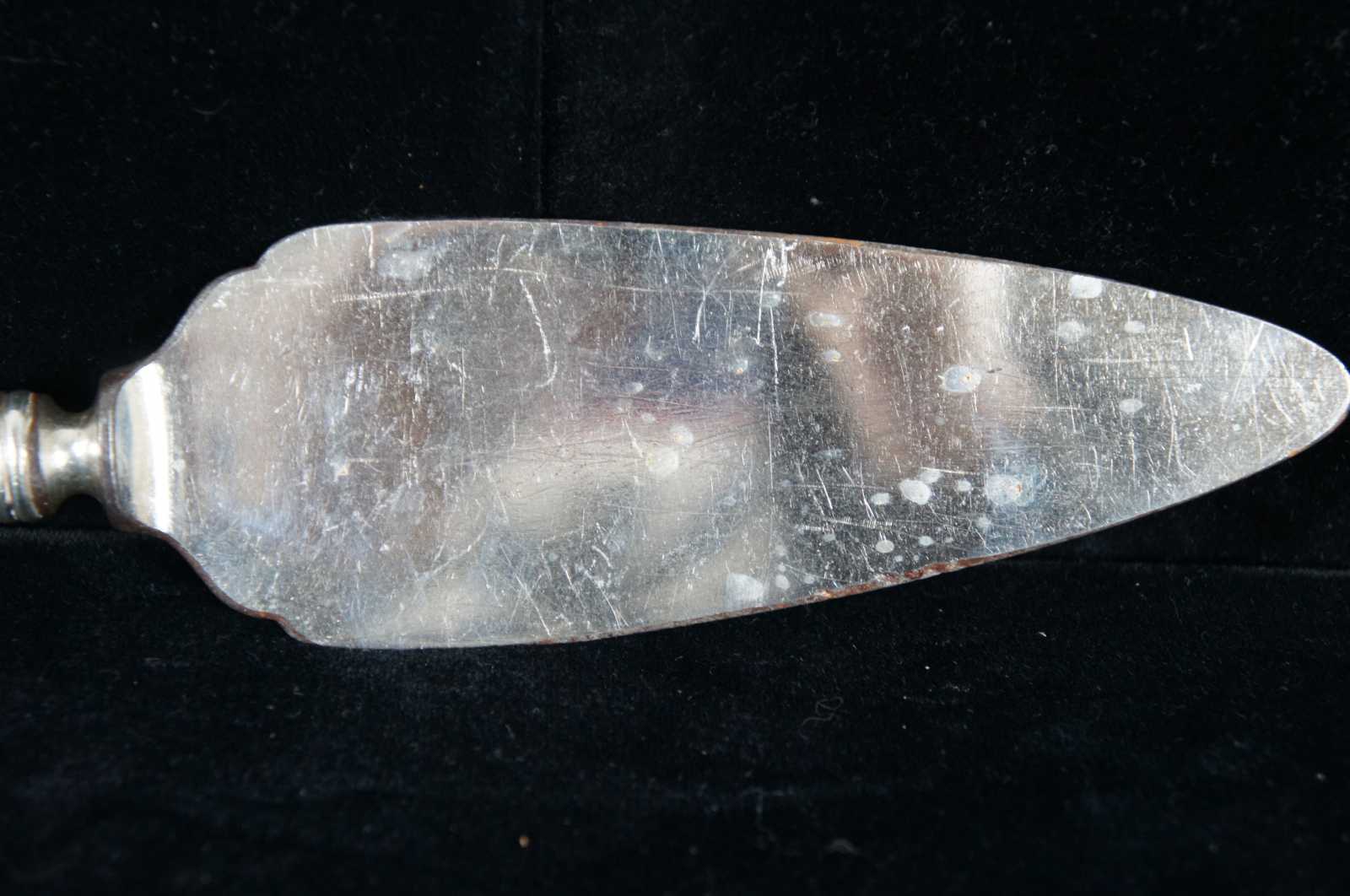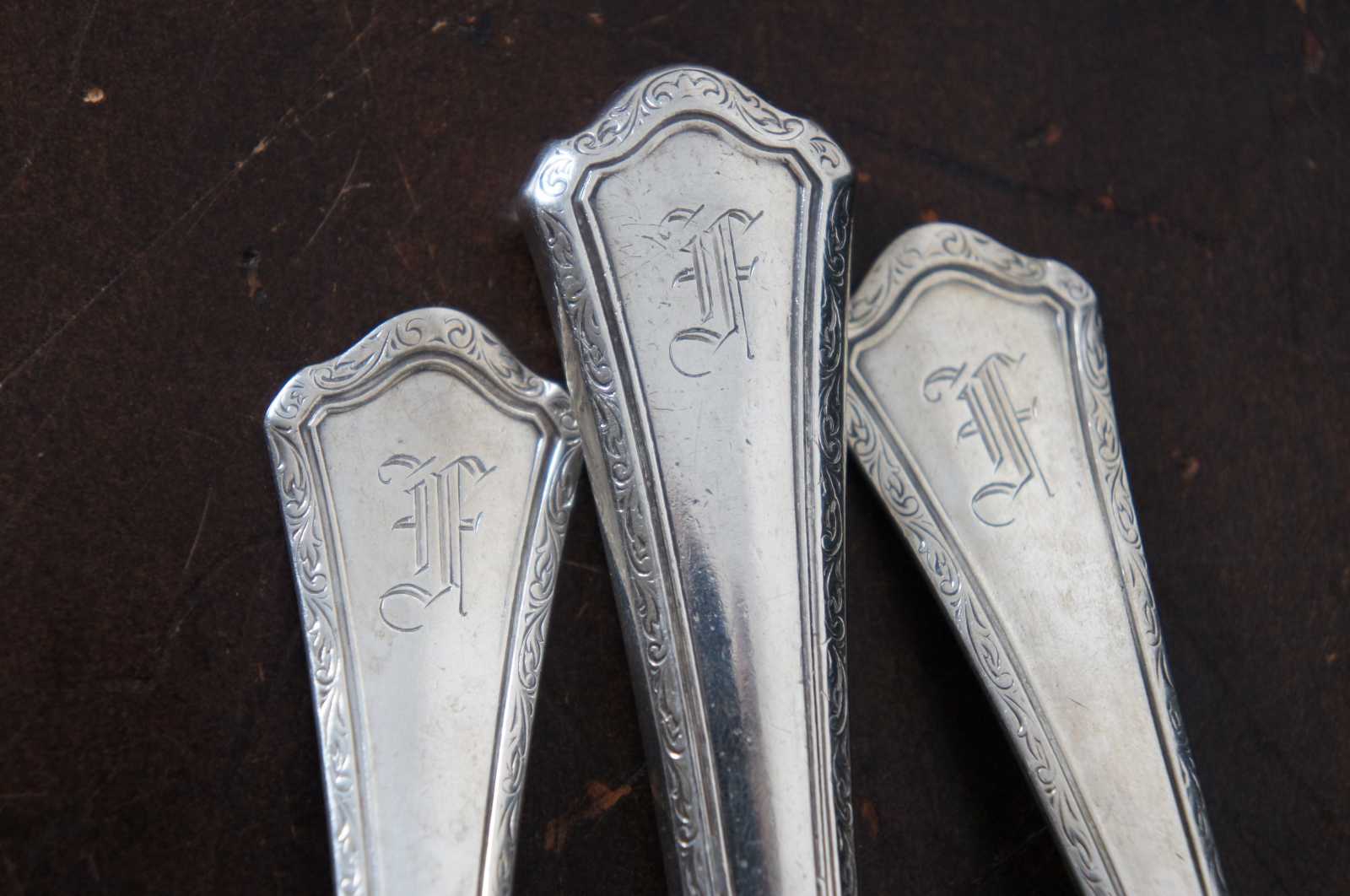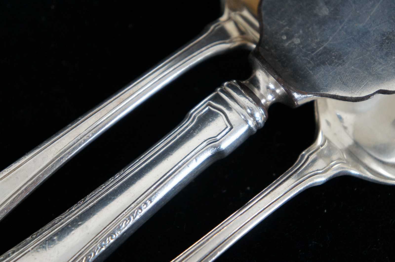 Sterling silver cake server and two serving spoons by RW&S Wallace, with an etched leaf design around the edges and monogrammed with an F.