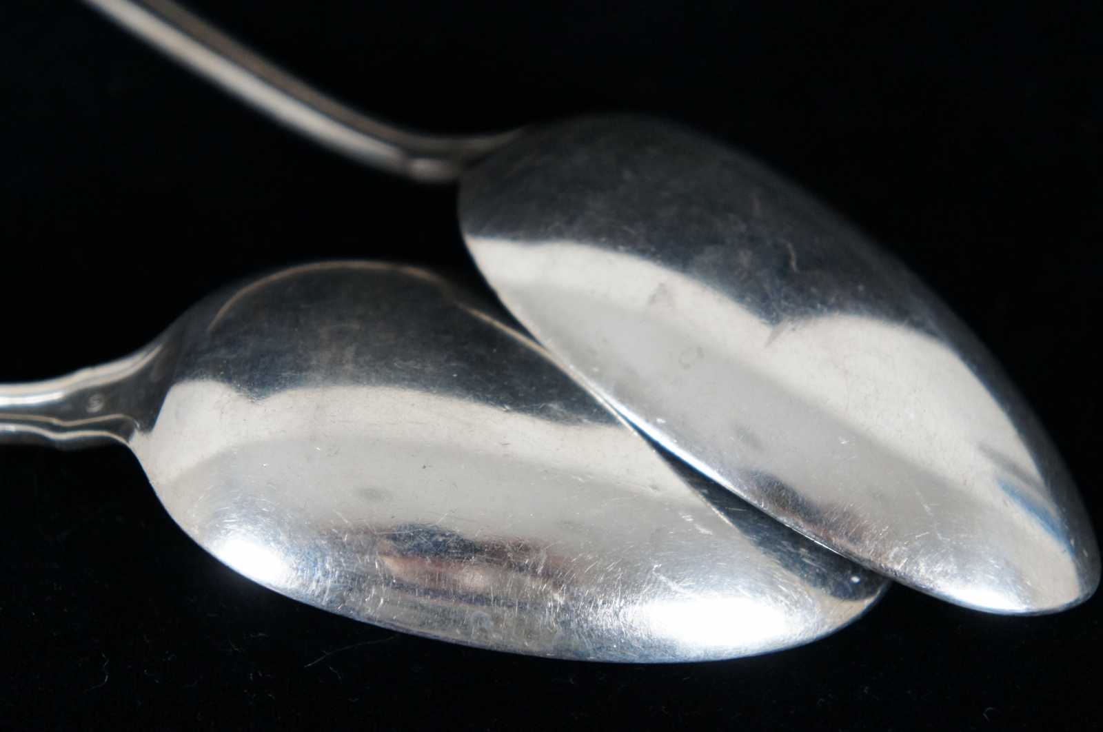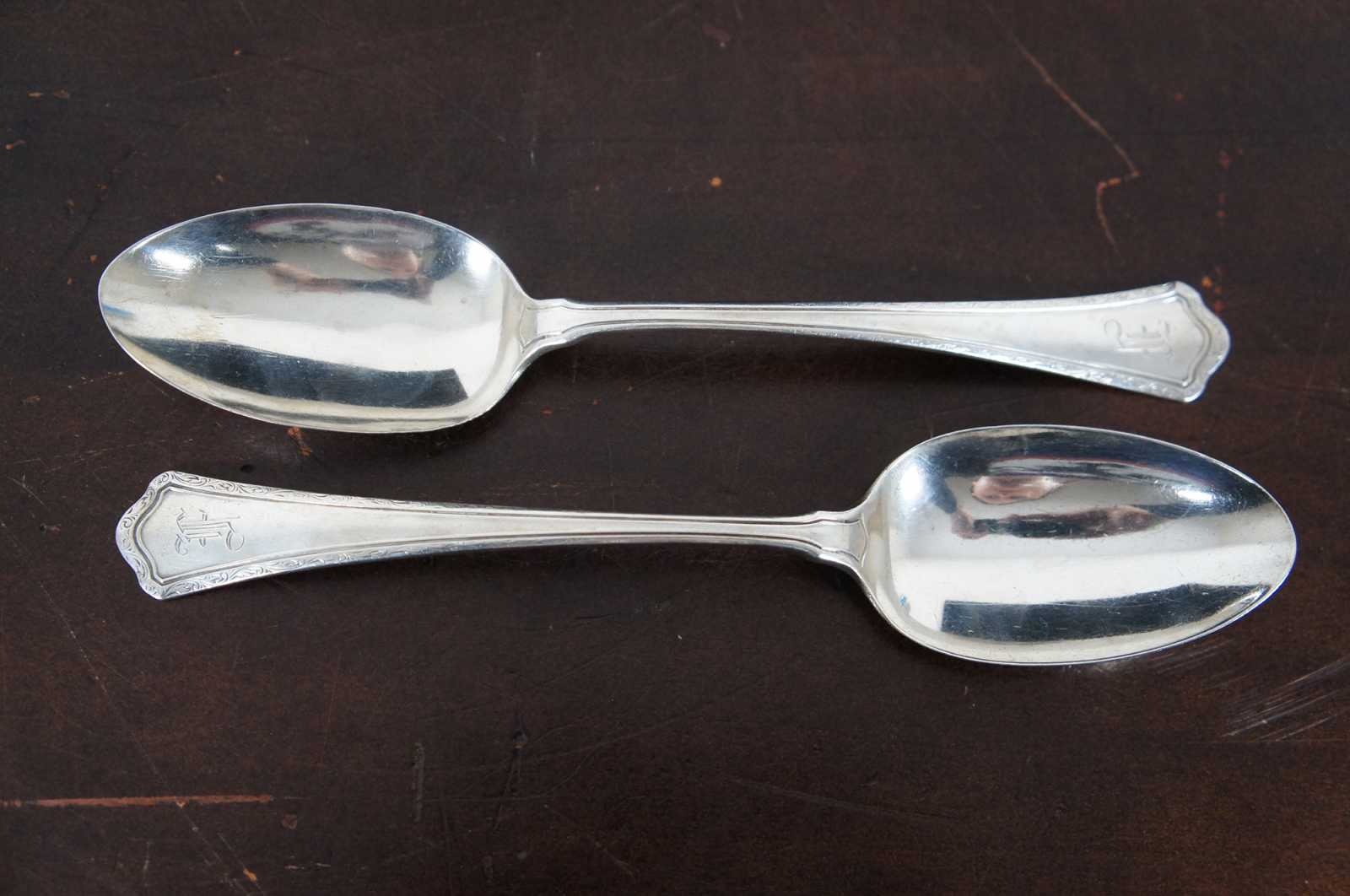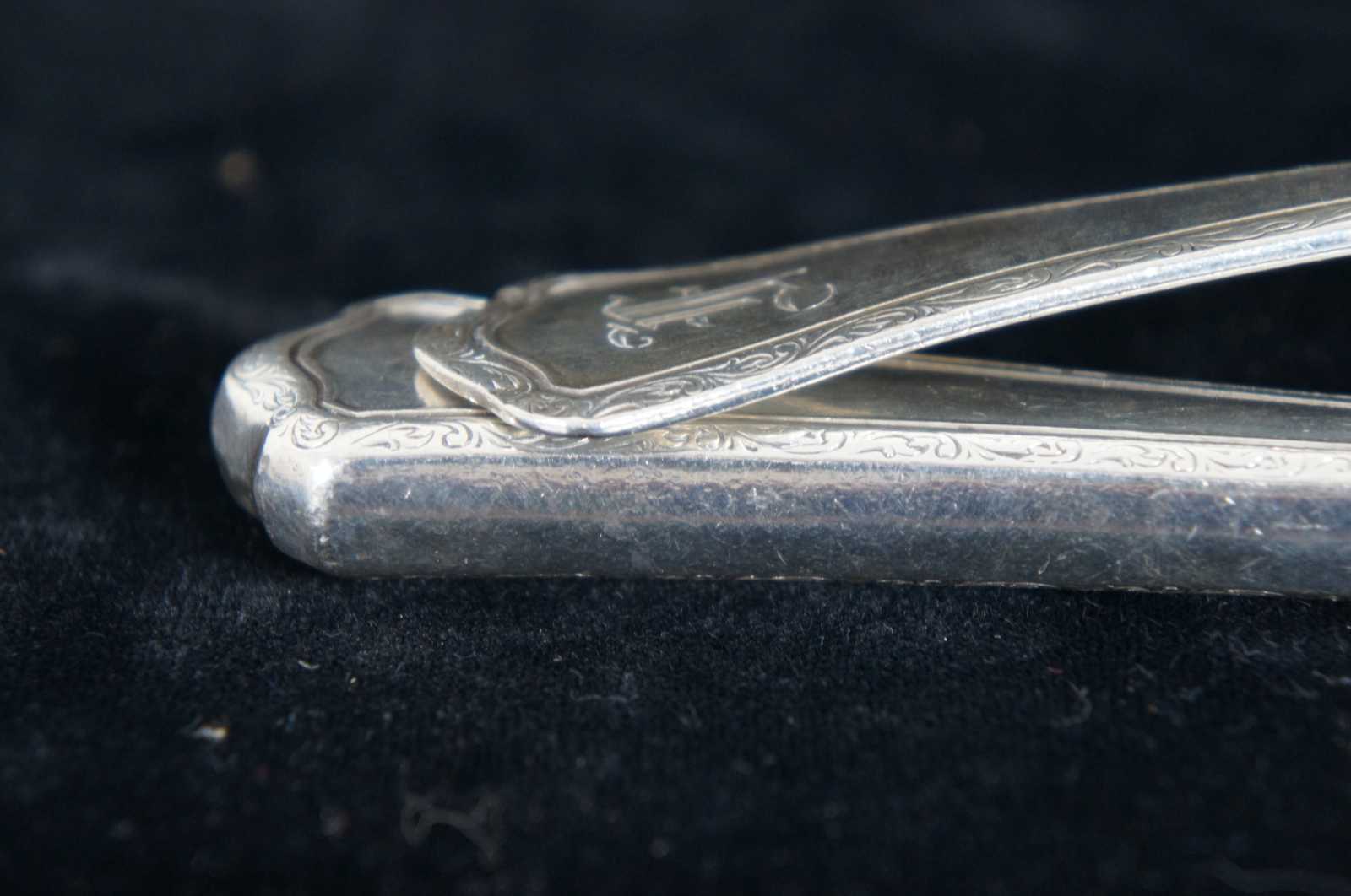 Sterling silver cake server and two serving spoons by RW&S Wallace, with an etched leaf design around the edges and monogrammed with an F.