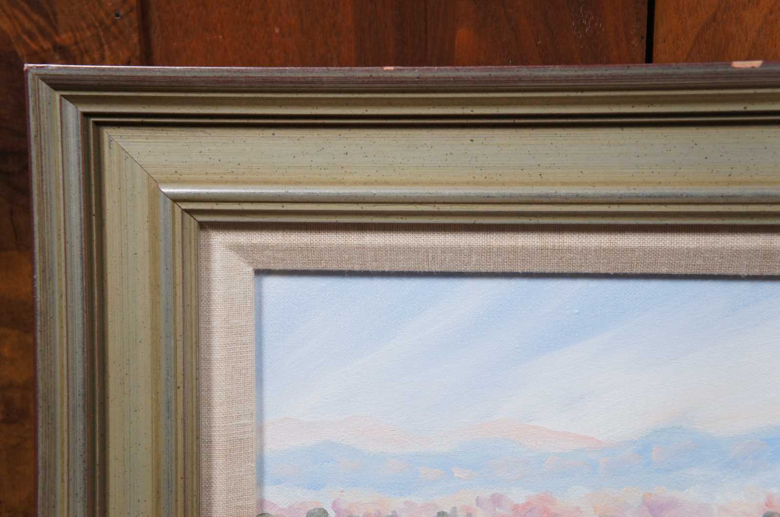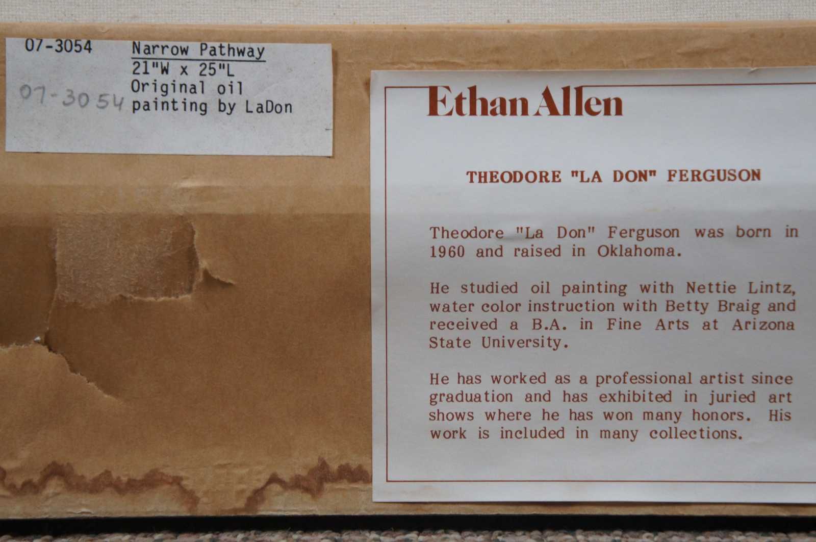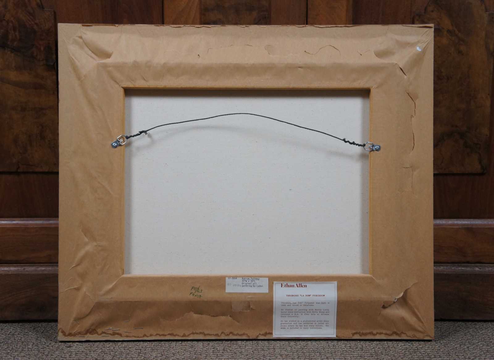 “Narrow Pathway” original oil on canvas painting by Theodore “la Don” Ferguson for Ethan Allen. Theodore “La Don” Ferguson was born in 1960 and raised in Oklahoma. He studied oil painting with Nettie Lintz, watercolor instruction with Betty Braig and received a B.A. in Fine Arts at Arizona State University. He has worked as a professional artist since graduation and has exhibited in juried art shows where he has won many honors. His work is included in many collections.