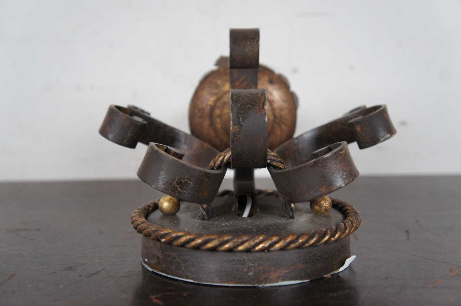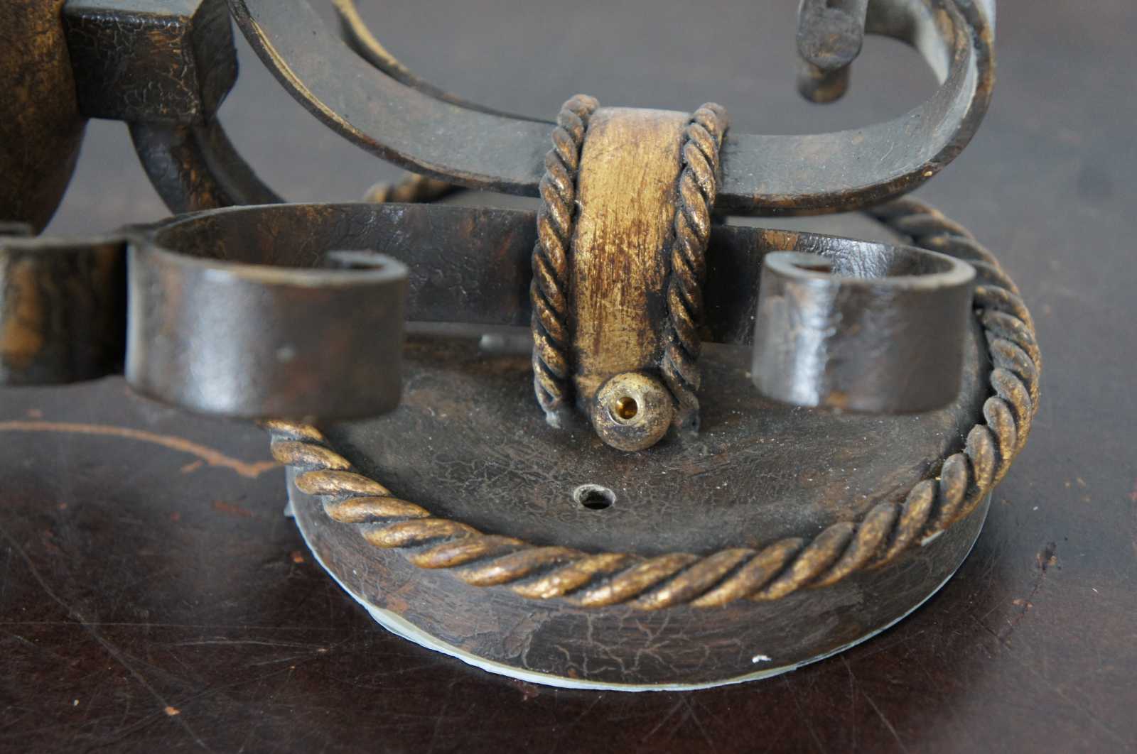 Pair of gilded and antiqued bronze Spanish Revival candlestick wall sconces with shades.