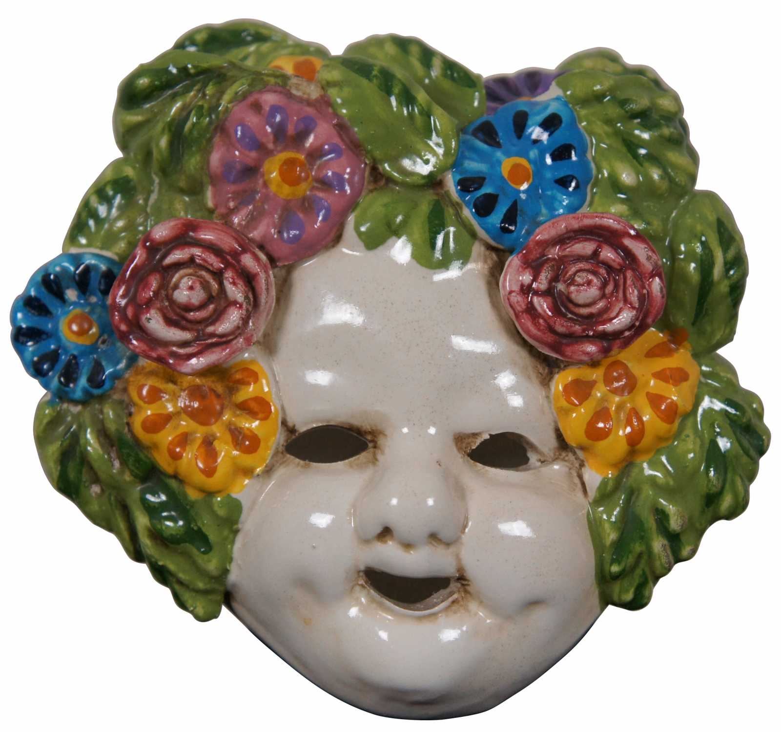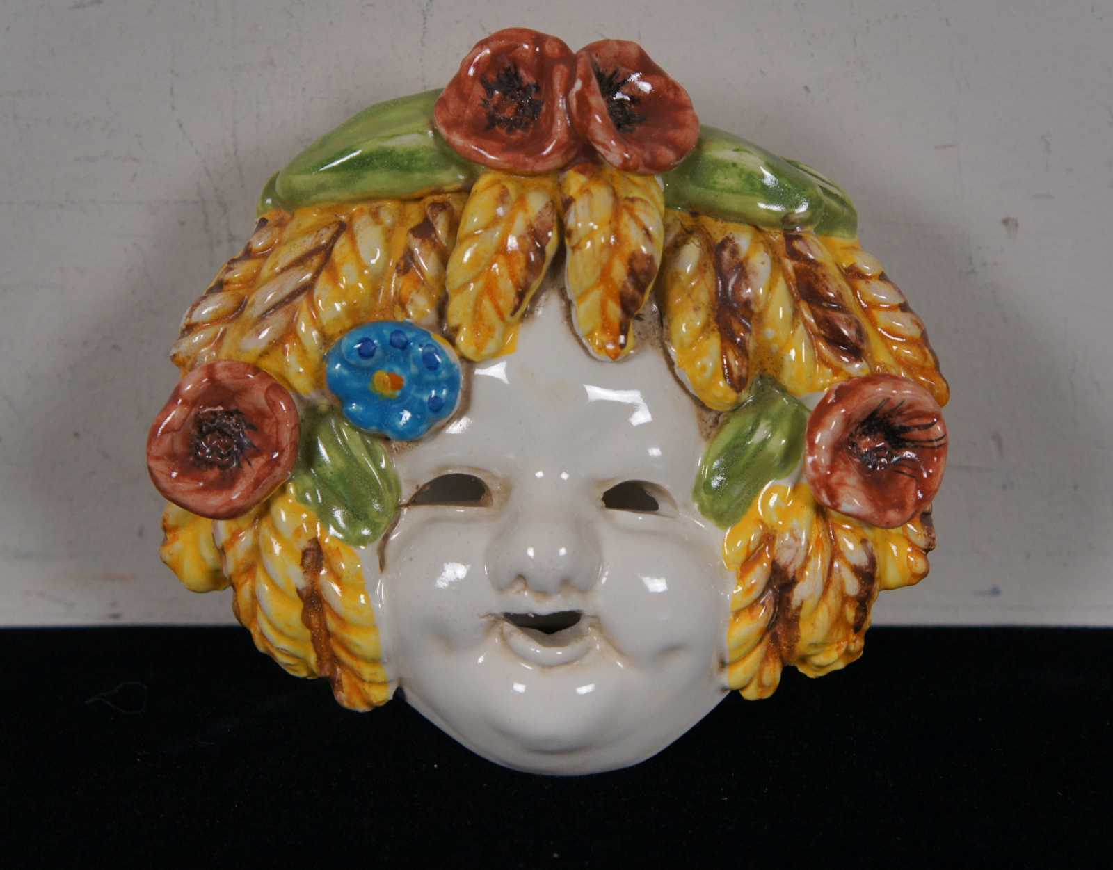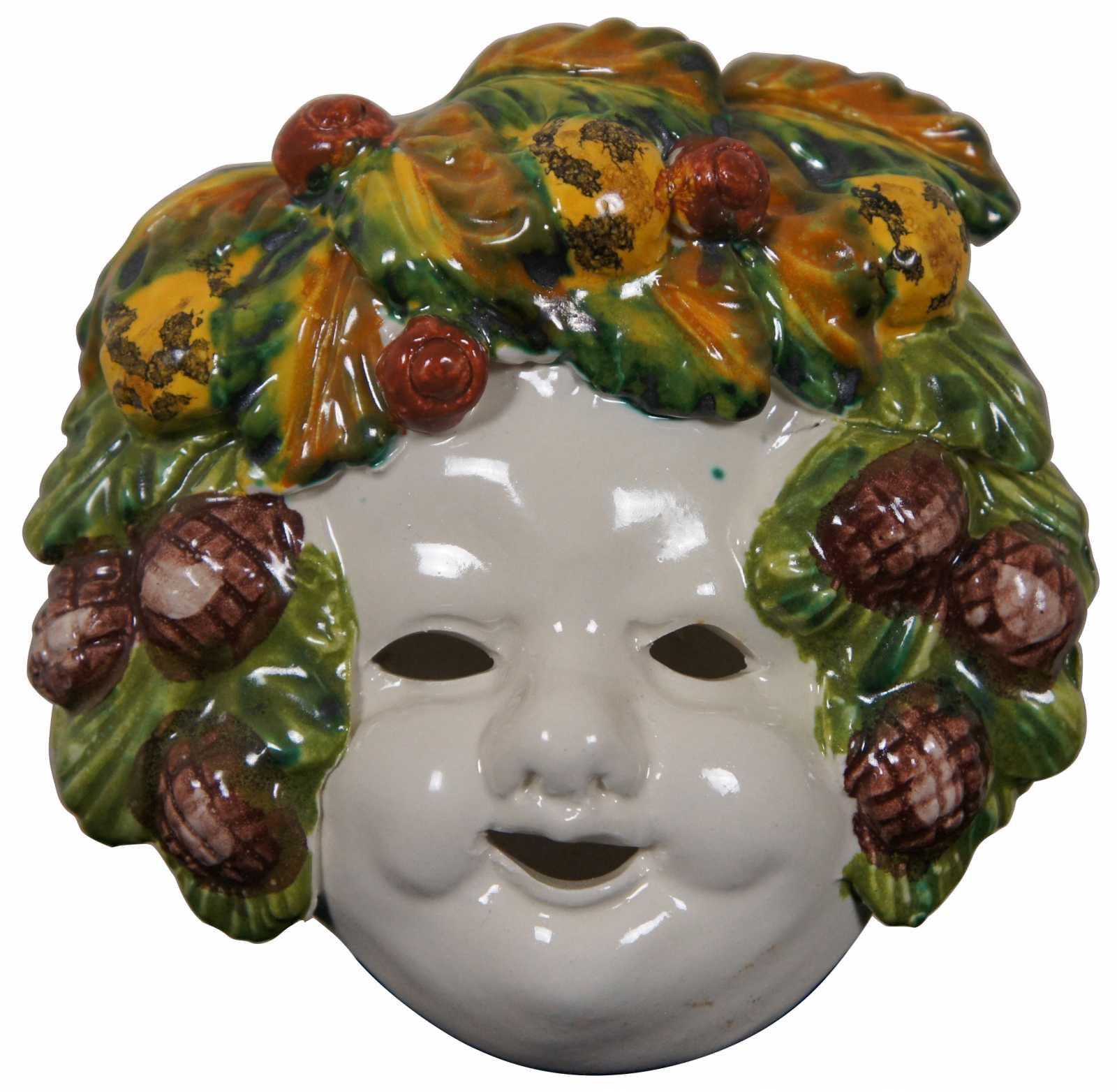 Set of three Italian majolica ceramic wall hanging masks in the shape of children’s or cherub’s faces with hair fashioned from flowers and fruit relating to different seasons of the year.
