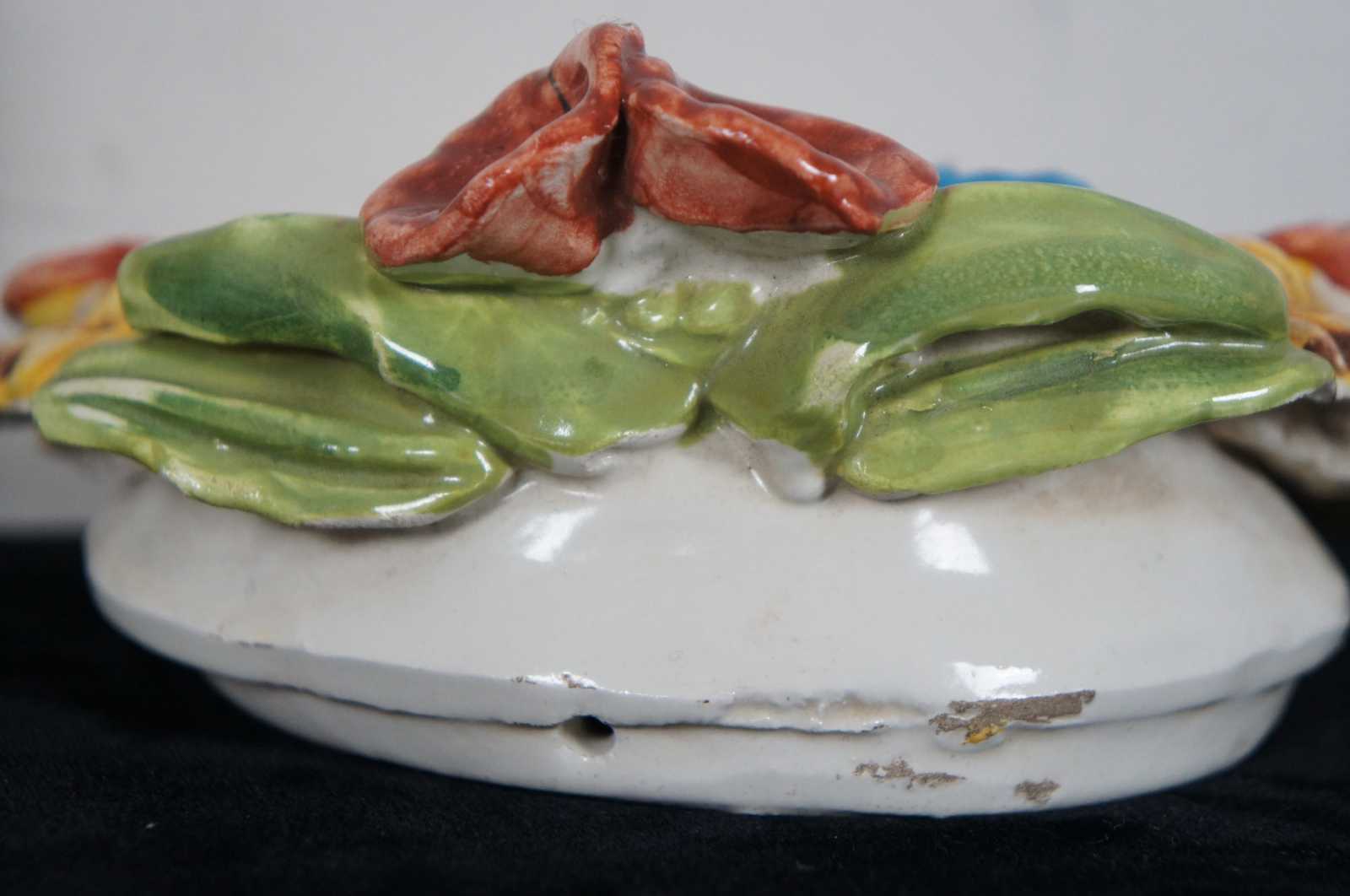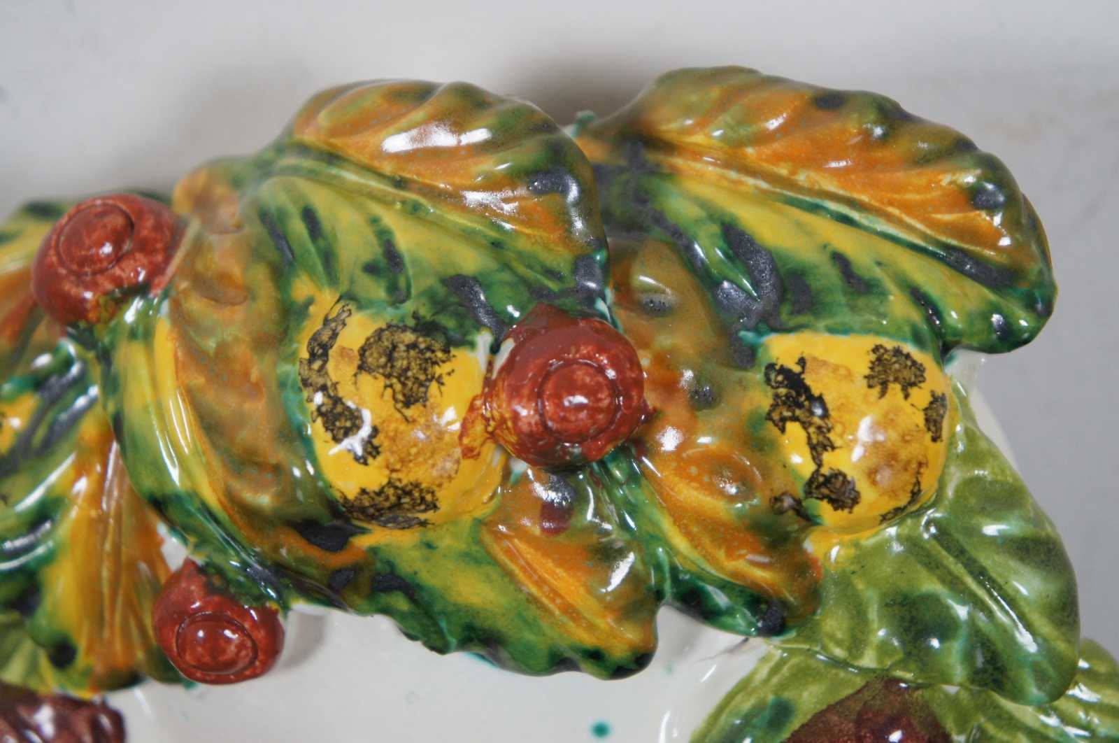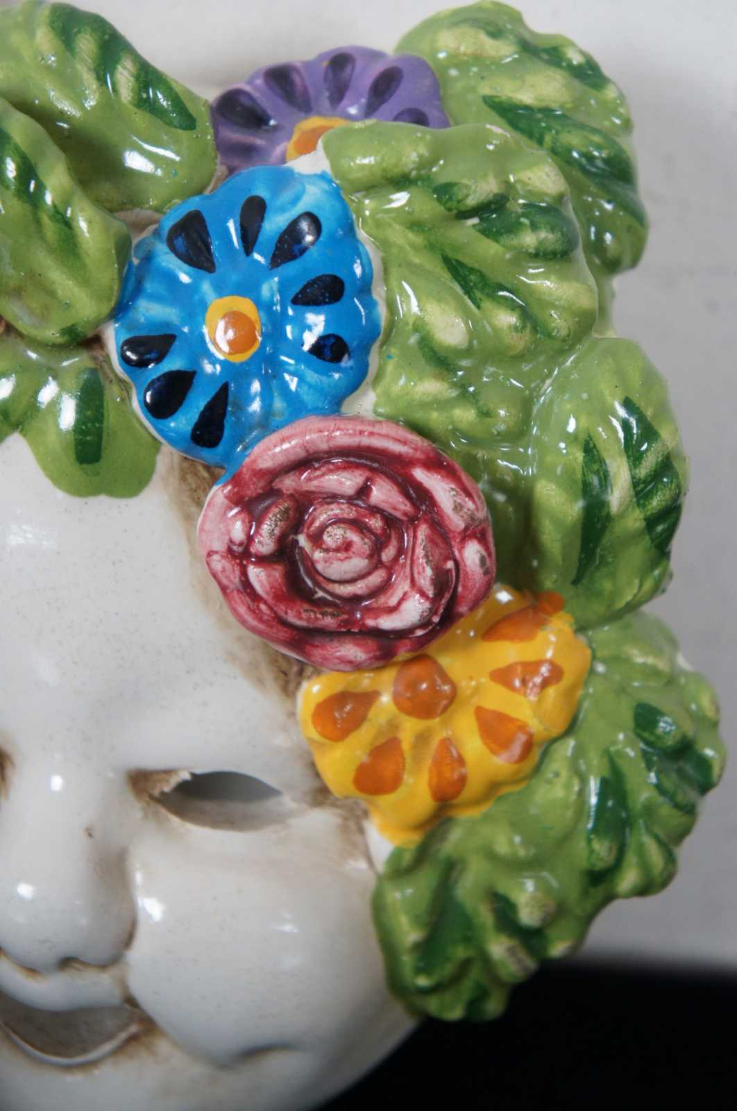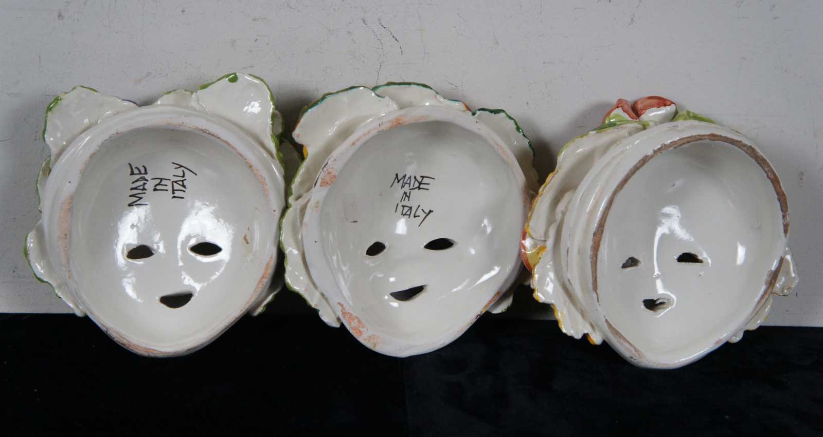 Set of three Italian majolica ceramic wall hanging masks in the shape of children’s or cherub’s faces with hair fashioned from flowers and fruit relating to different seasons of the year.
