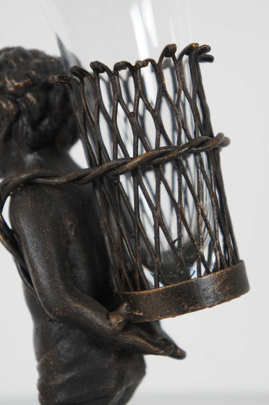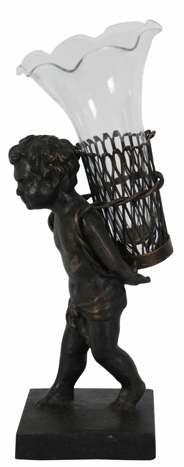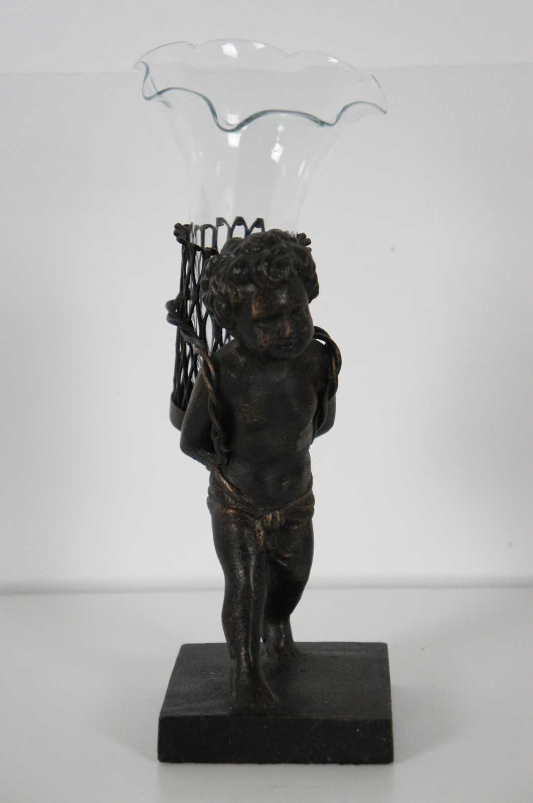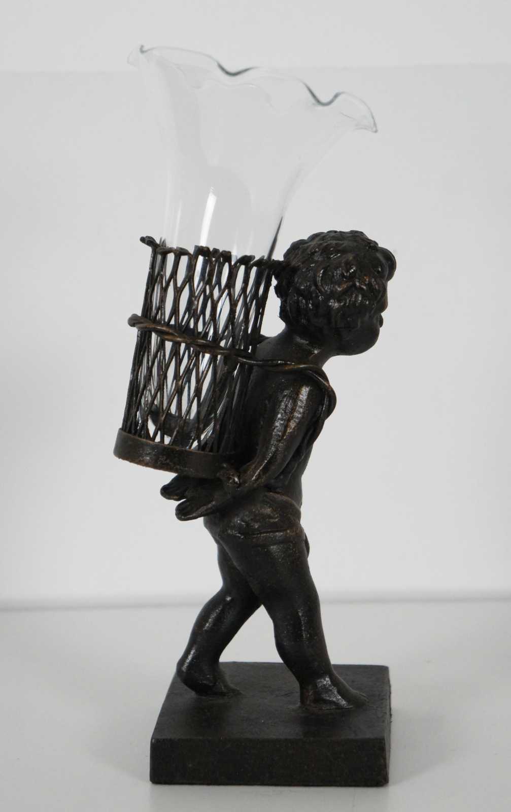 Contemporary bronze figurine of a child walking with a basket containing a ruffled edge glass bud vase.
