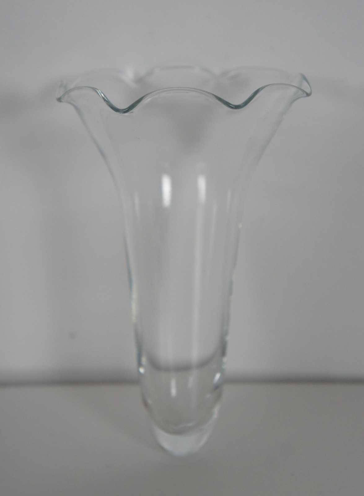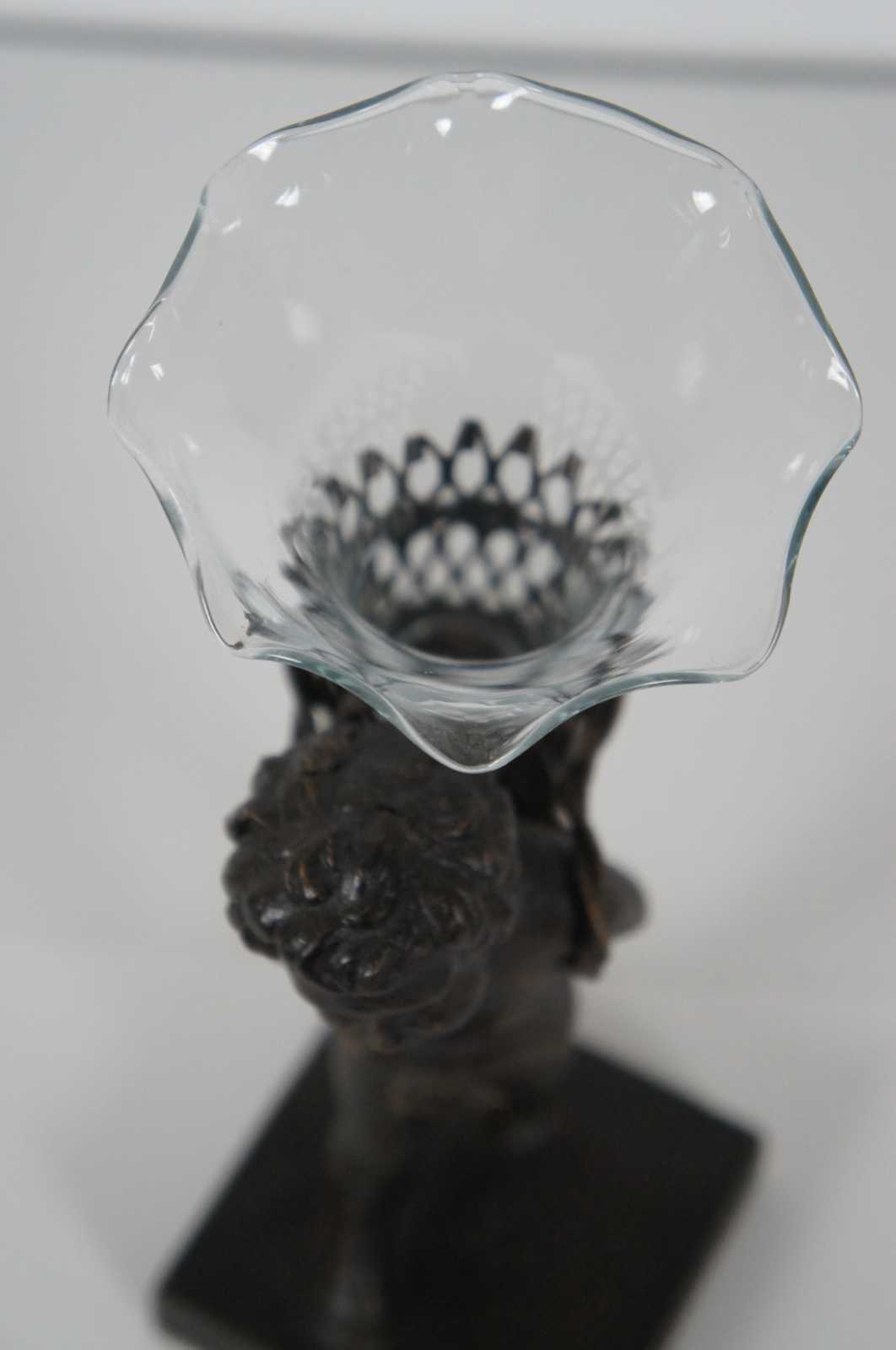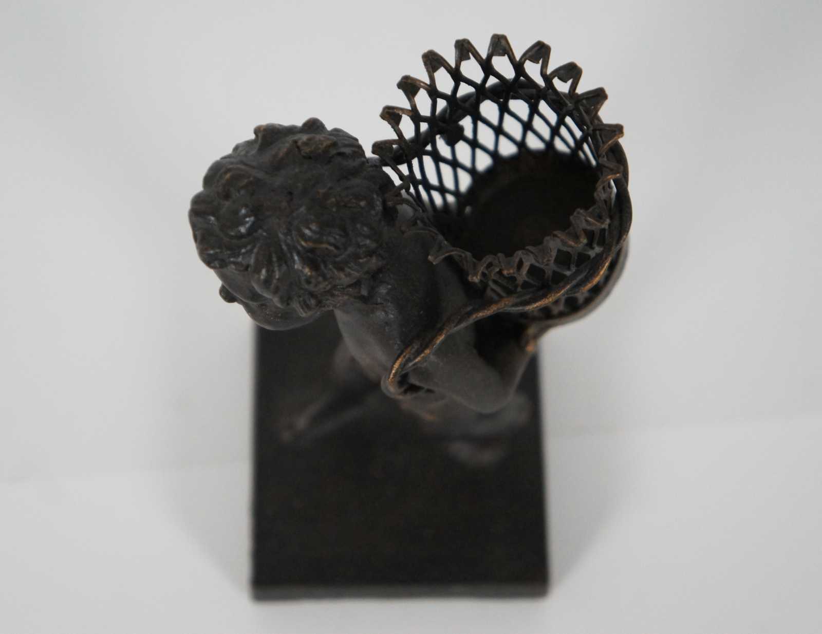 Contemporary bronze figurine of a child walking with a basket containing a ruffled edge glass bud vase.