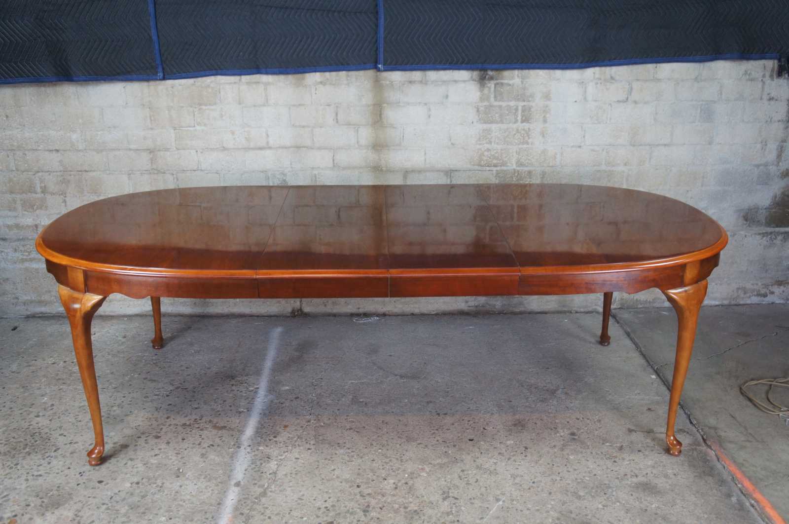 Vintage Stanley Furniture dining table. Made of solid cherry featuring an oval shape with two leaves and slipper feet.