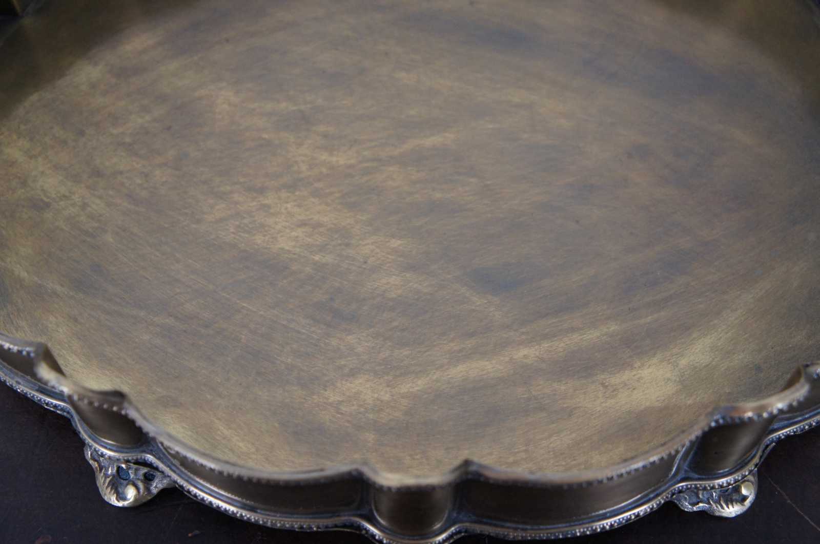 Indian brass serving tray with scalloped edges, raised gallery sides with beaded border, and scalloped feet and handles.