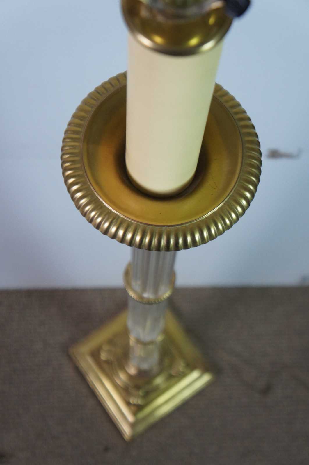 Vintage floor lamp featuring Neoclassical . Hollywood Regency styling with three glass columns on a brass base with candlestick top and finial in the shape of a hand holding a wreath. Made in Japan.